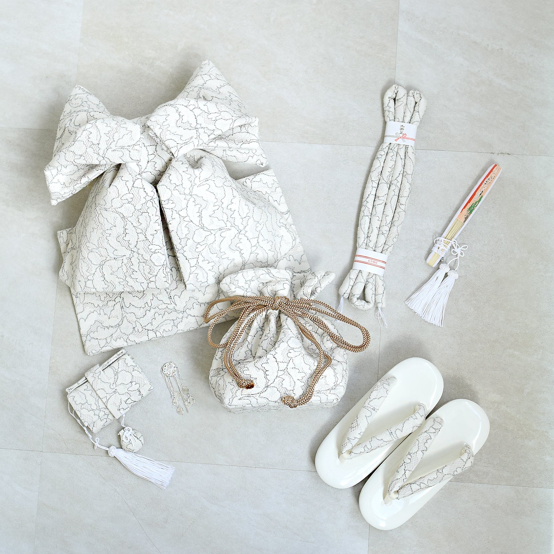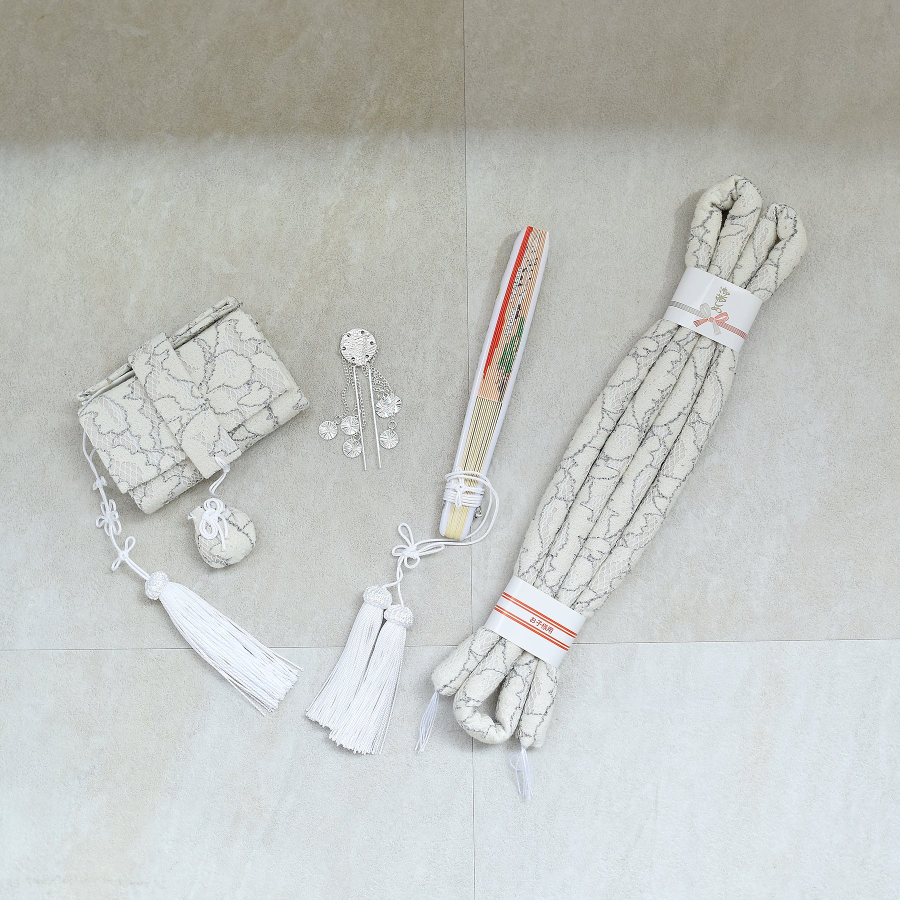 着付けがしやすい結び帯(作り帯)と、晴れの日を彩る筥迫・扇子・帯締め(丸ぐけ)など必要なものが揃っています。