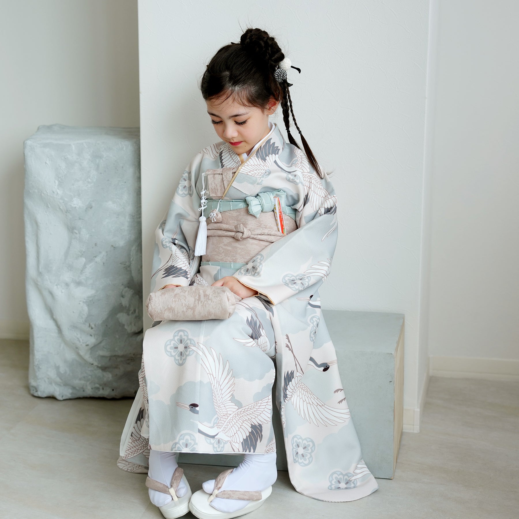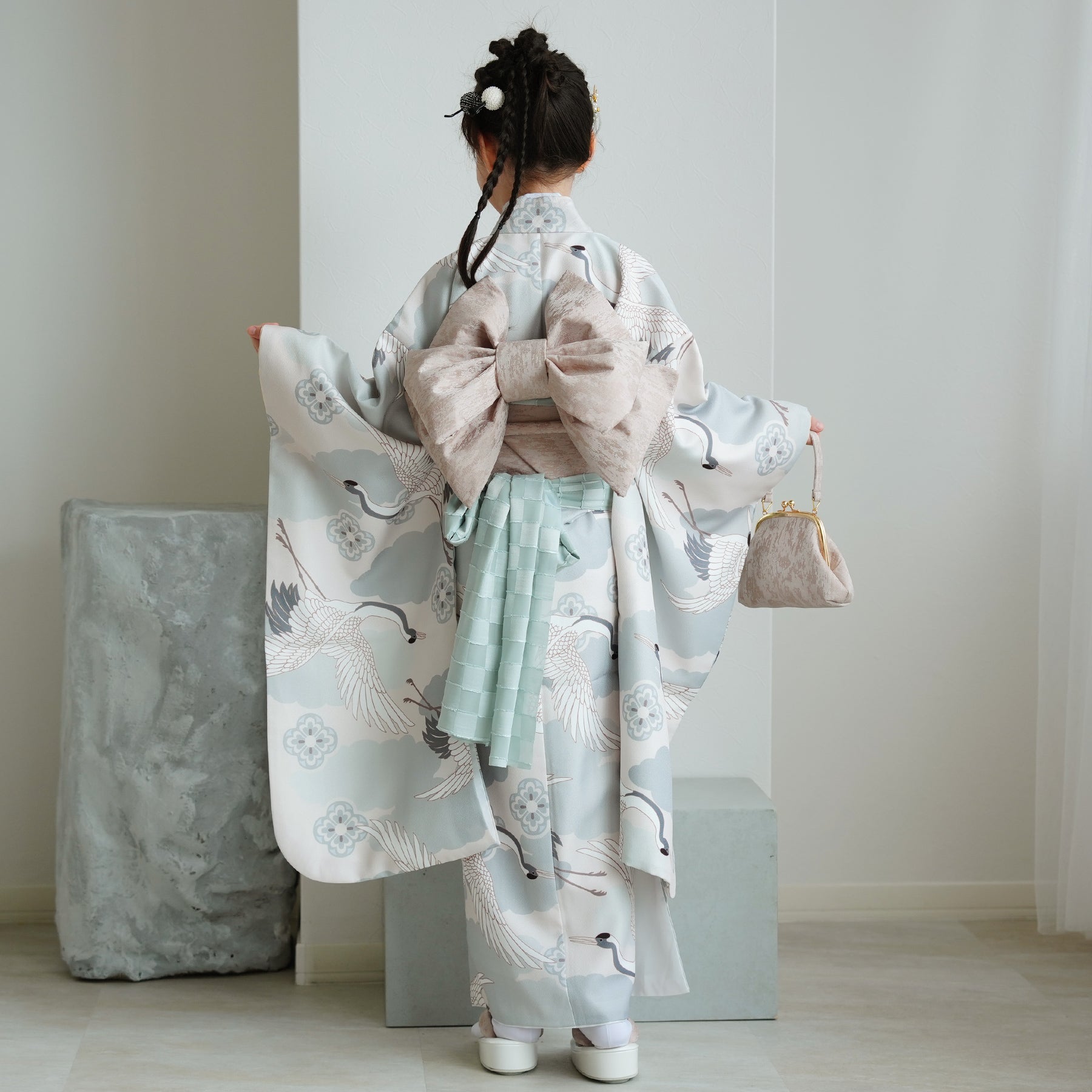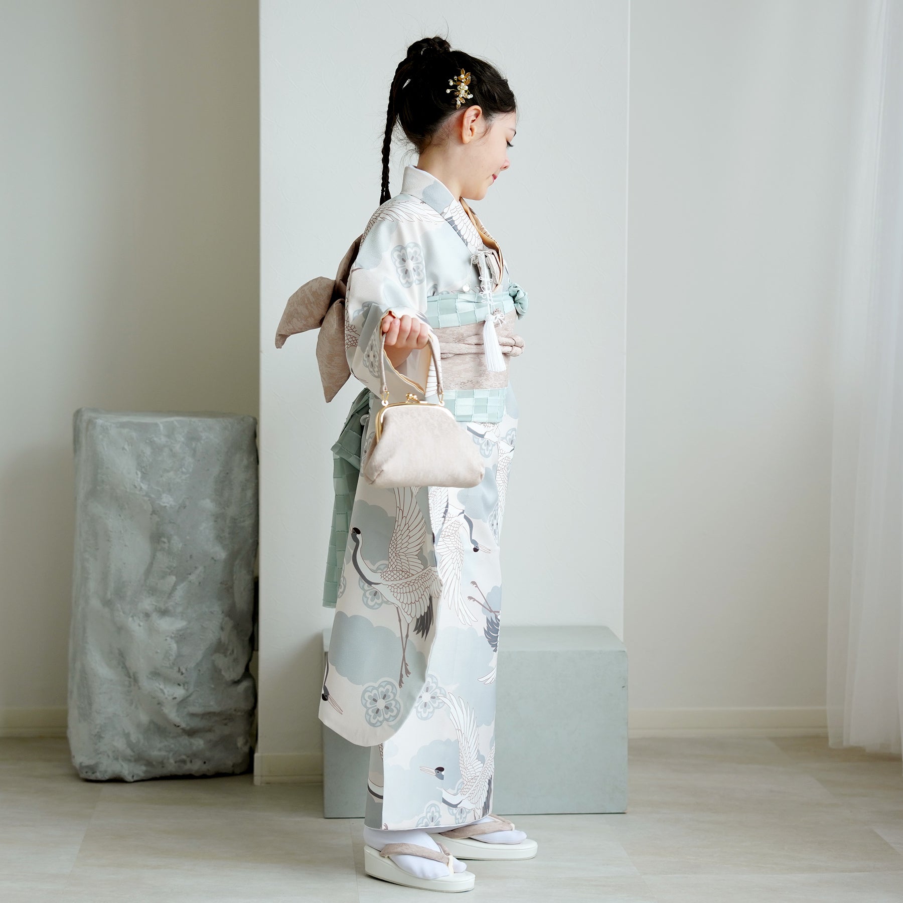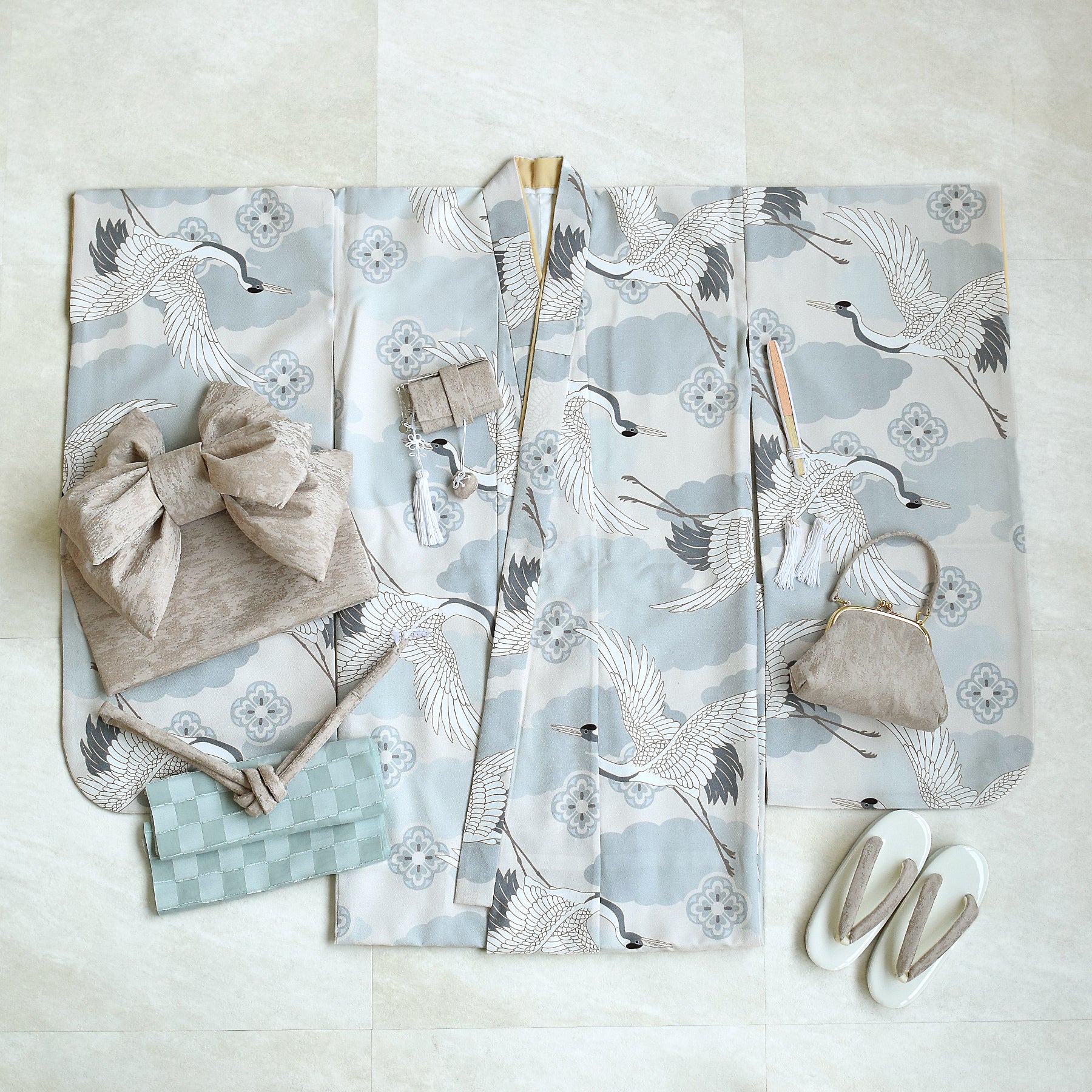 着物(重ね襟縫いつけ済み)・作り帯・帯揚げ・帯締め・志古貴・ハコセコ・草履・バッグ・半衿付き長襦袢・びら簪・足袋