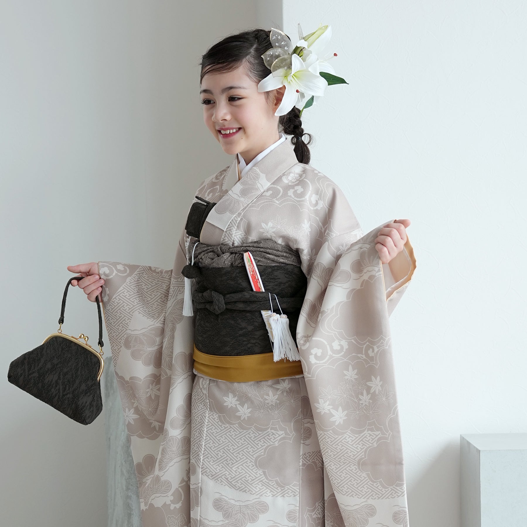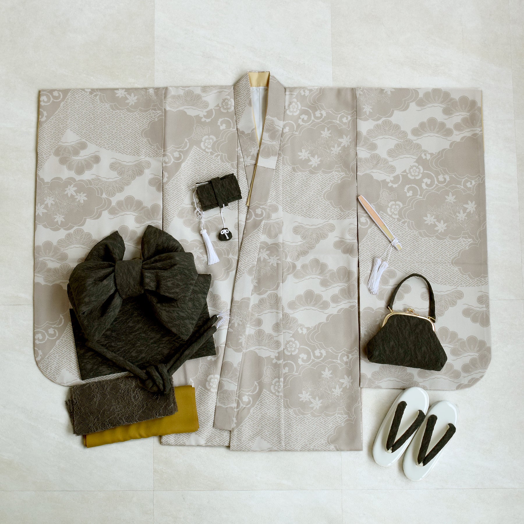 着物(重ね襟縫いつけ済み)・作り帯・帯揚げ・帯締め・志古貴・ハコセコ・草履・バッグ・半衿付き長襦袢・びら簪・足袋