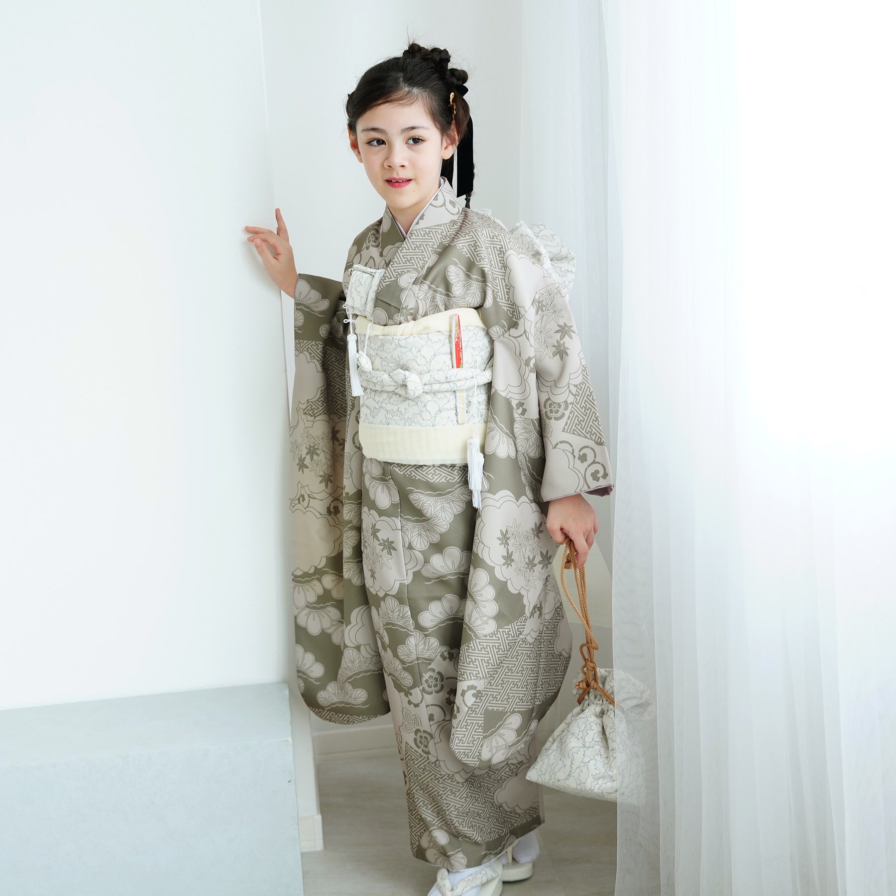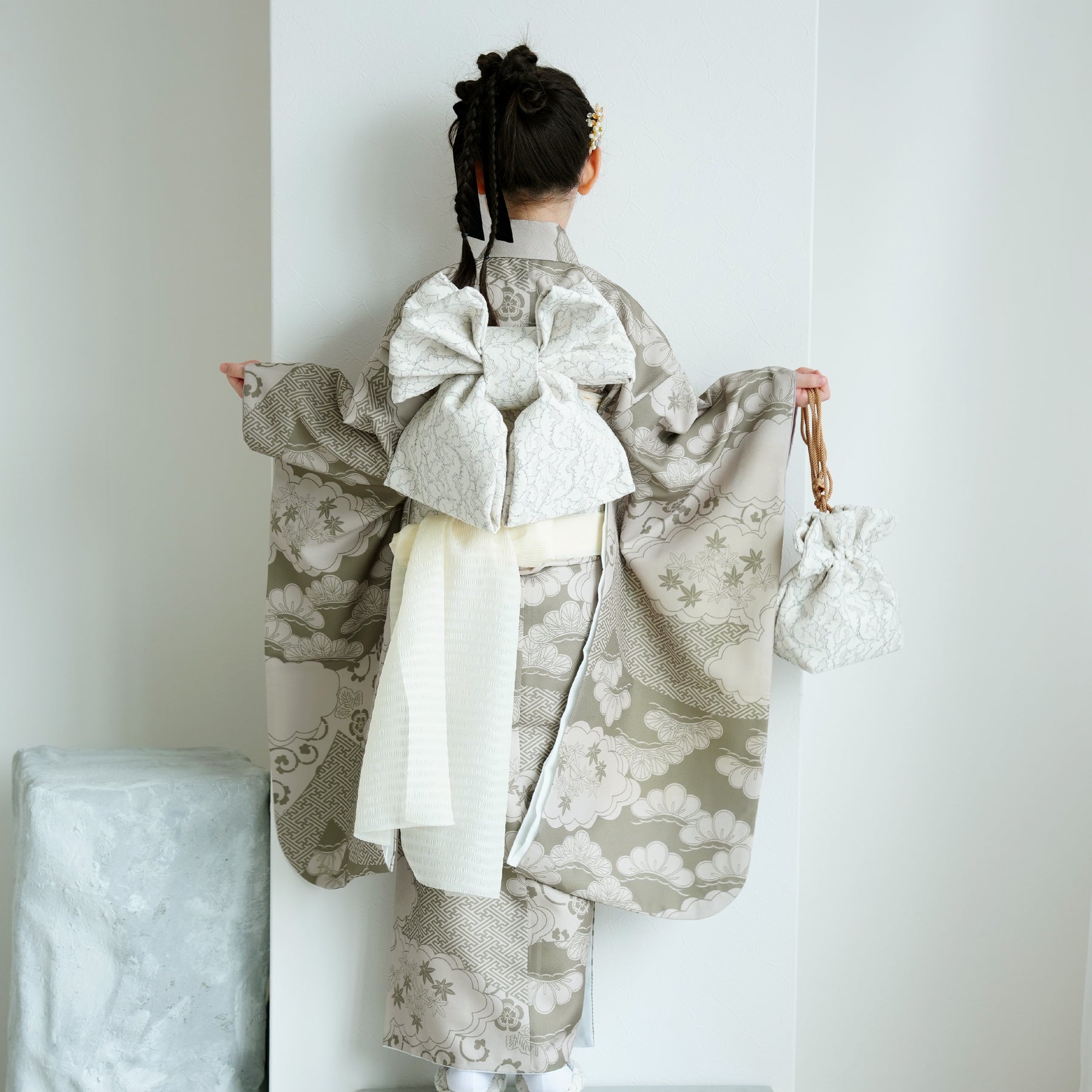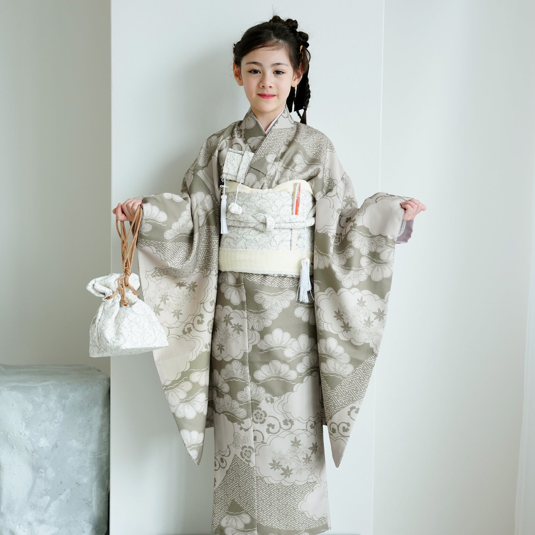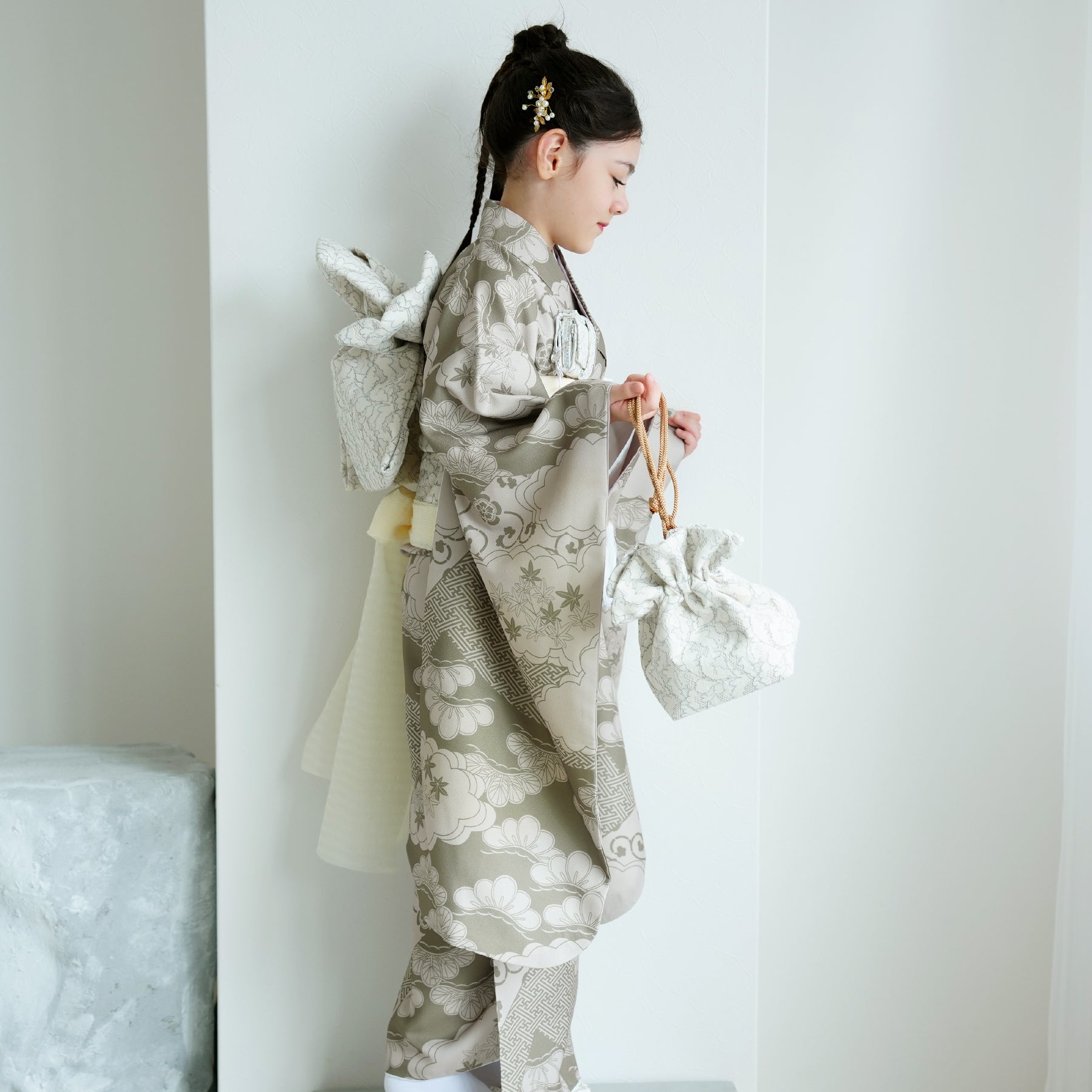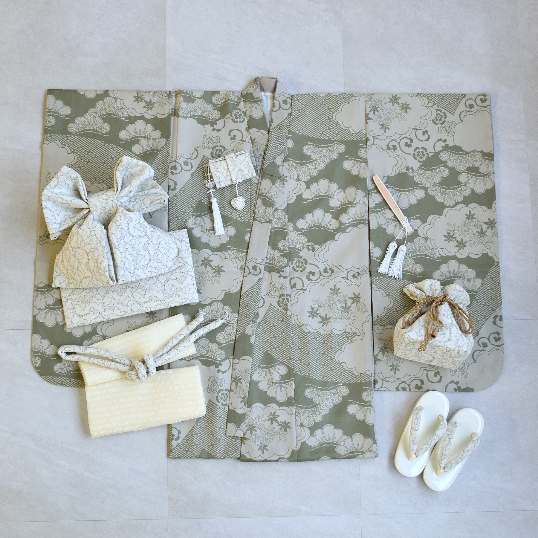 着物(重ね襟縫いつけ済み)・作り帯・帯揚げ・帯締め・志古貴・ハコセコ・草履・バッグ・半衿付き長襦袢・びら簪・足袋