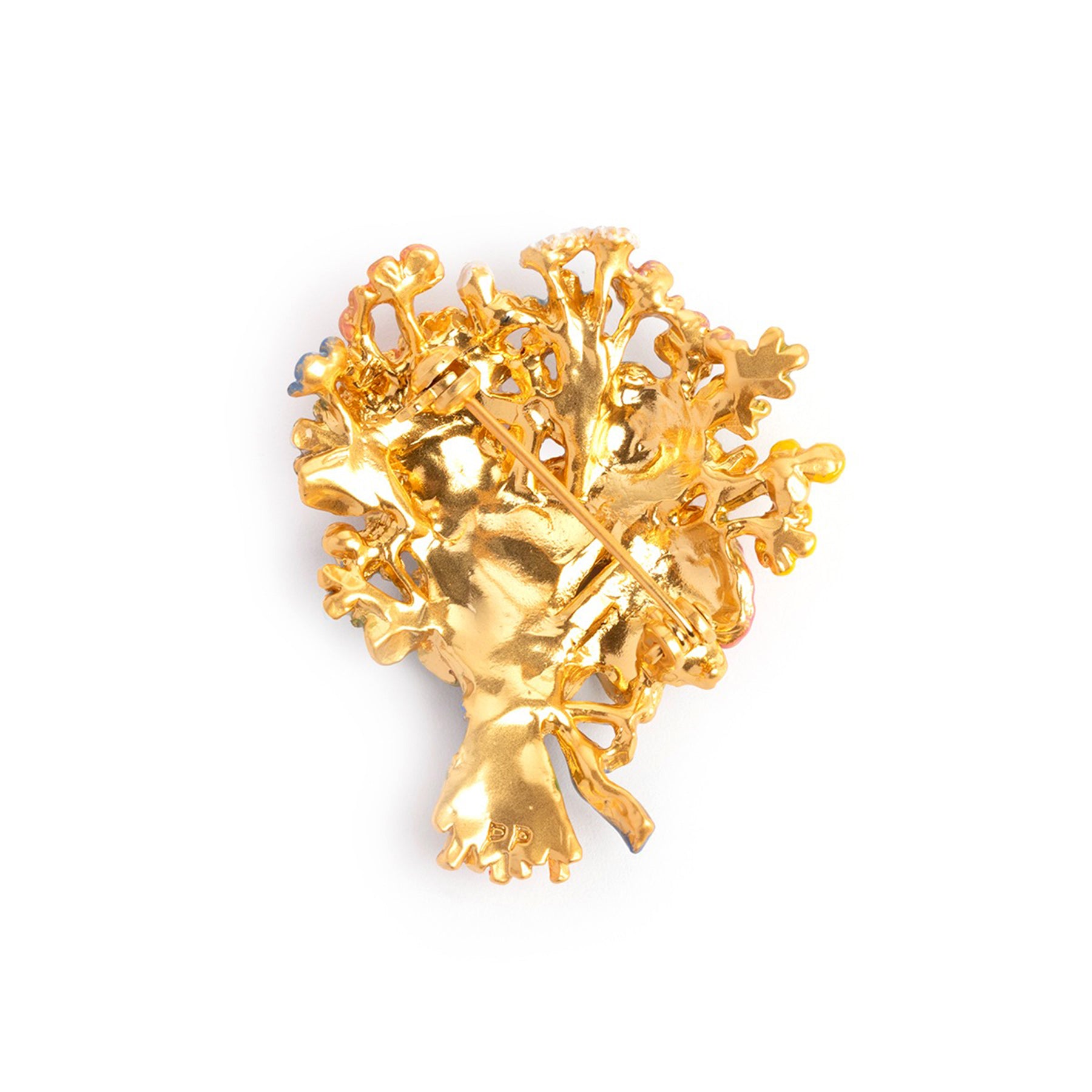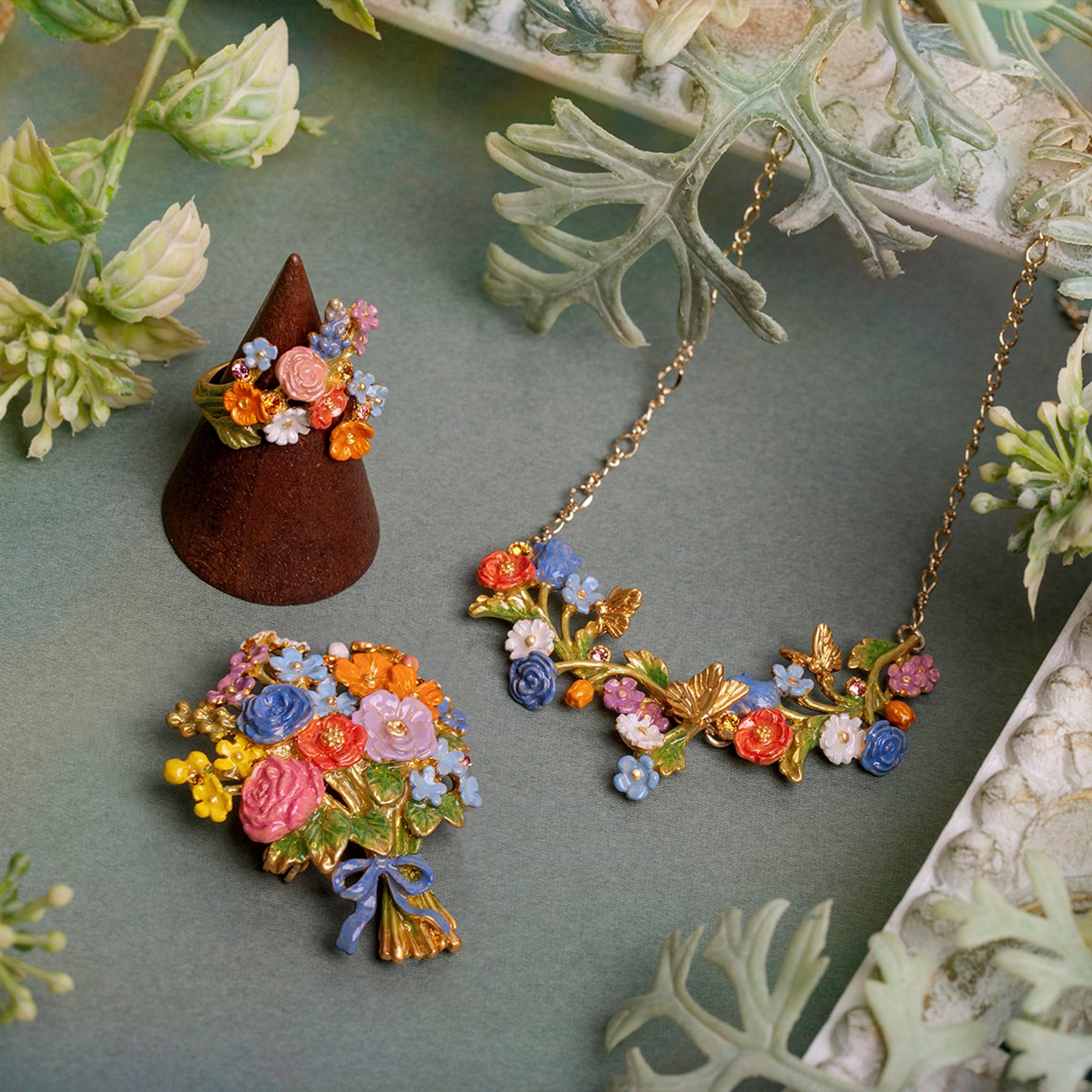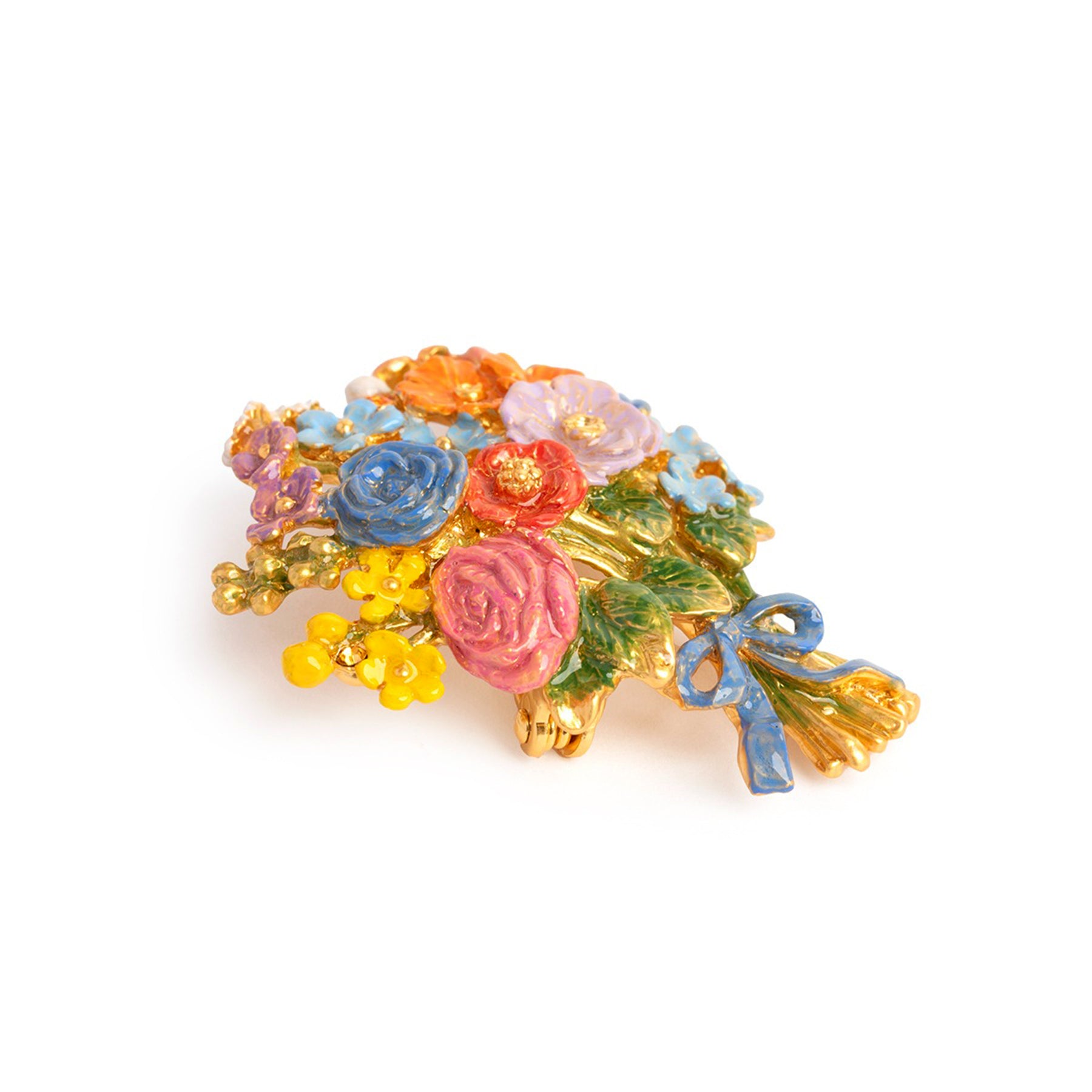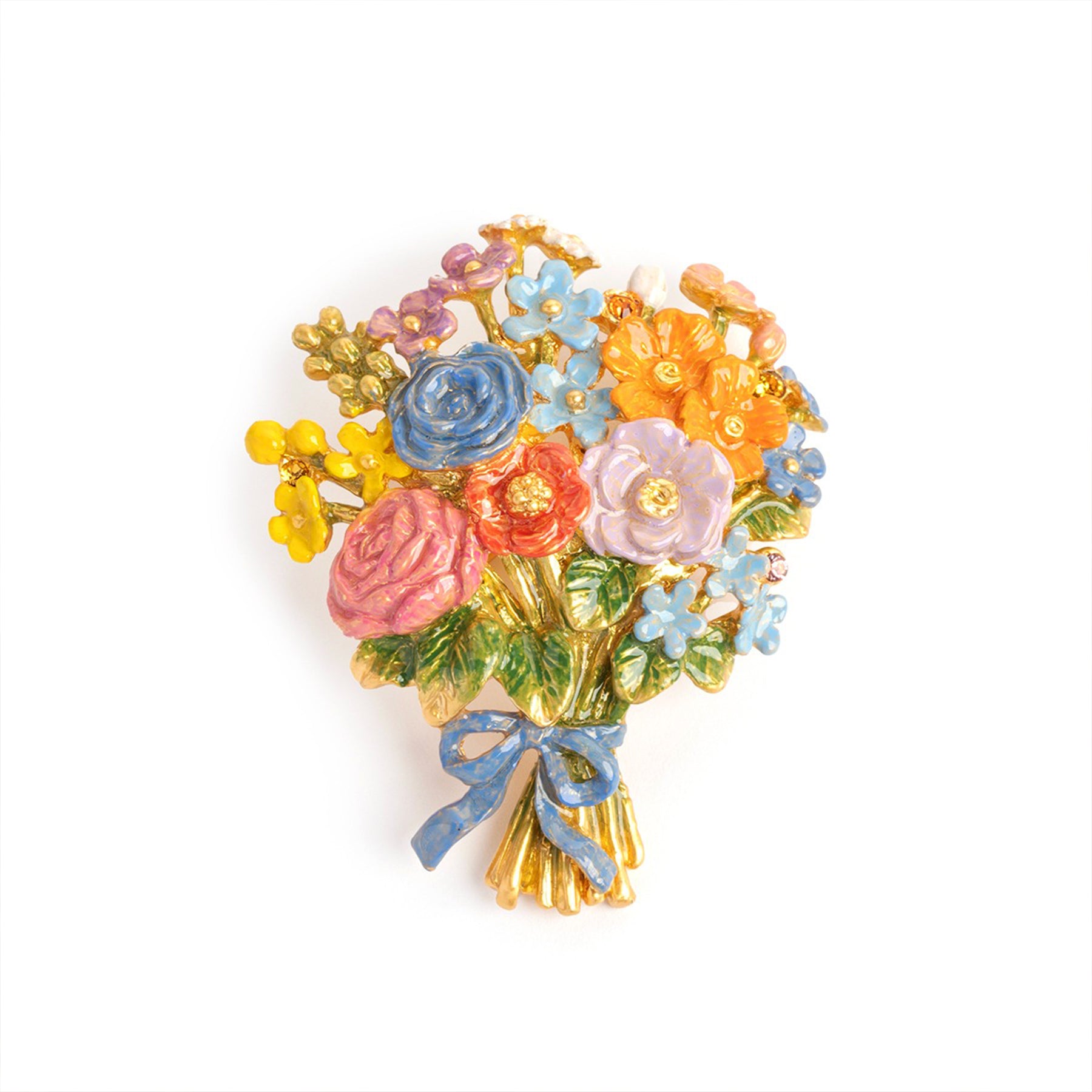 色とりどりの花々が咲き誇る庭の情景をブーケに仕立て、ブルーのリボンで束ねた華やかなブローチ。