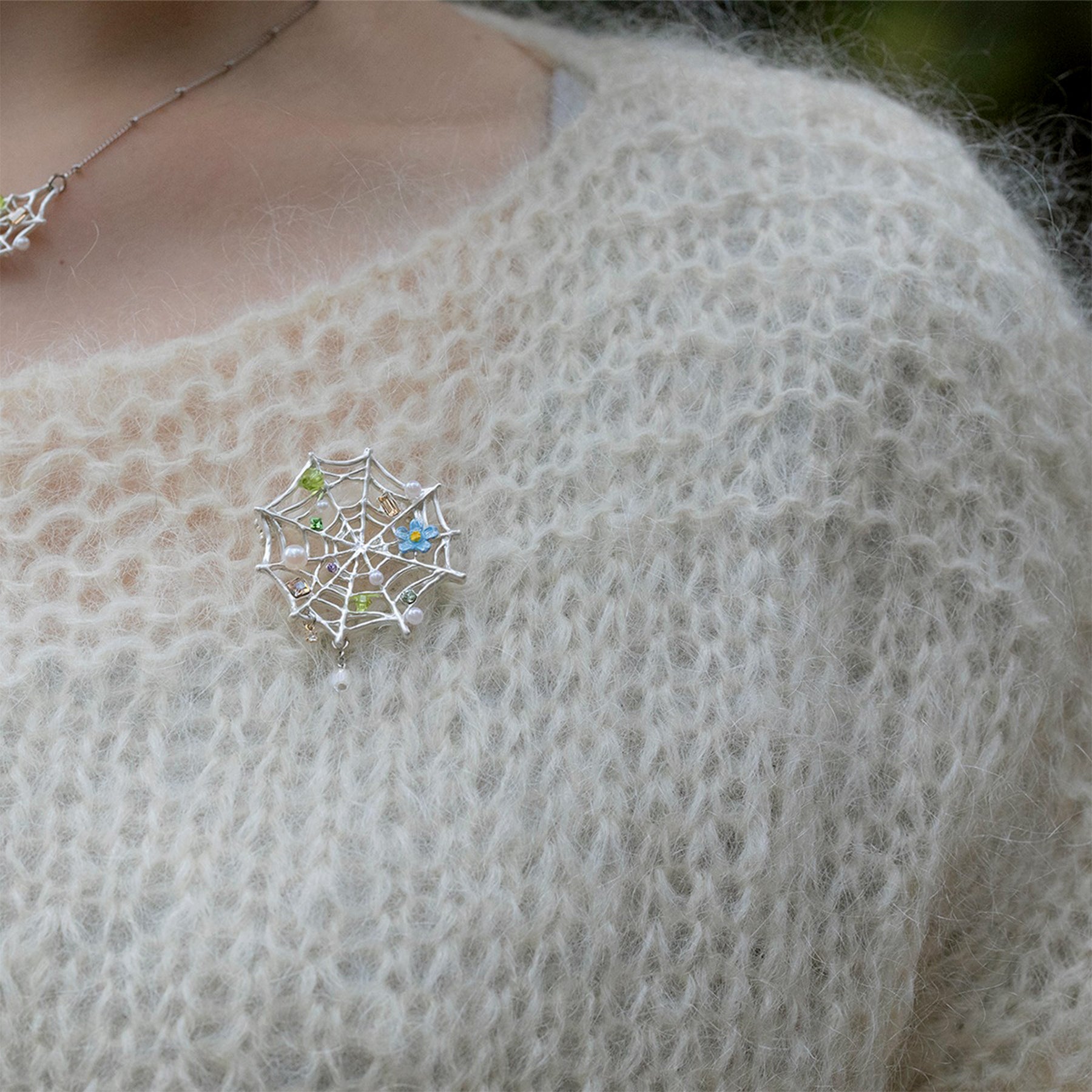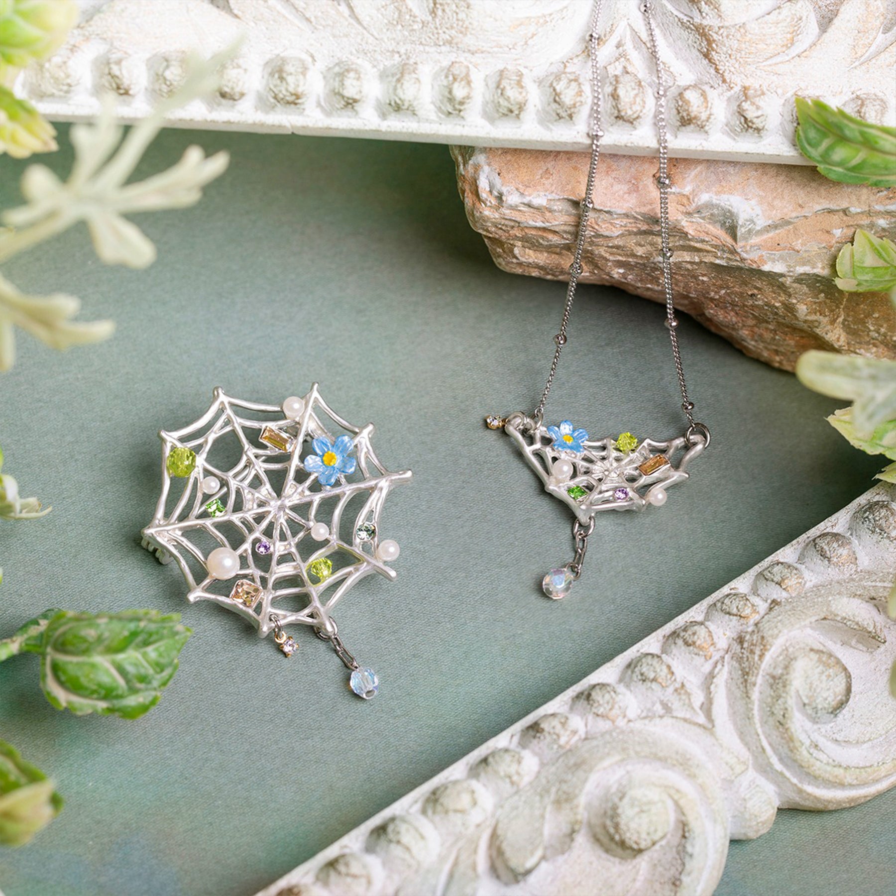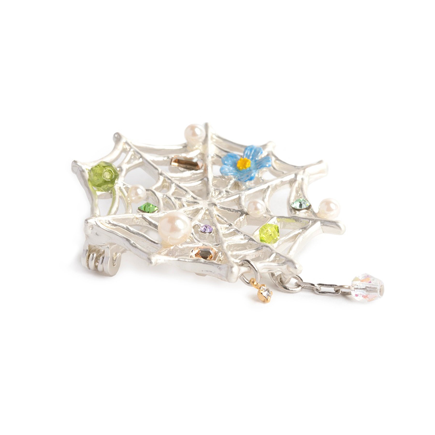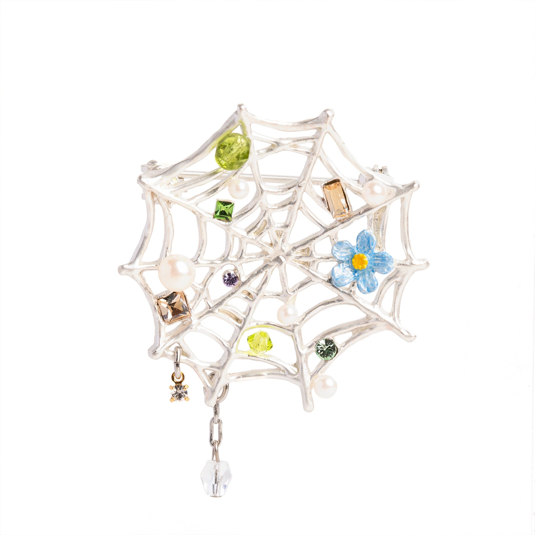 華やかに飾り付けられた、くもの巣をモチーフにしたブローチ。