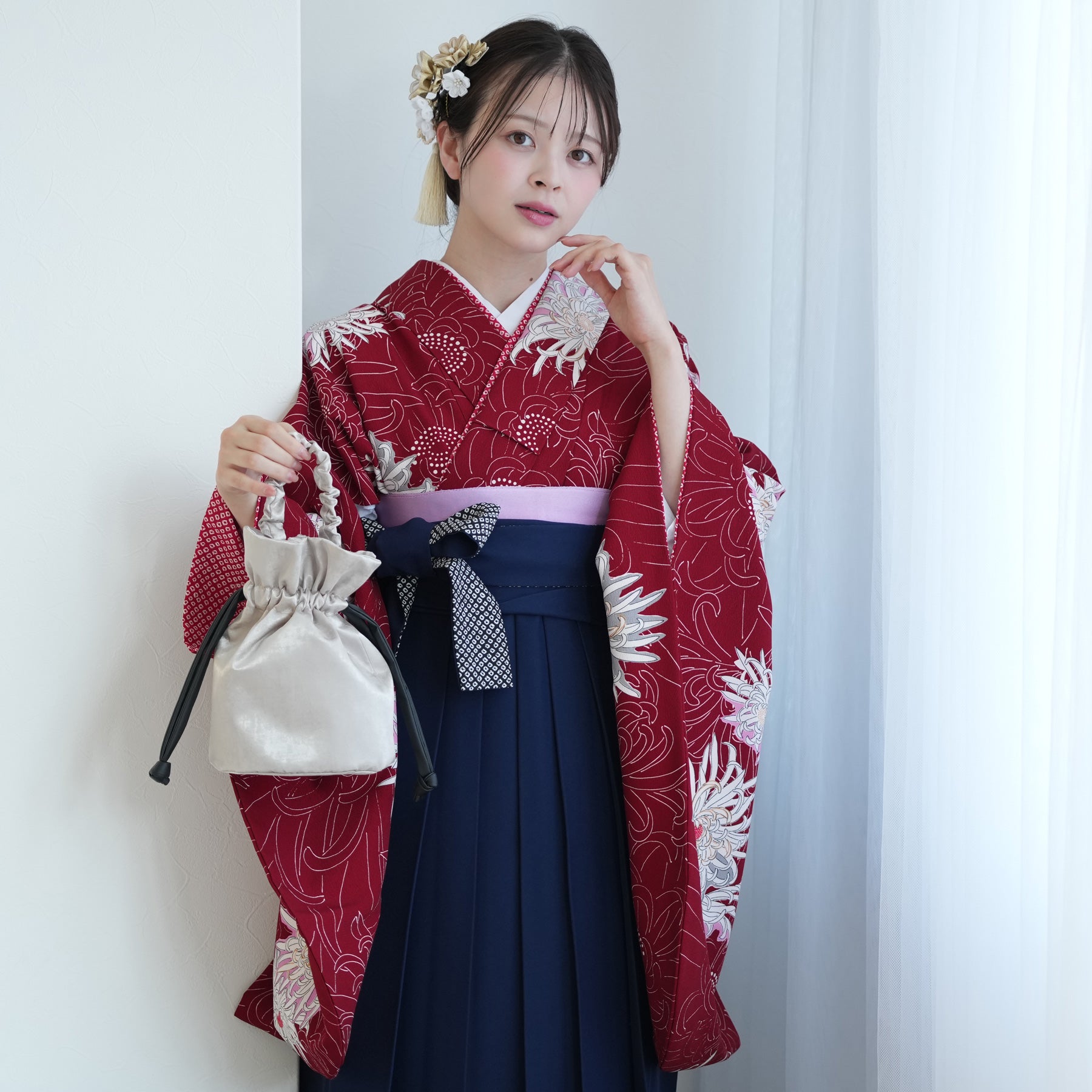 着物・袴・草履・バッグ・重ね襟(着物に縫い付済)・半巾帯・肌襦袢+長襦袢一体化インナー(白無地半襟付き)・前板・着付けベルト・ウエストベルト・腰ひも3本セット・伊達締め ・マジックベルト・衿芯・足袋(プレゼント)