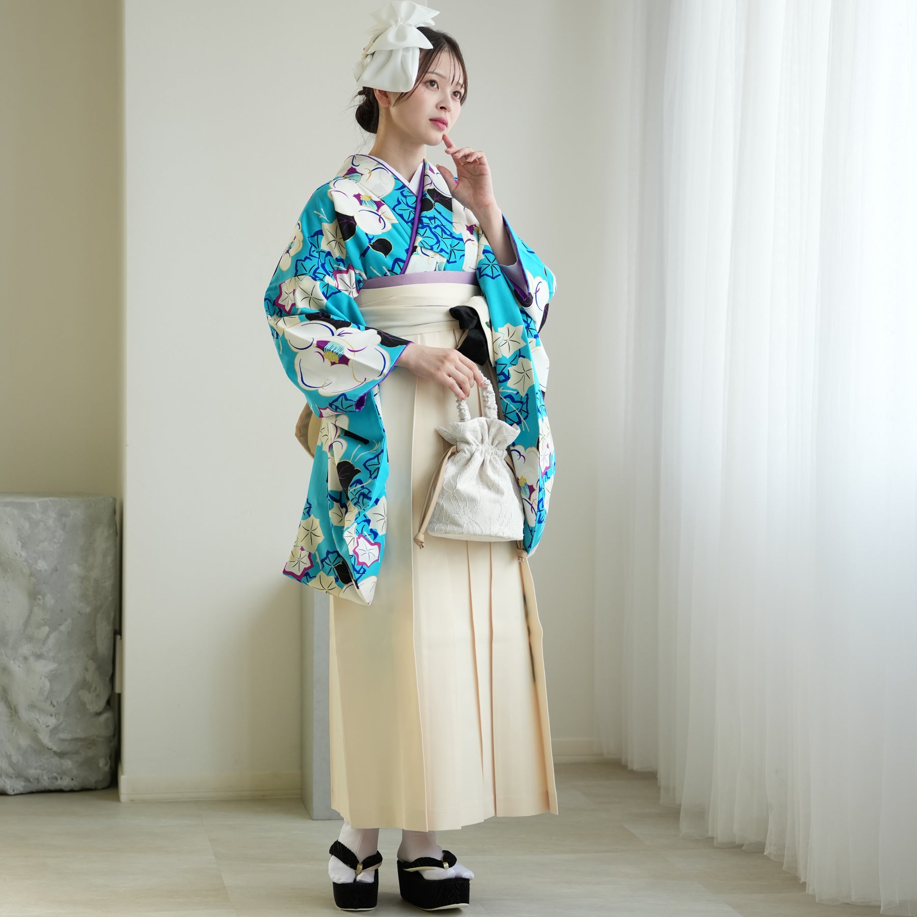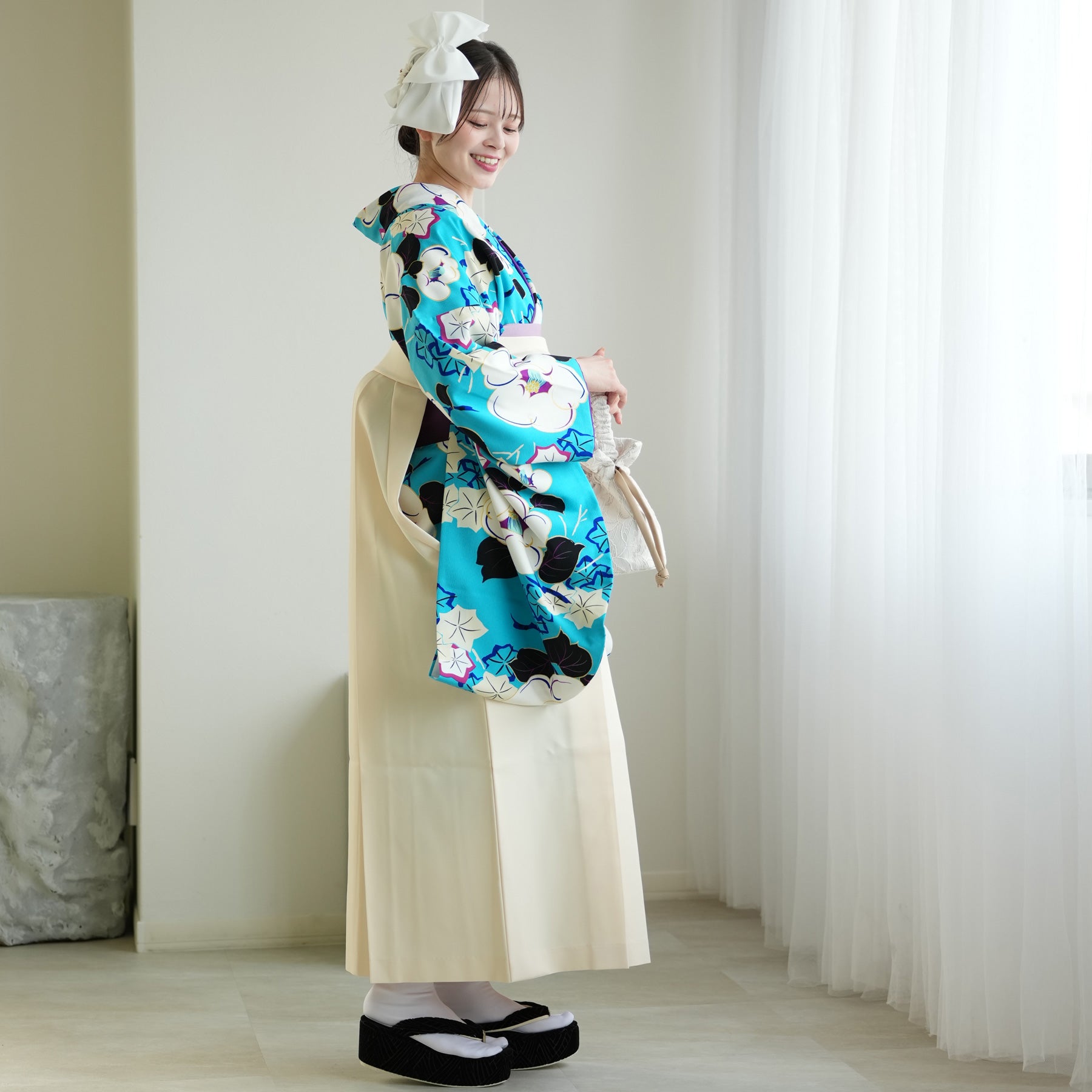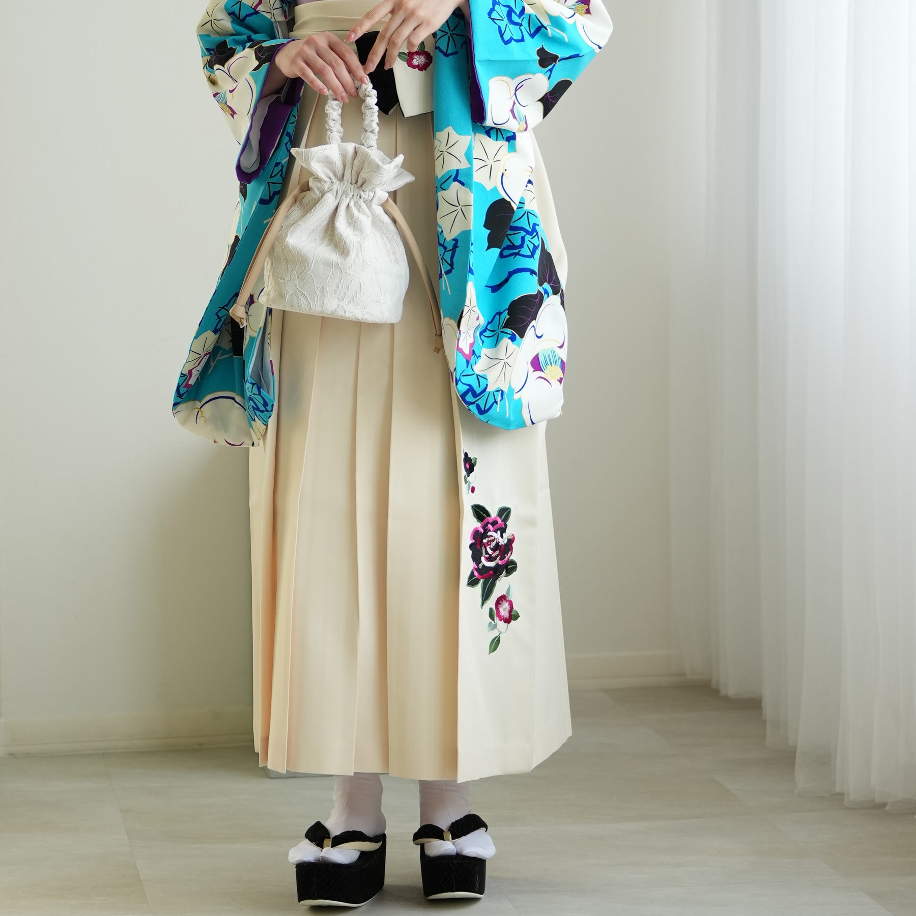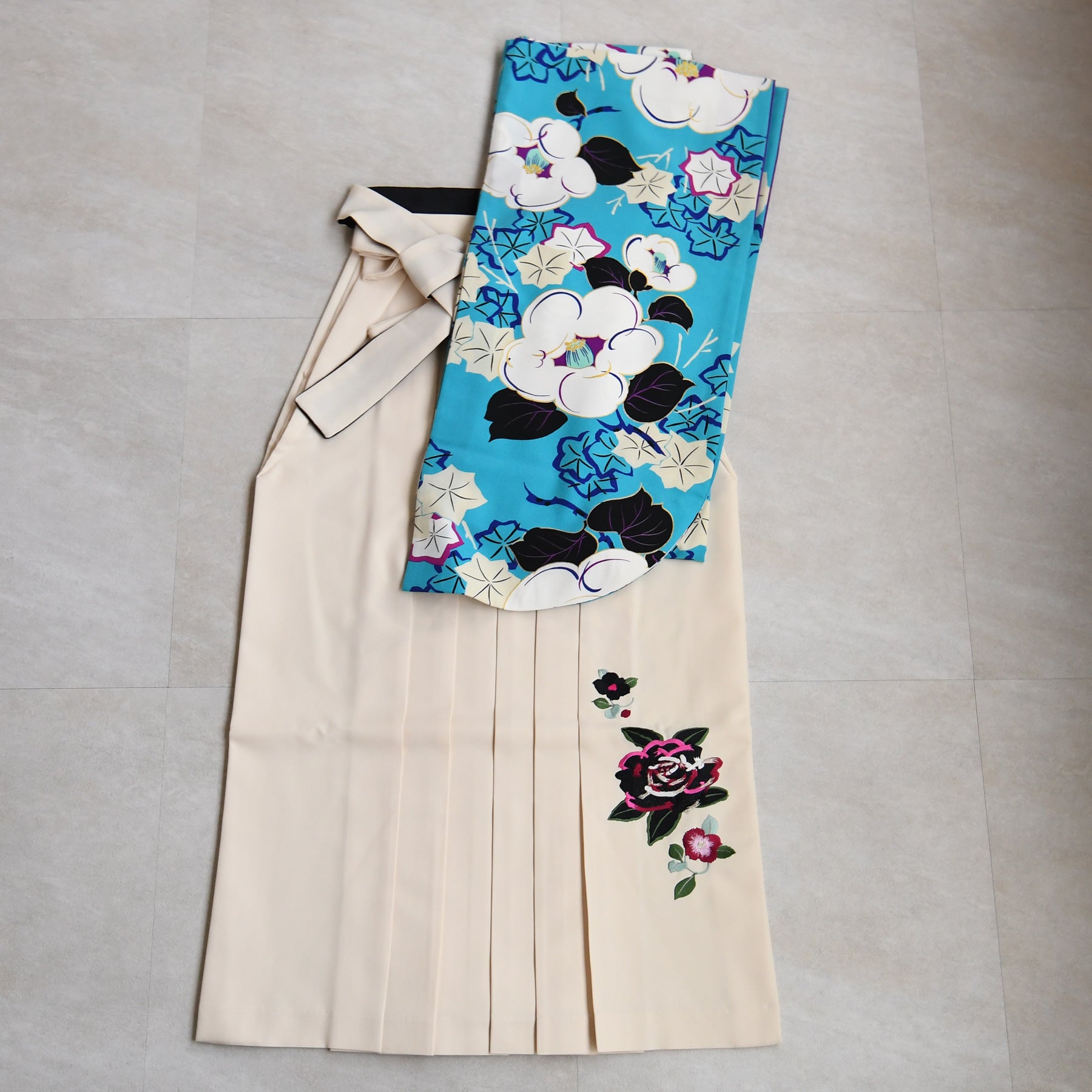 着物・袴・草履・バッグ・重ね襟(着物に縫い付済)・半巾帯・肌襦袢+長襦袢一体化インナー(白無地半襟付き)・前板・着付けベルト・ウエストベルト・腰ひも3本セット・伊達締め ・マジックベルト・衿芯・足袋(プレゼント)
