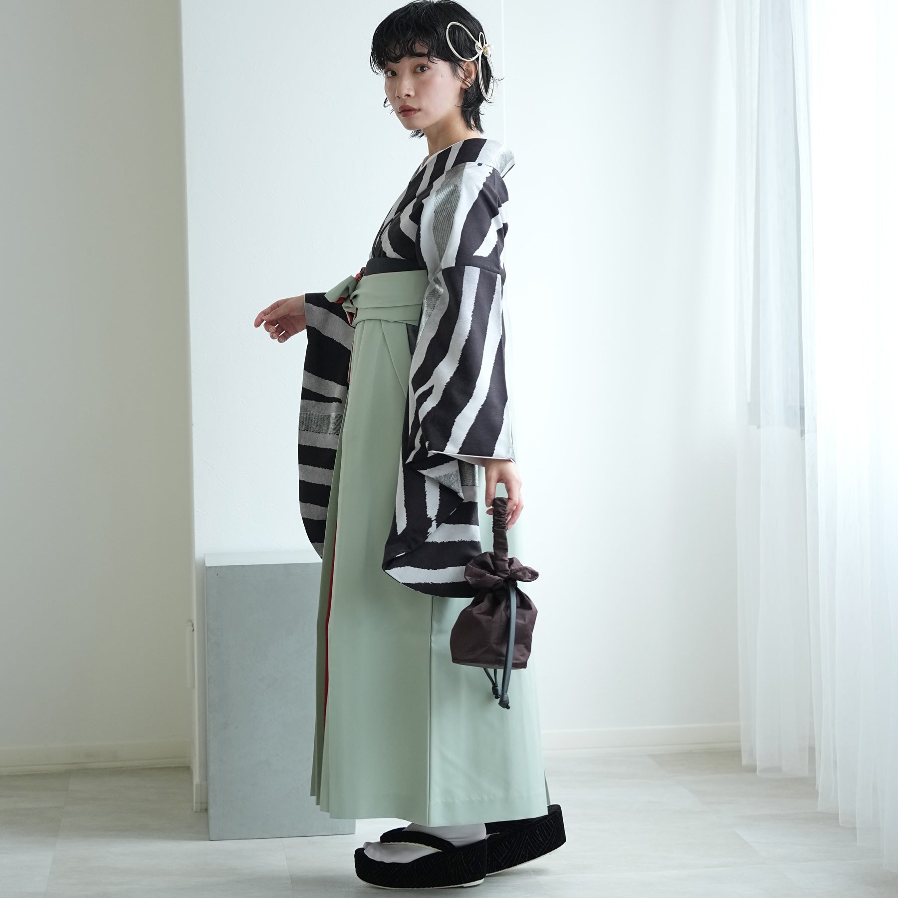 着物・袴・草履・バッグ・重ね襟(着物に縫い付済)・半巾帯・肌襦袢+長襦袢一体化インナー(白無地半襟付き)・前板・着付けベルト・ウエストベルト・腰ひも3本セット・伊達締め ・マジックベルト・衿芯・足袋(プレゼント)