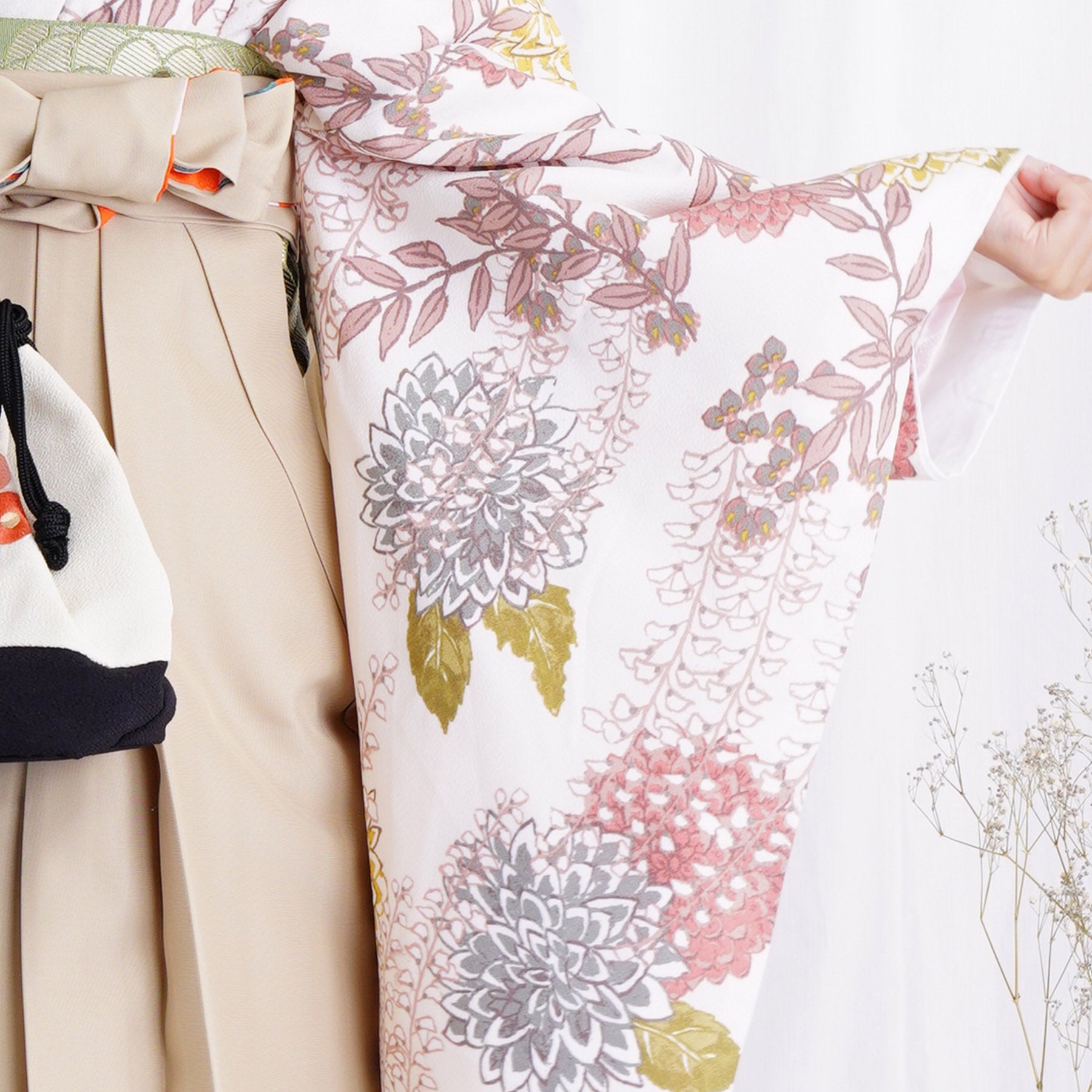 【レンタル】ひよこ商店 2尺袖 袴 15点セット 袴83cm(身長138-145cm)袴87cm(身長145-152cm) レトロモダン系 菊 アイボリー系(1420673202)