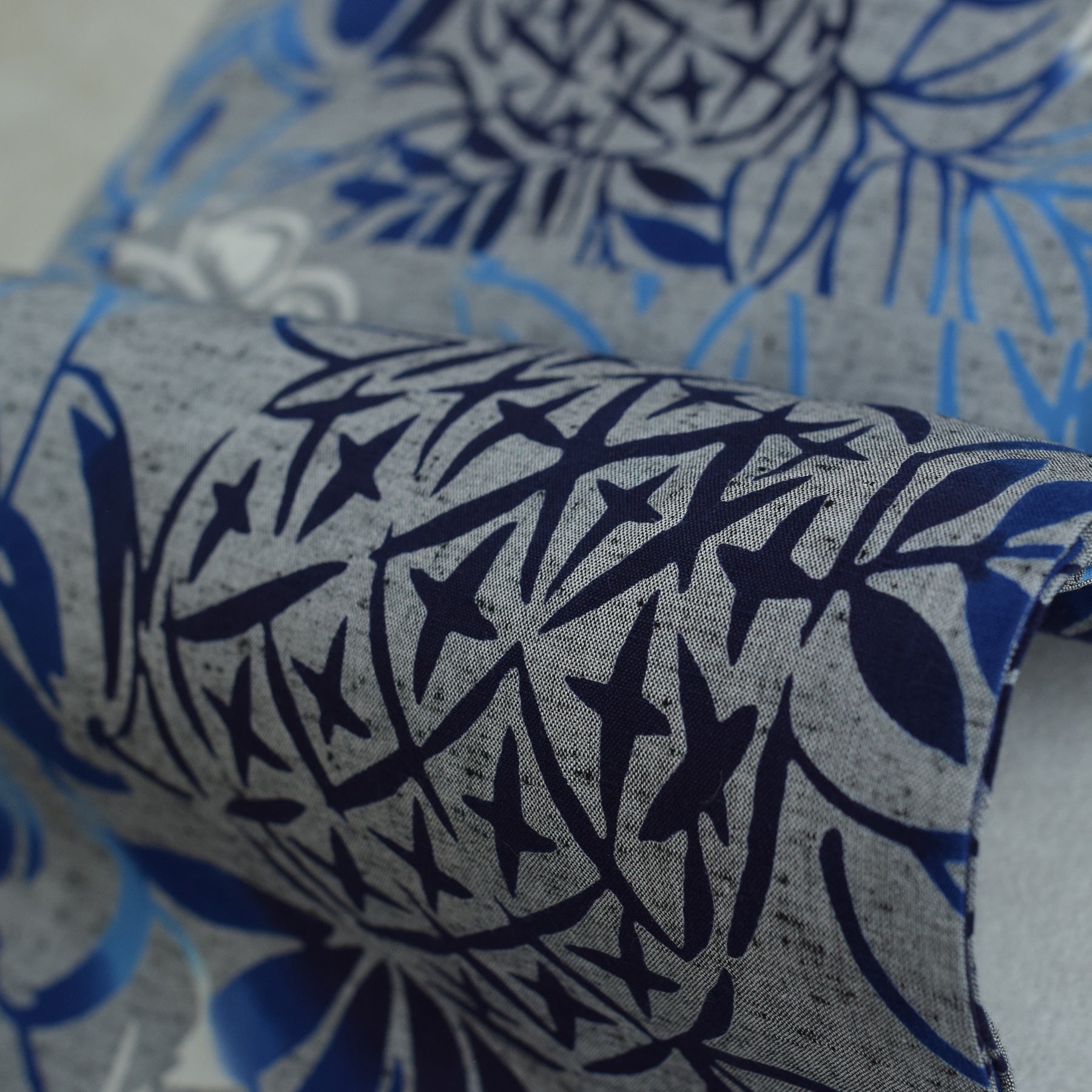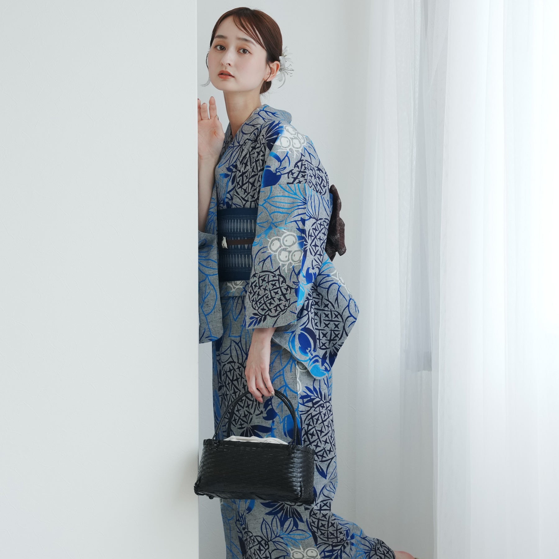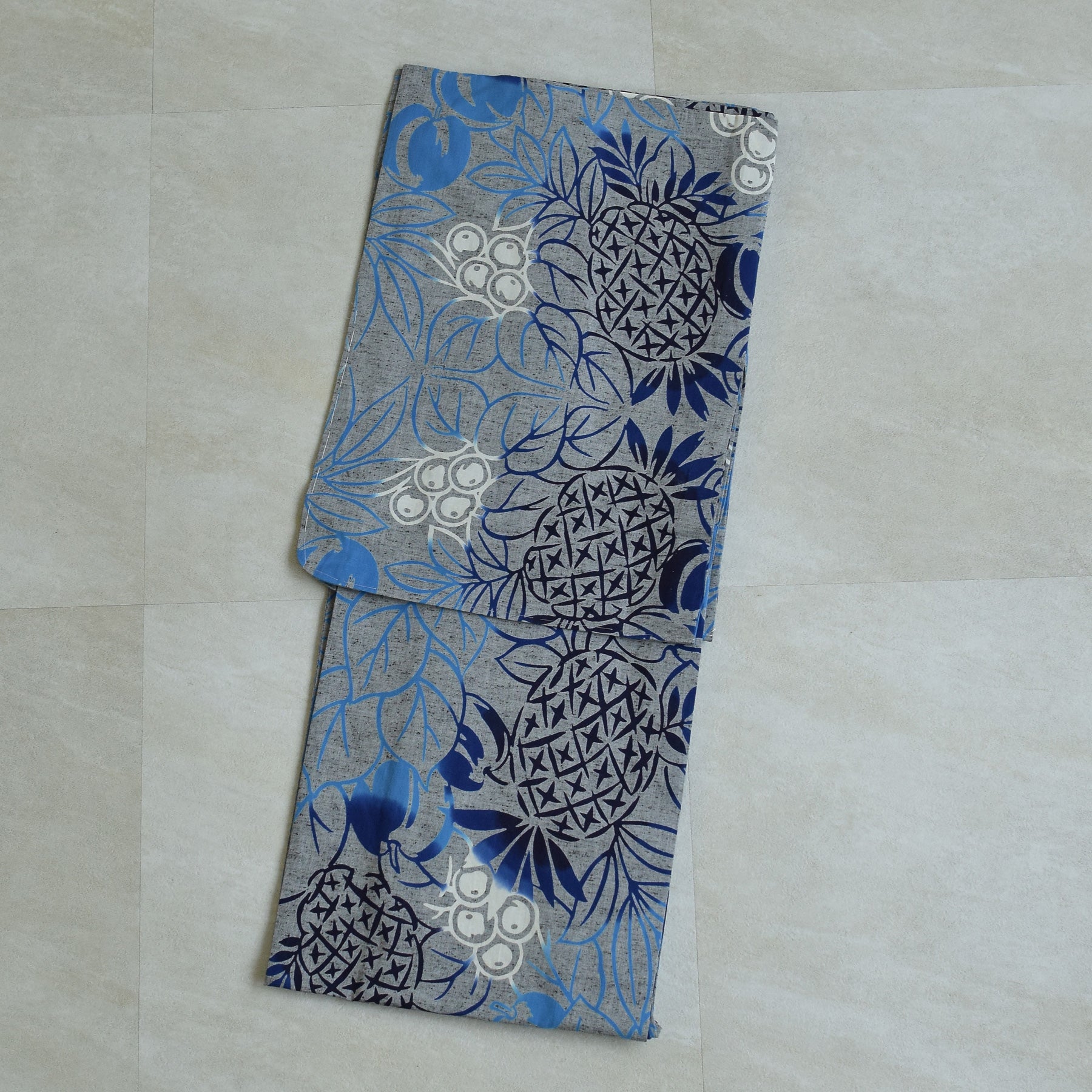 【utatane × 注染工房 浴衣3点セット(ゆかた・帯・下駄)赤坂紬 上品グレーに南国果物】フリーサイズ  日本製 小幅生地使用 特選シリーズ 注染 本染め  手縫い併用国内縫製 奈良の職人さんの手染め (5010263911)