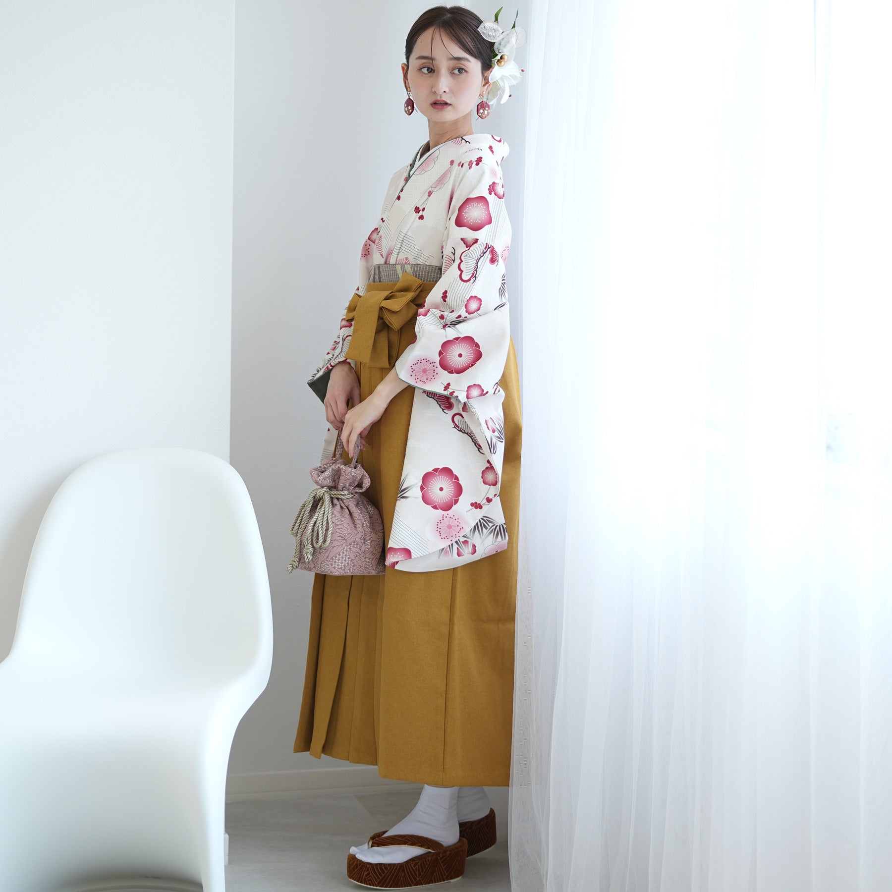 華やかな古典柄にマスタードカラーの袴がポイント。
