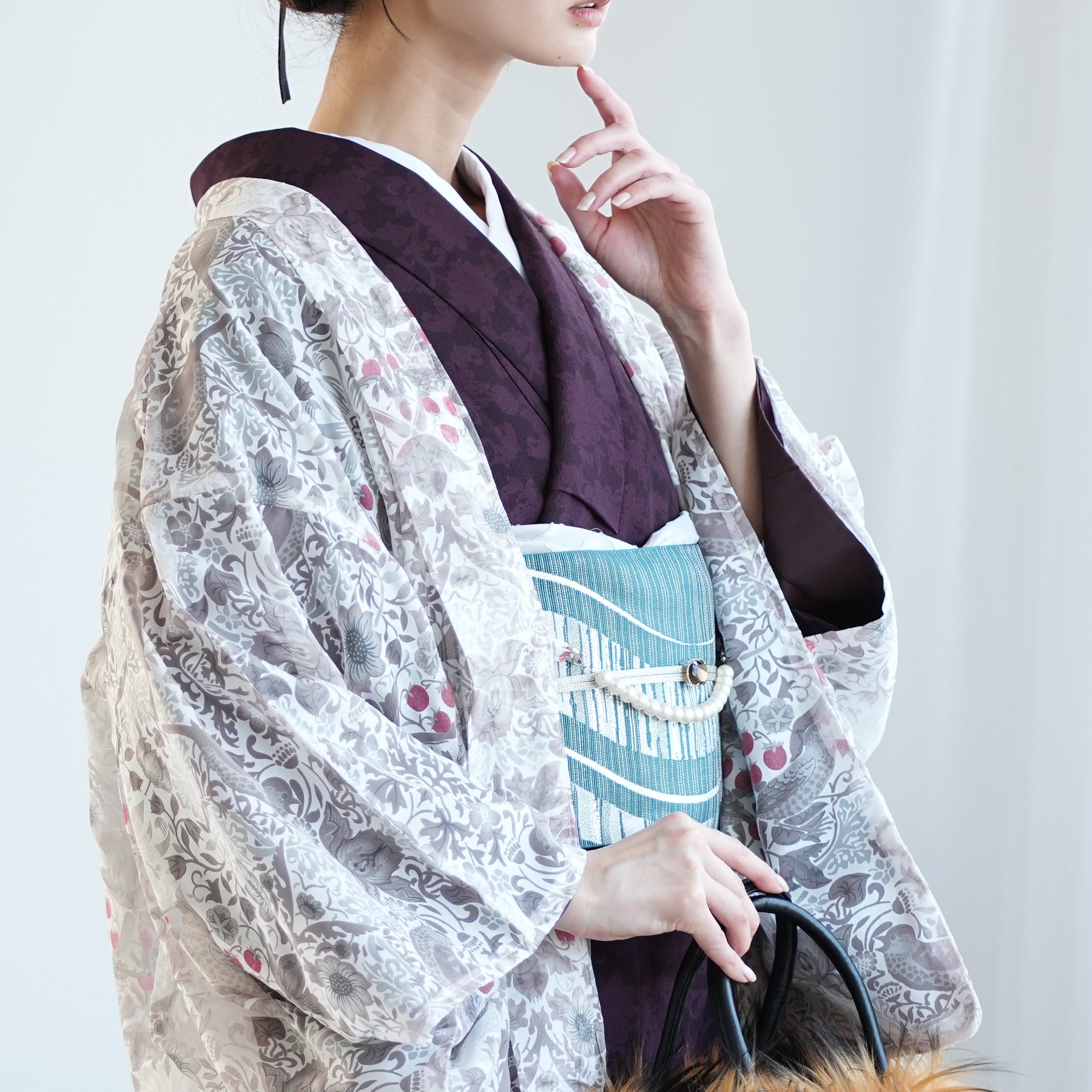繊細な草花の流れと小鳥のモチーフが、和の装いにも調和する優雅な趣を添えます。