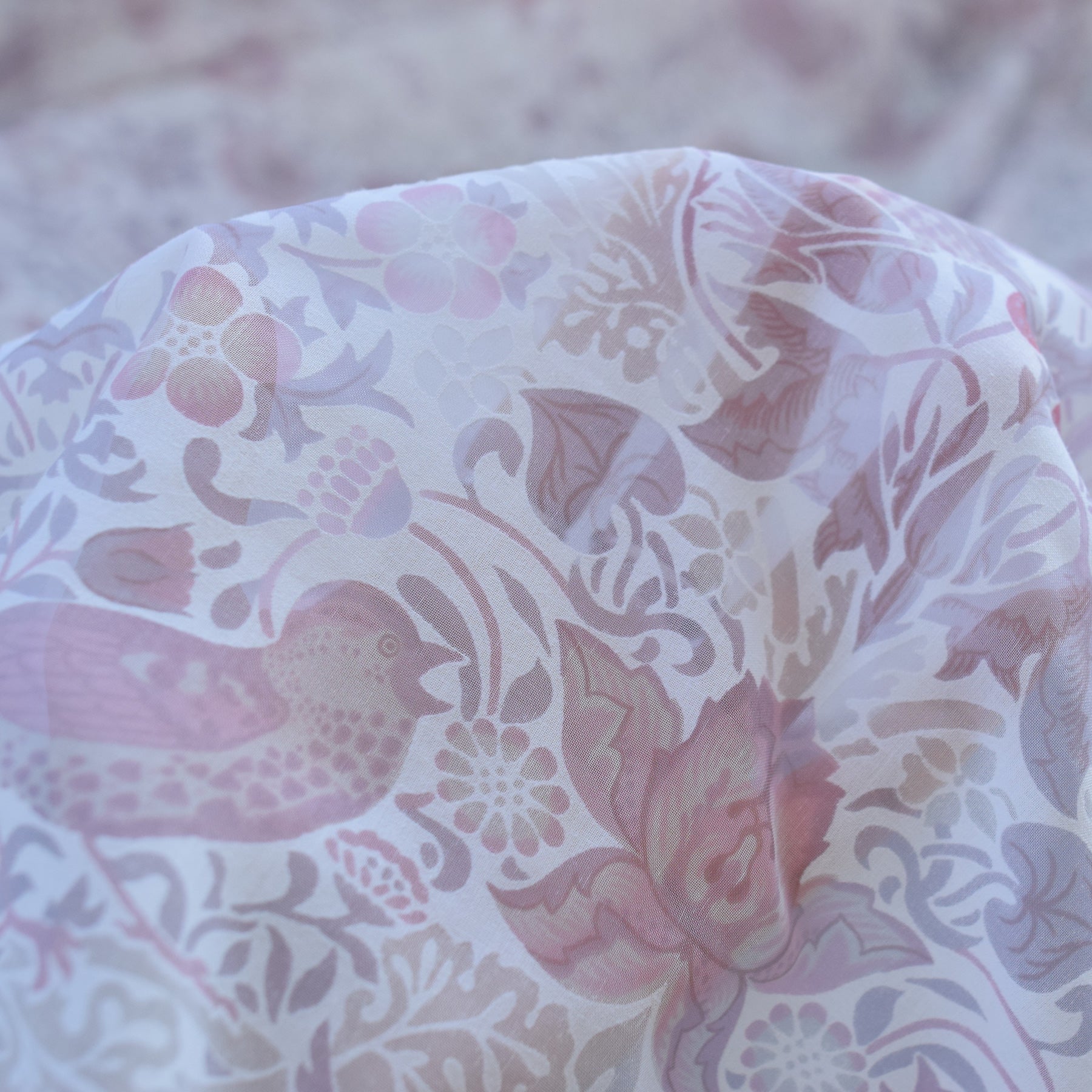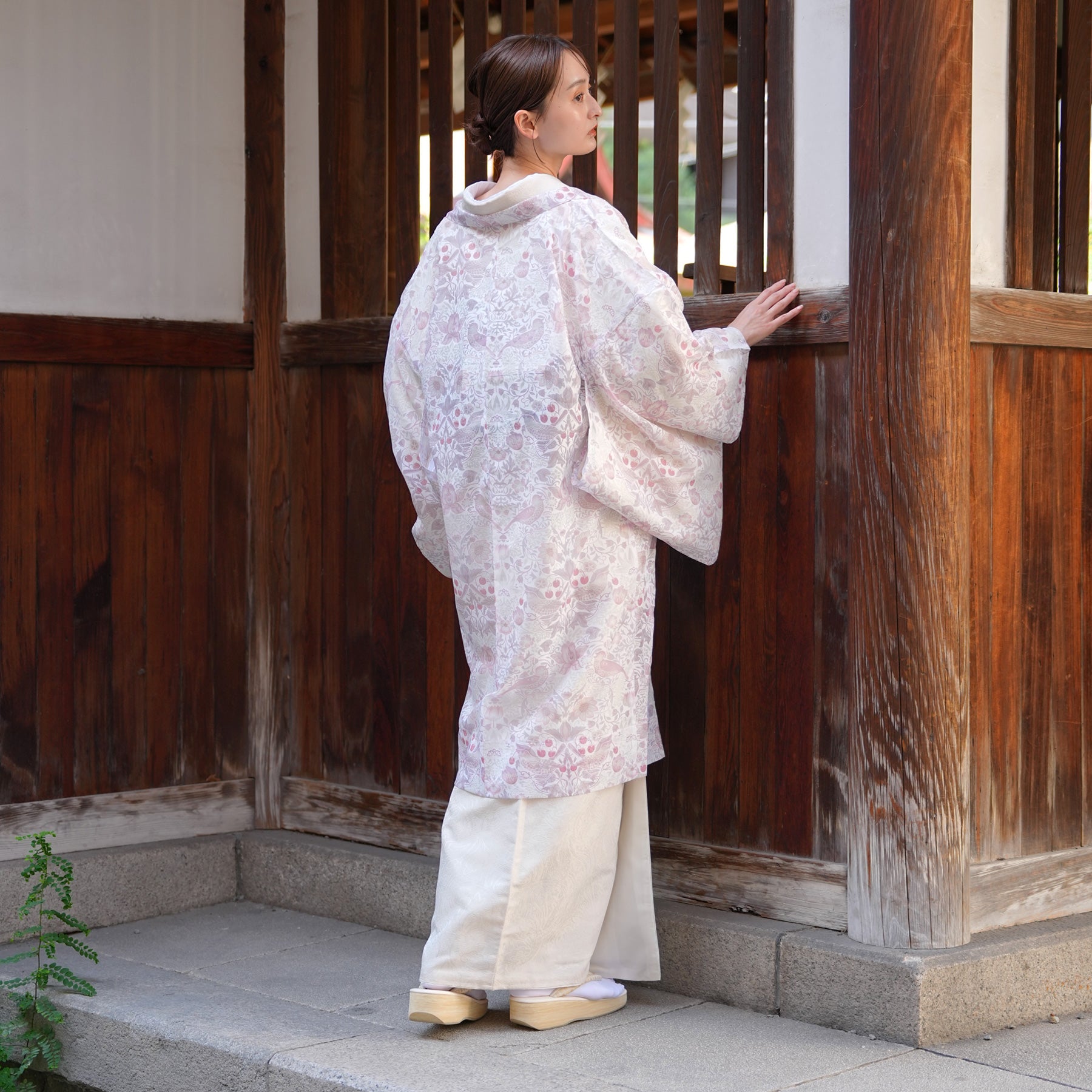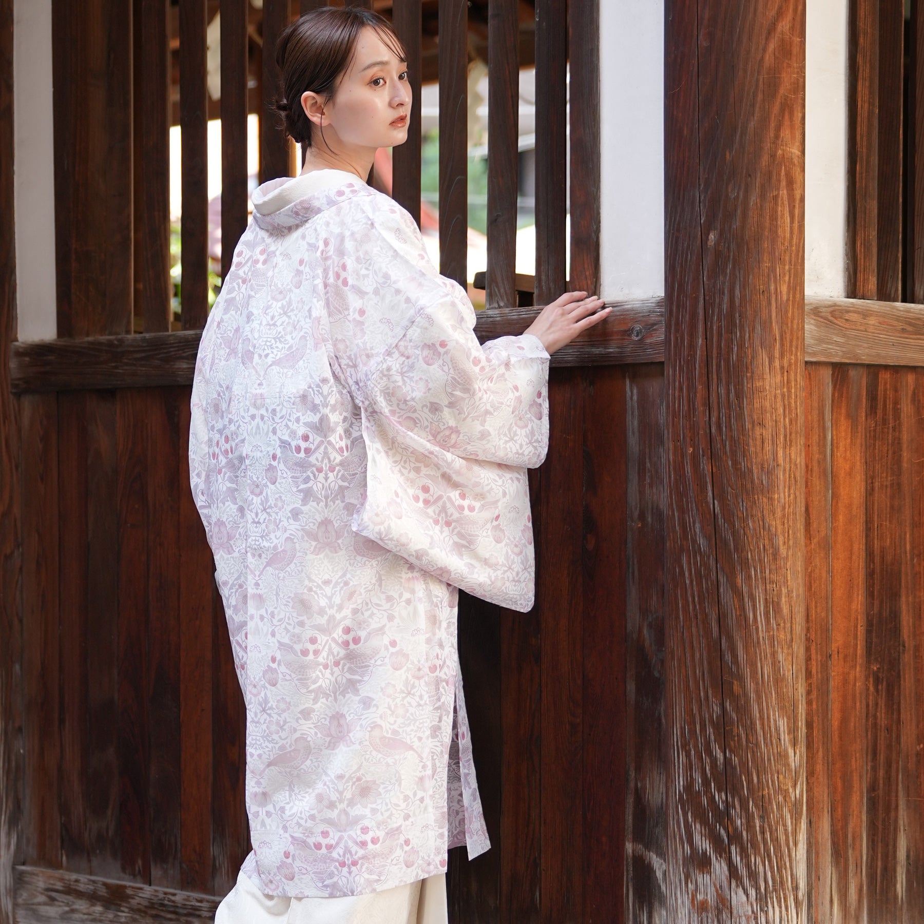 【薄羽織  Strawberry Thief(イチゴ泥棒) ローザ オパール加工】長羽織  国産生地 フリーサイズ  透け感 ピンク ベビーピンク ニコアンティーク Fabric by BEST OF MORRIS ベスト・オブ・モリス(5223613400)
