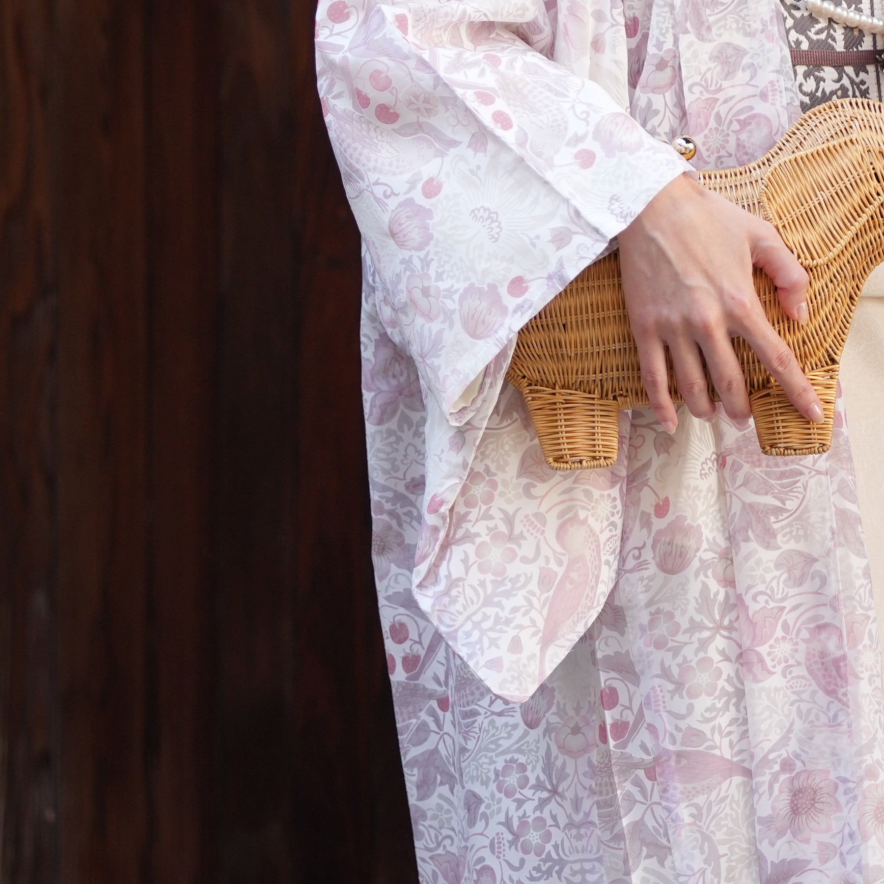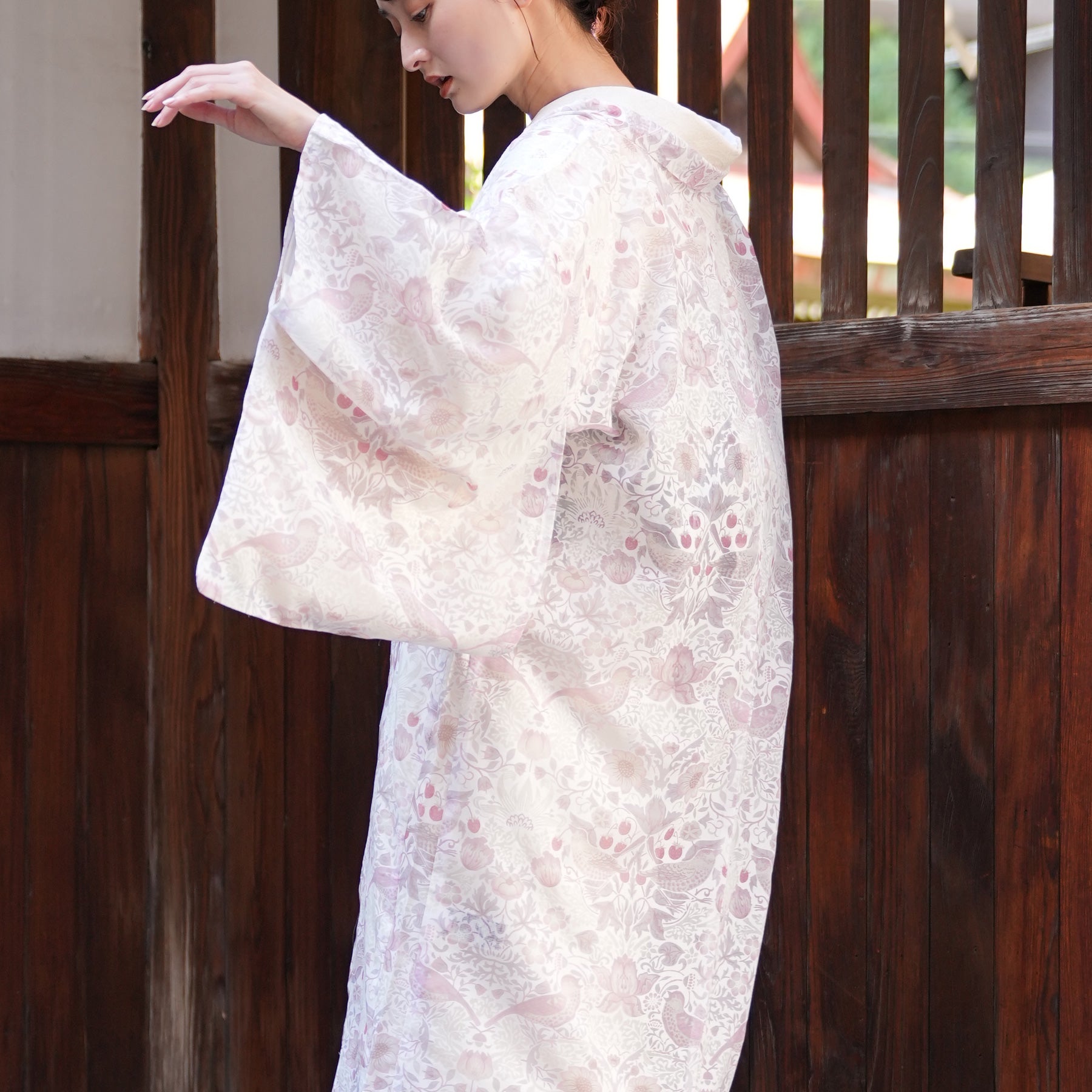 【薄羽織 Strawberry Thief(イチゴ泥棒) ローザ オパール加工】長羽織 国産生地 フリーサイズ 透け感 ピンク ベビーピンク ニコアンティーク Fabric by BEST OF MORRIS ベスト・オブ・モリス(5223613400)