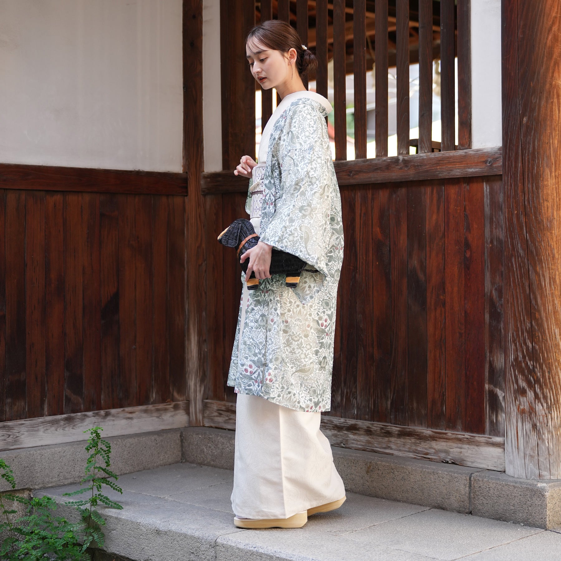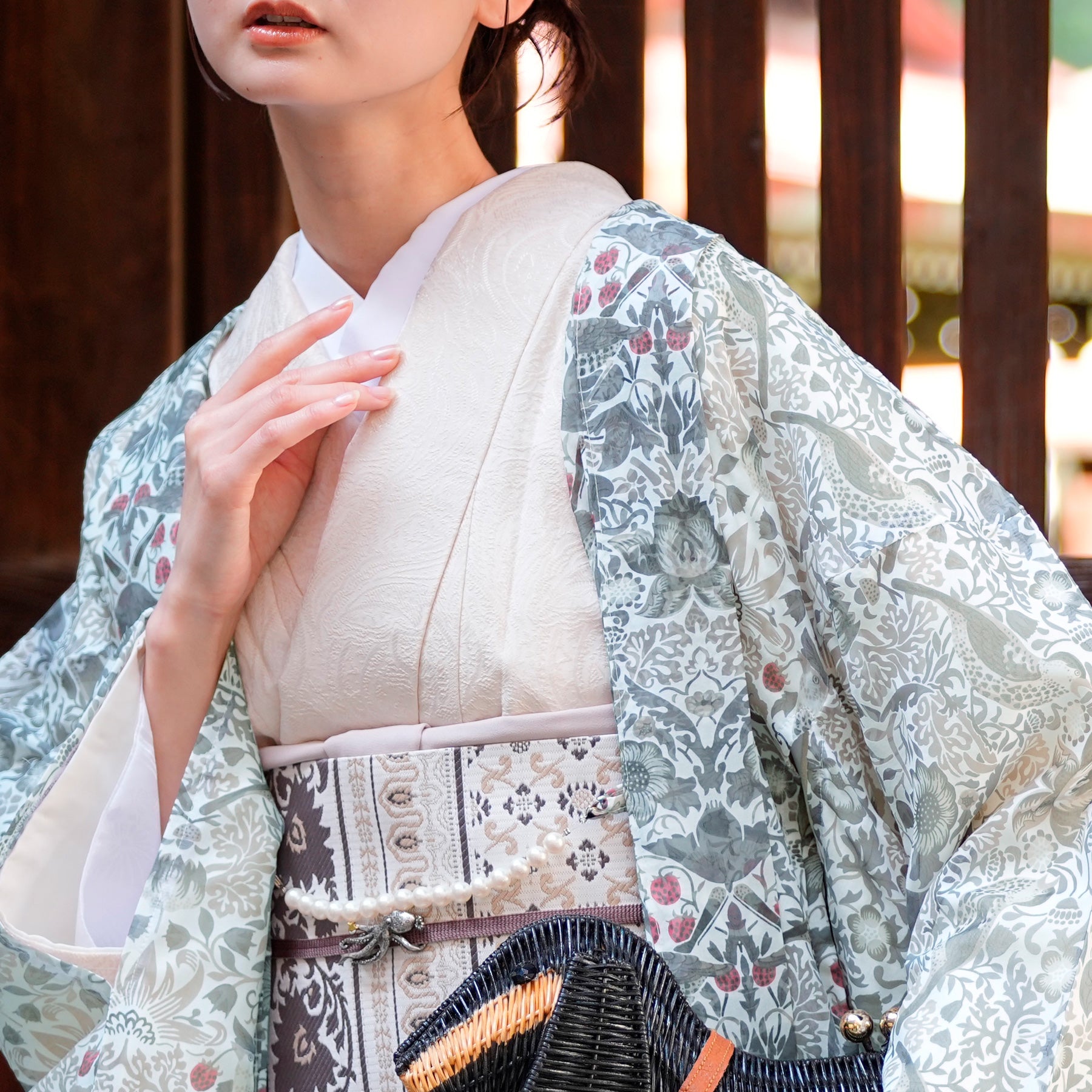 繊細な草花の流れと小鳥のモチーフが、和の装いにも調和する優雅な趣を添えます。