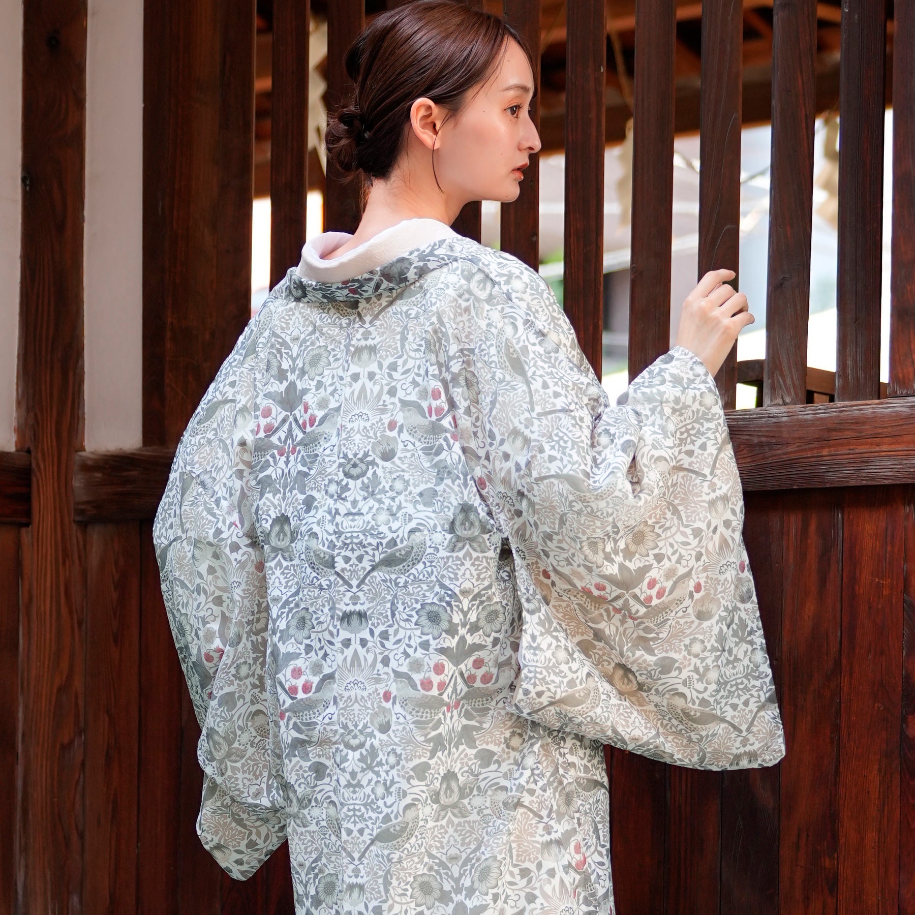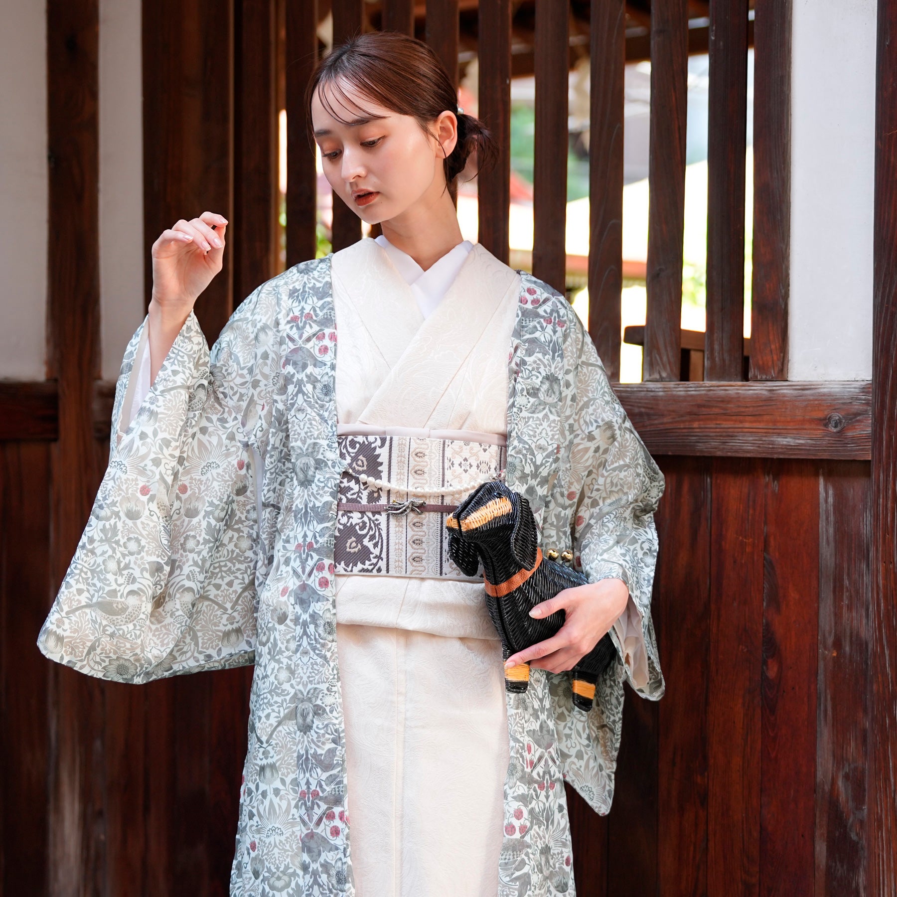 浴衣や小紋などの上にさらりと羽織るだけで、季節を感じる装いに。 日常にアートをまとうような一枚です。