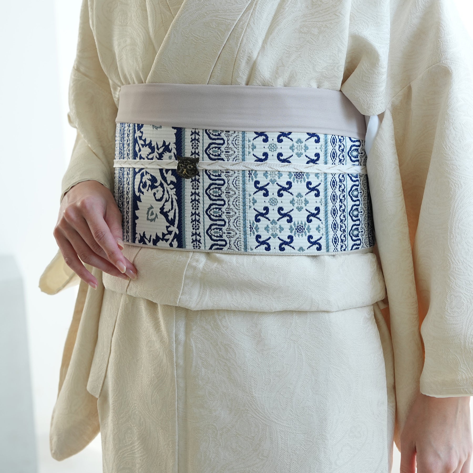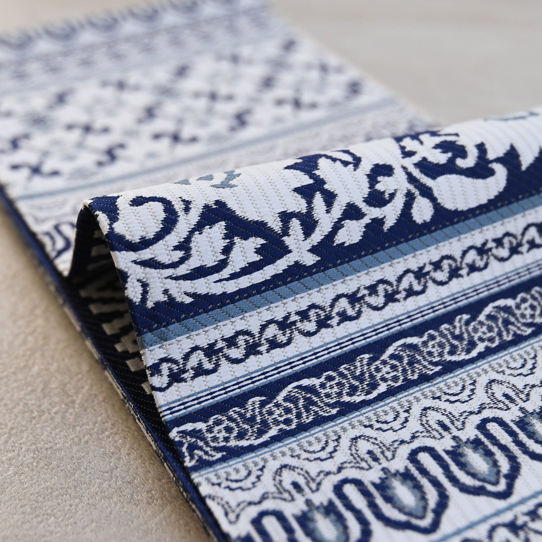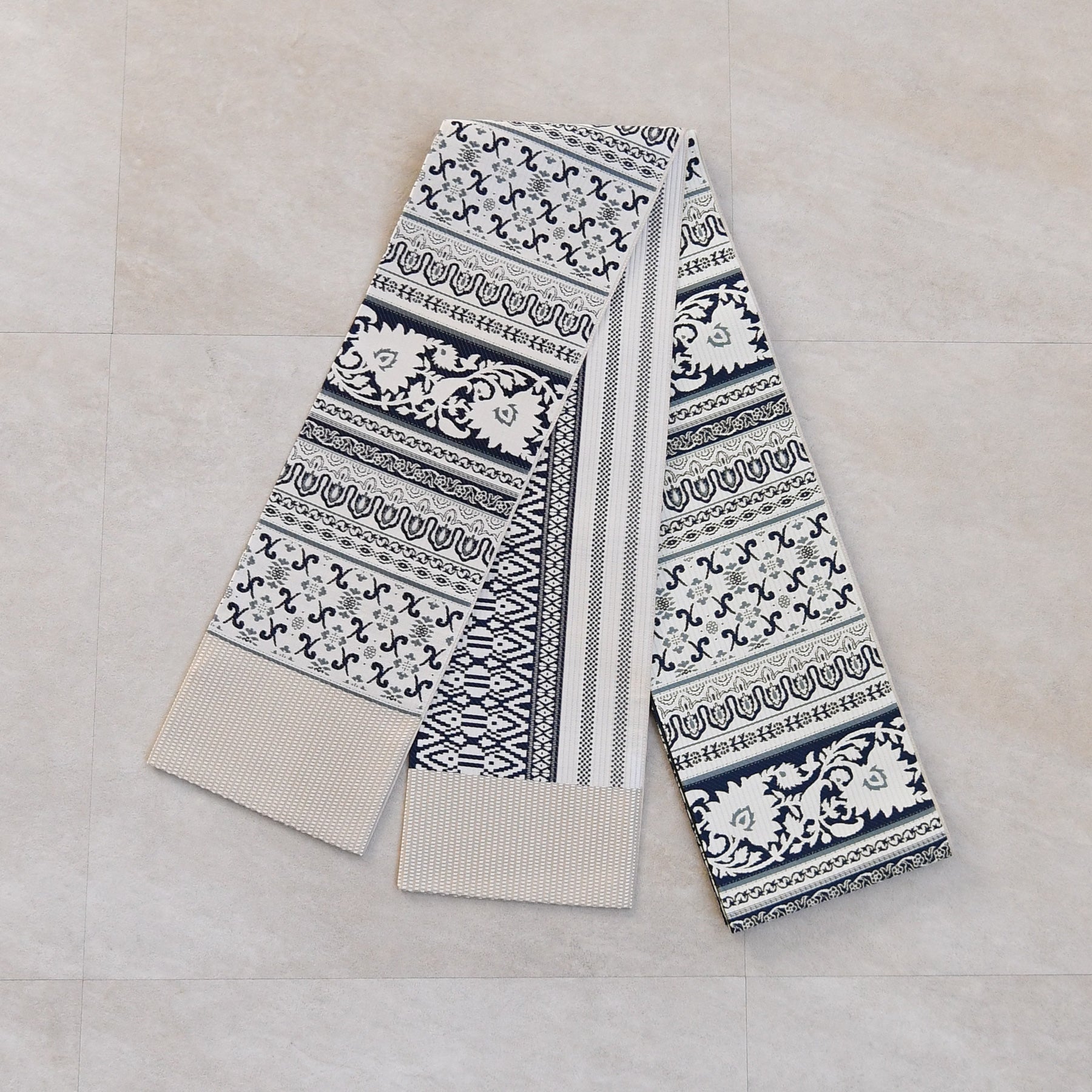 【半幅帯 博多織 インド更紗献上 ホワイト】帯単品 小袋帯 長尺 正絹 リバーシブル 日本製 本場筑前博多織 紋小巾袋帯 証紙付き(5279625400)