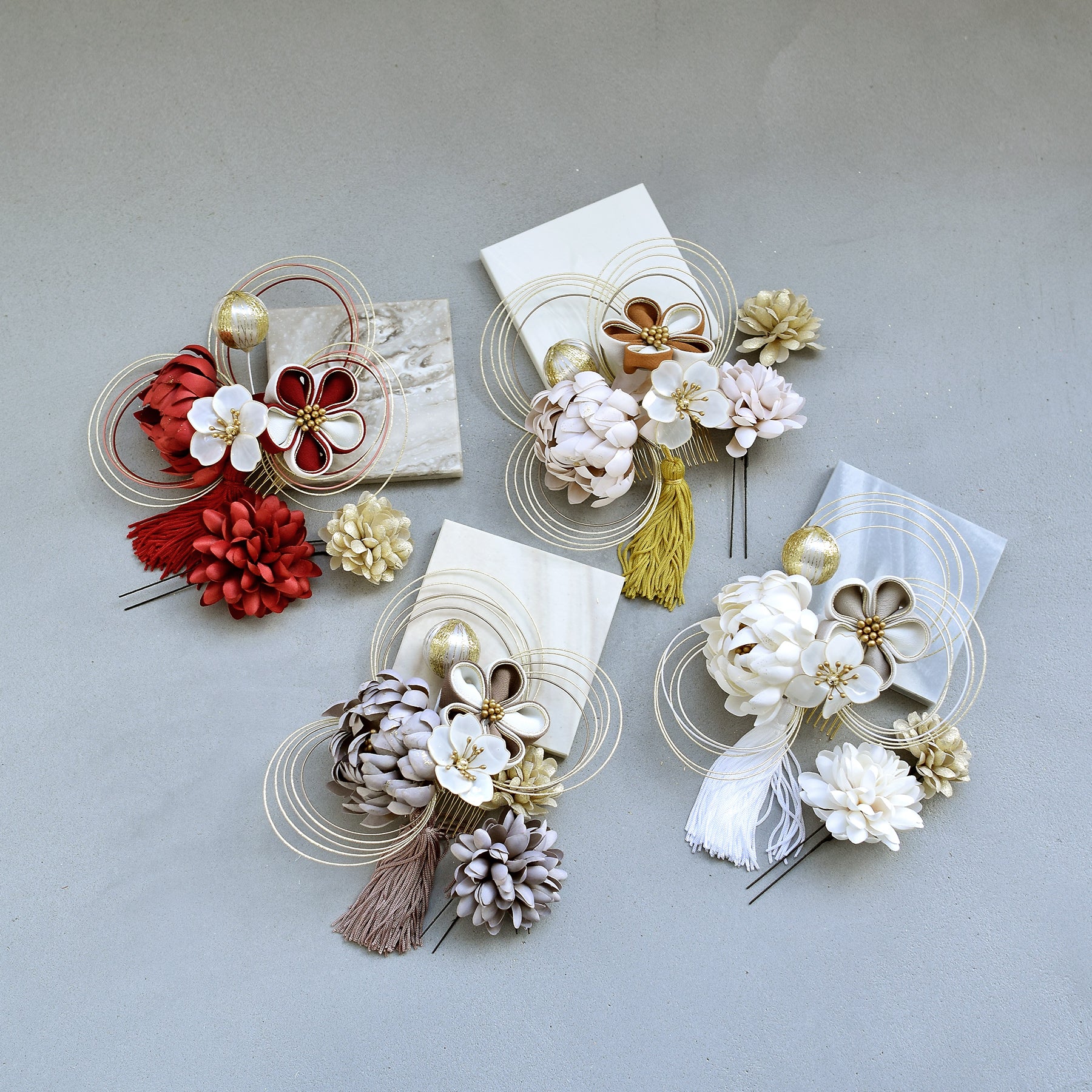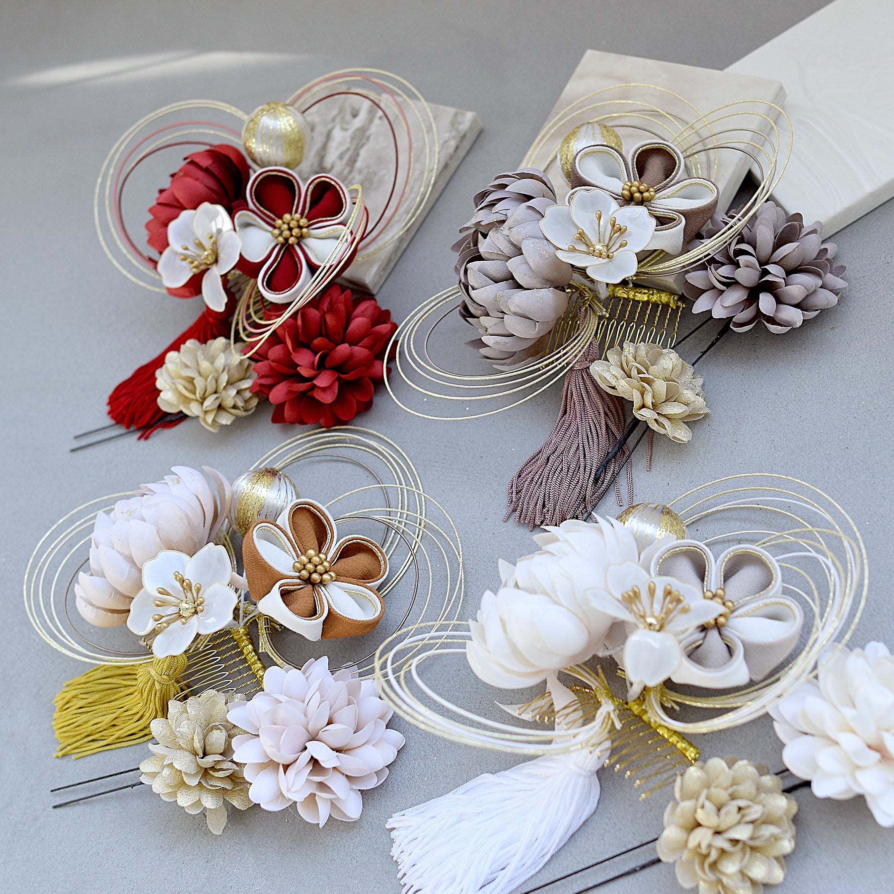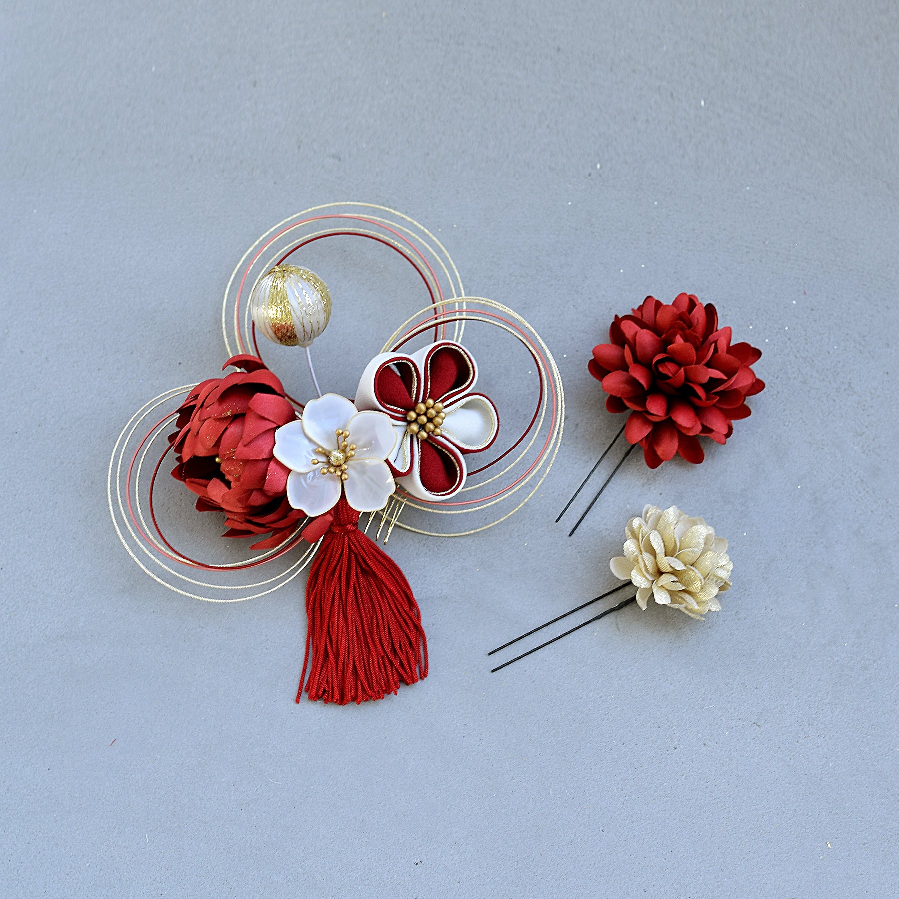【髪飾り 菊梅桜・水引 コームUピン3点セット】タッセル つまみ細工 アメリカンフラワー ヘアアクセサリー 日本製 成人式振袖や卒業式袴にも(5432636301)【取り寄せ品】