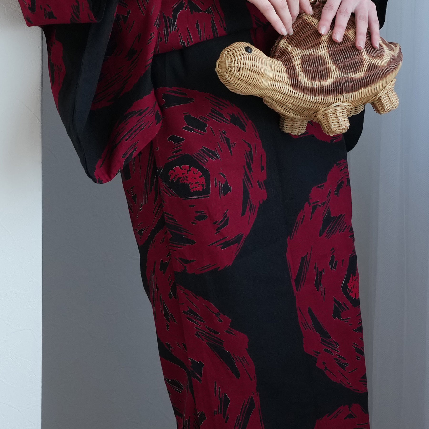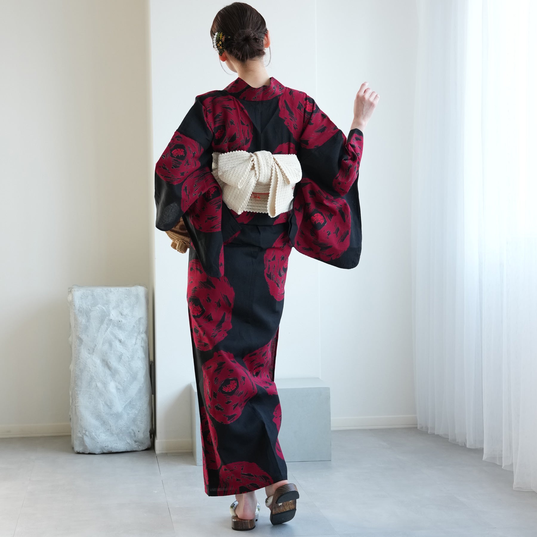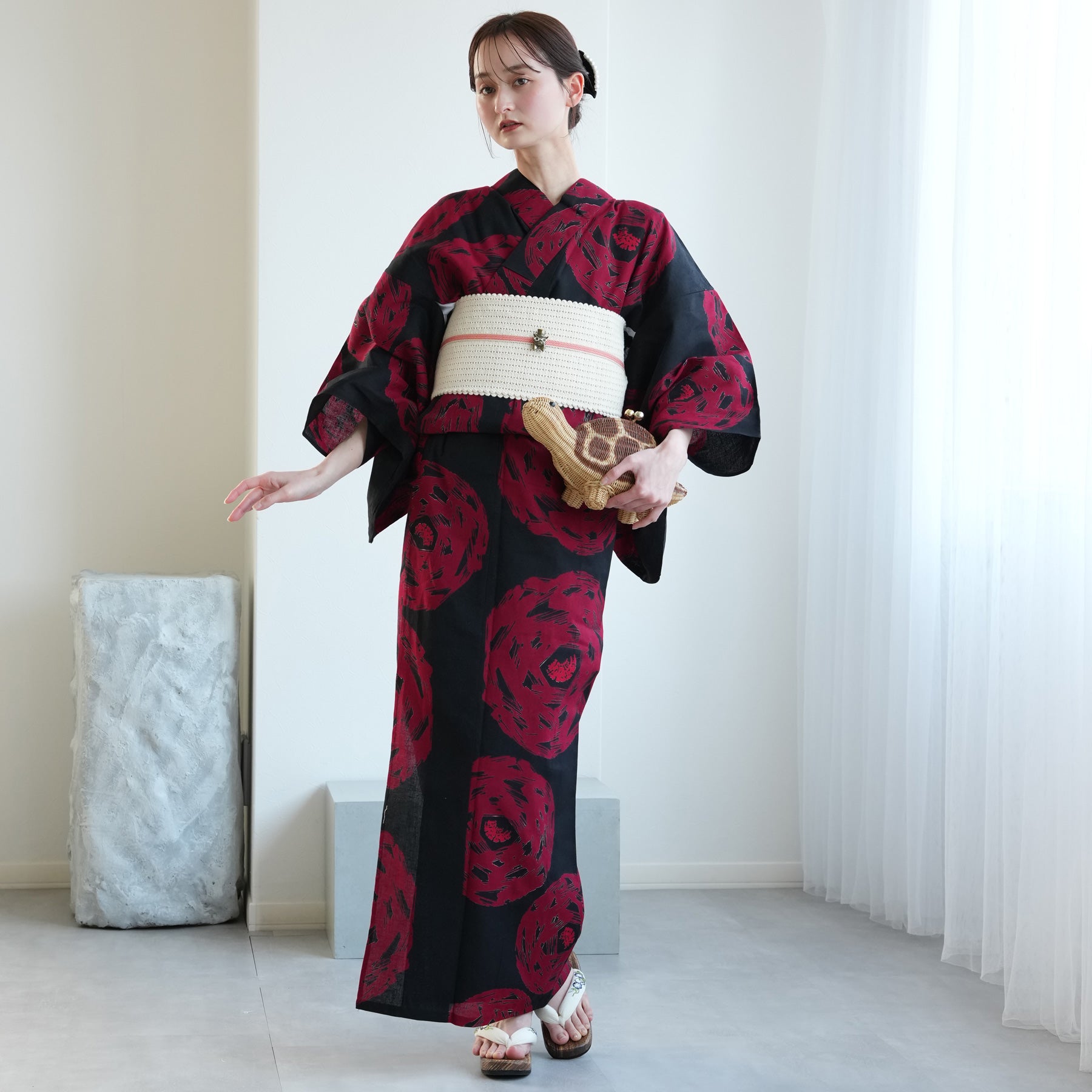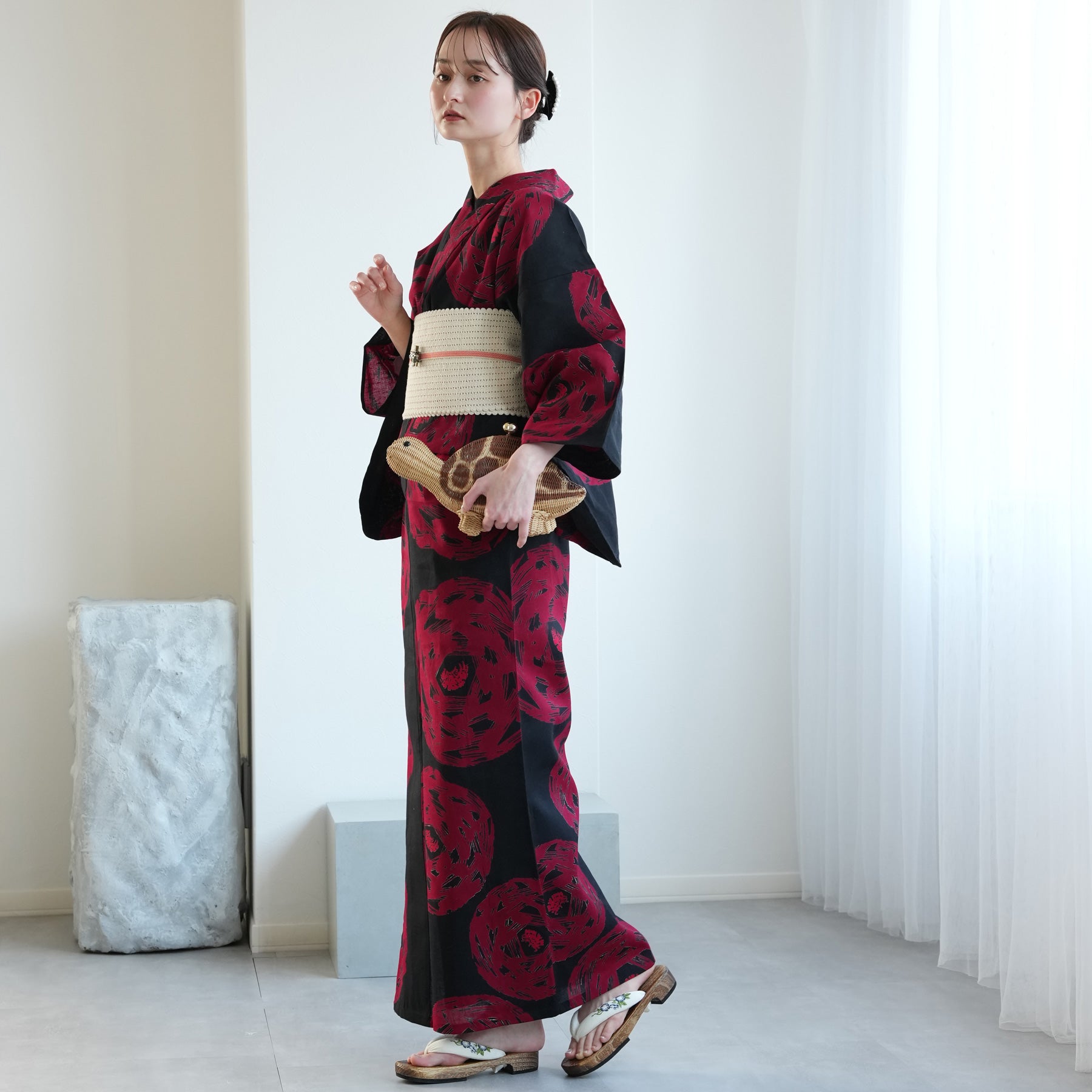 【utatane×注染工房 浴衣3点セット(浴衣・帯・下駄) 黒に紅赤 緋輪】フリーサイズ コットン100% 日本製小幅生地使用 (5010295111)