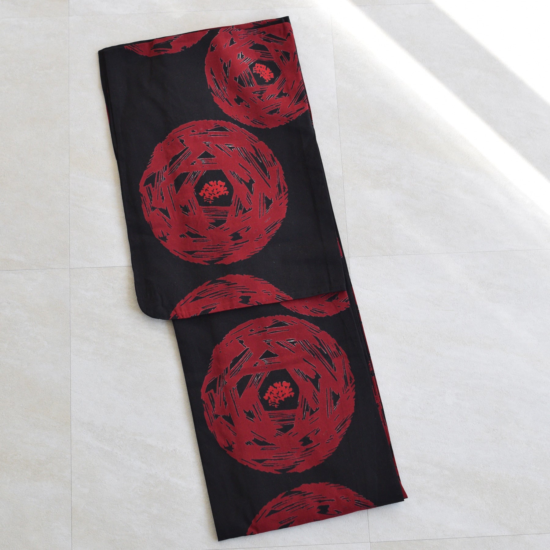 【utatane×注染工房 浴衣3点セット(浴衣・帯・下駄) 黒に紅赤 緋輪】フリーサイズ  コットン100% 日本製小幅生地使用 (5010295111)