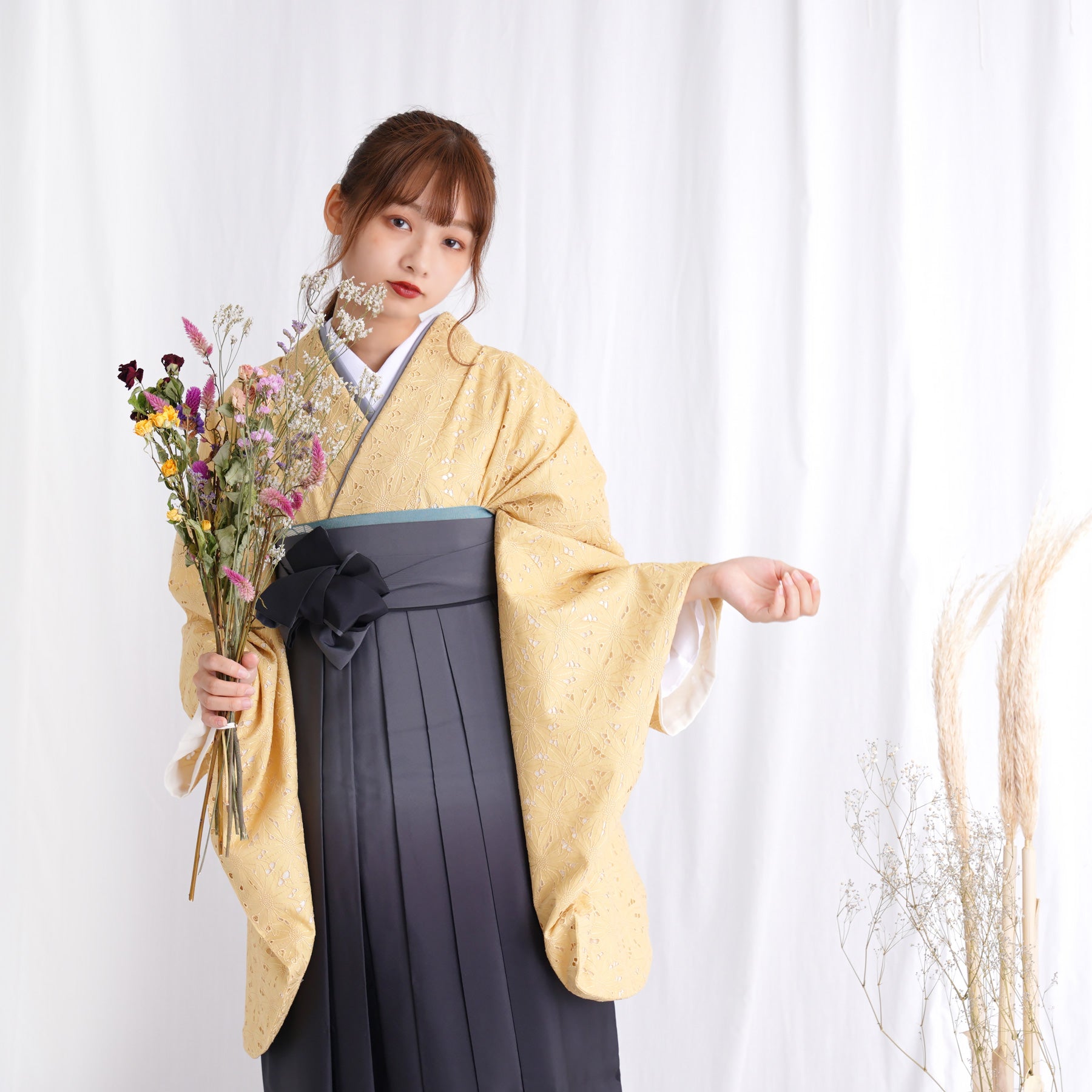 【リサイクル着物】 2尺袖着物 袴 2点セット 販売品 中古 USED レース 花柄 黄色系 袴91cm(身長153-158cm)卒業式 大学生 (5182682611)【中古販売】