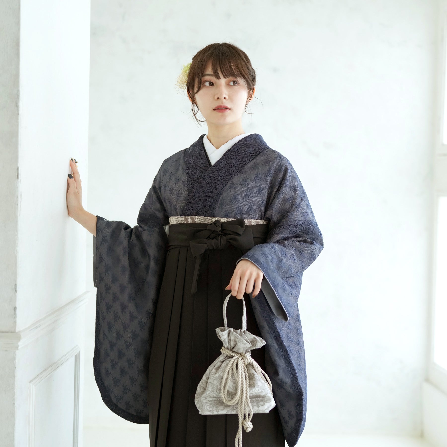 【リサイクル着物】 2尺袖着物 袴 2点セット 販売品 中古 USED  ネイビー グレー レース 花柄  袴91cm(身長153-158cm)卒業式 大学生 (5182683111)【中古販売】