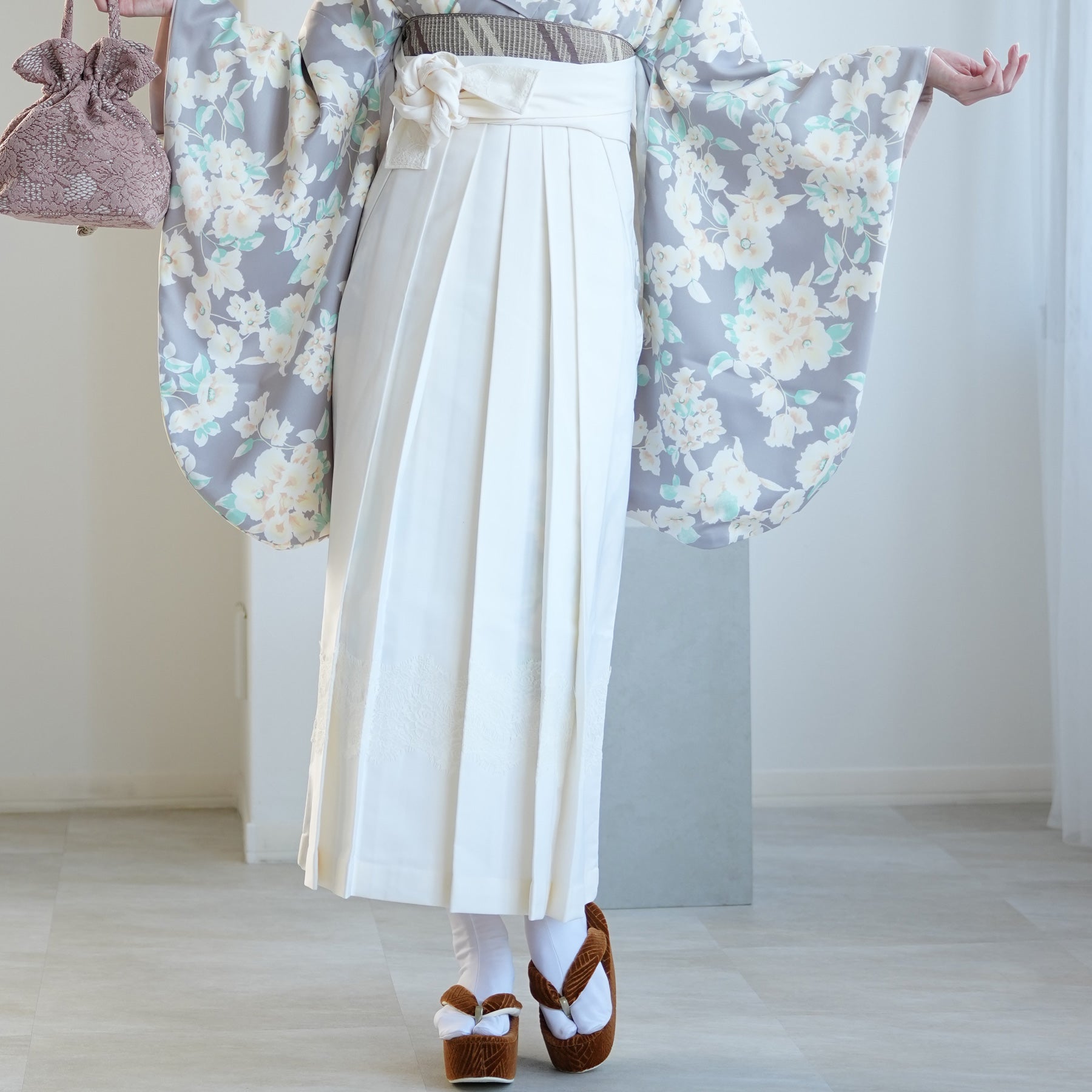 着物・袴・草履・バッグ・重ね襟(着物に縫い付済)・半巾帯・肌襦袢+長襦袢一体化インナー(白無地半襟付き)・前板・着付けベルト・ウエストベルト・腰ひも3本セット・伊達締め ・マジックベルト・衿芯・足袋(プレゼント)
