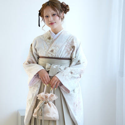 【レンタル】2尺袖 袴 17点セット 袴95cm(身長約158-163cm)クラシックホワイトに紫レトロ花 アイボリー系(1021661111)