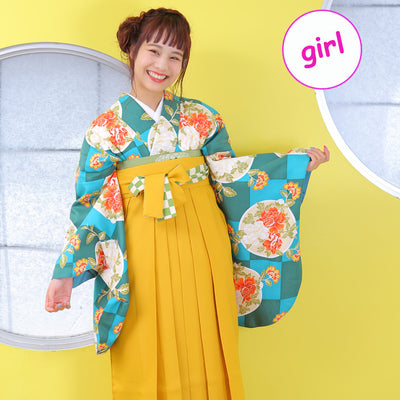 【リサイクル着物】着物単品 販売品 中古 USED 袴用 短丈 緑系 市松 牡丹 ジュニア 小学生 卒業式 ひよこ商店(6751632900)【中古販売】