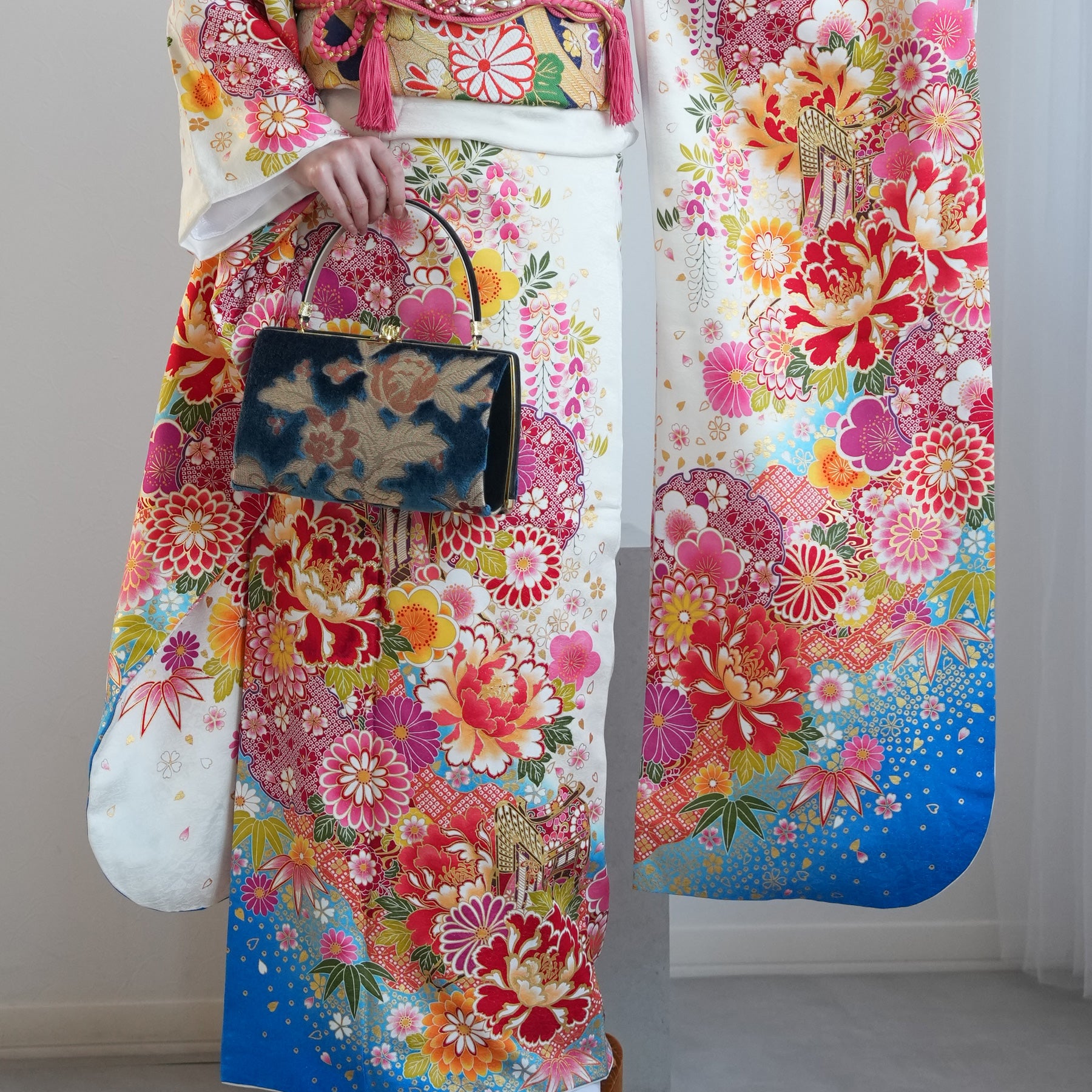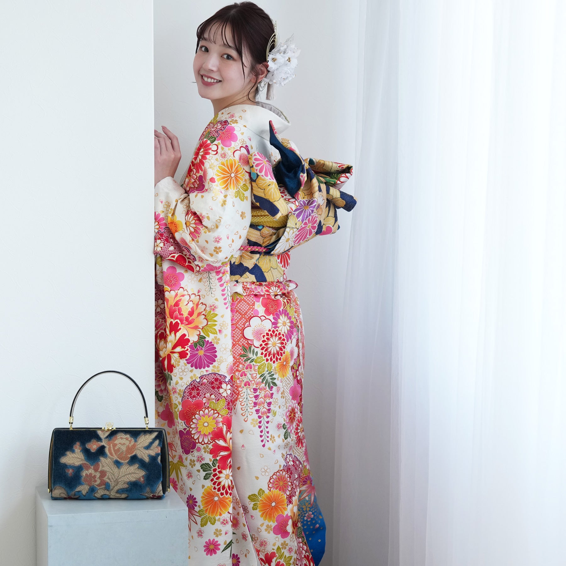 振袖・袋帯・草履・バッグ・長襦袢・帯〆・帯揚げ・重ね衿・肌襦袢・前板・着付けベルト・ウエストベルト・三重仮紐・腰ひも3本セット・帯まくら・伊達締め ・マジックベルト・衿芯・足袋(プレゼント)