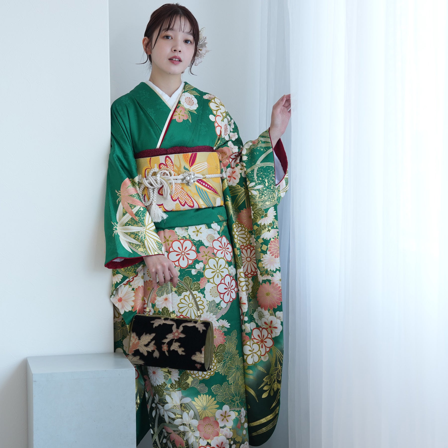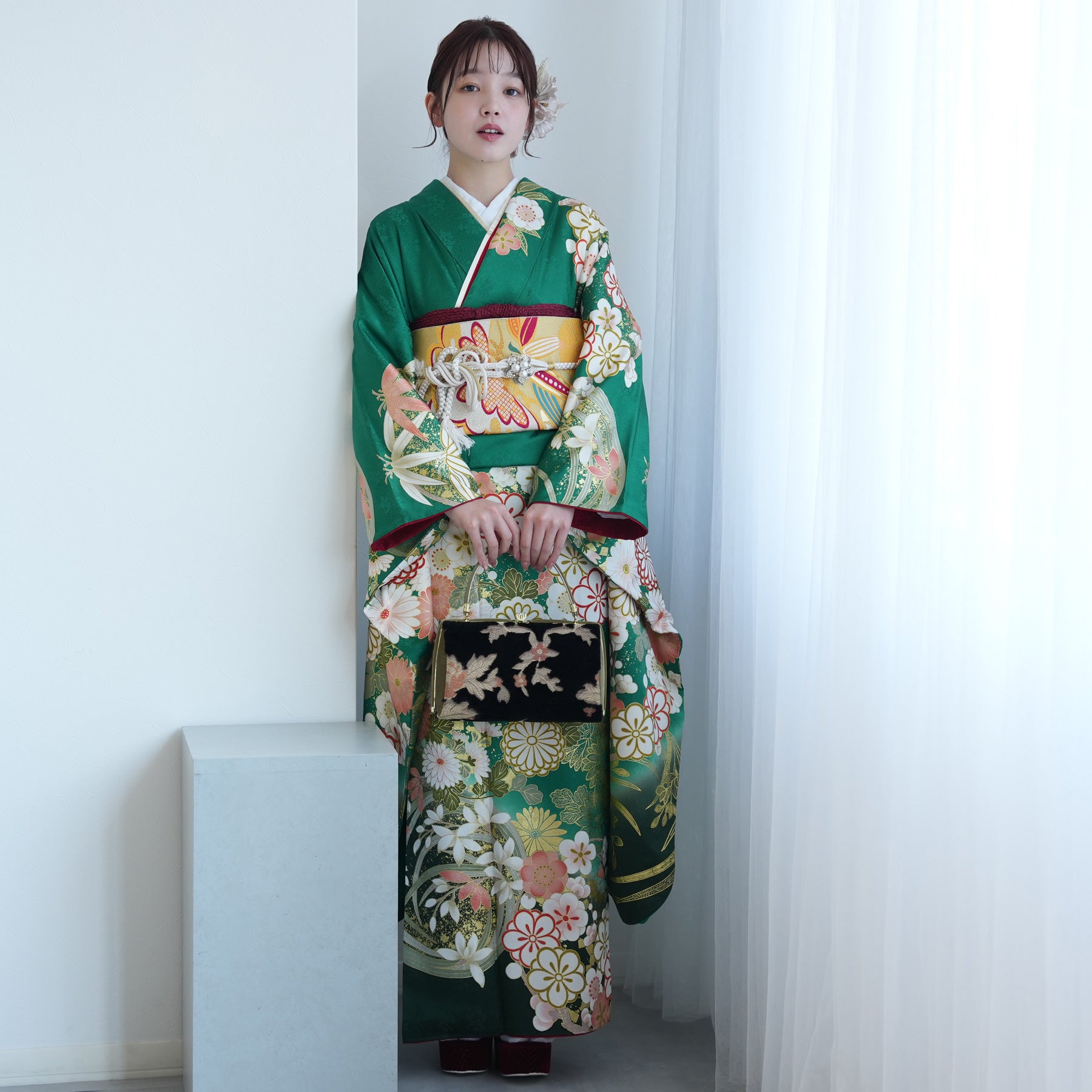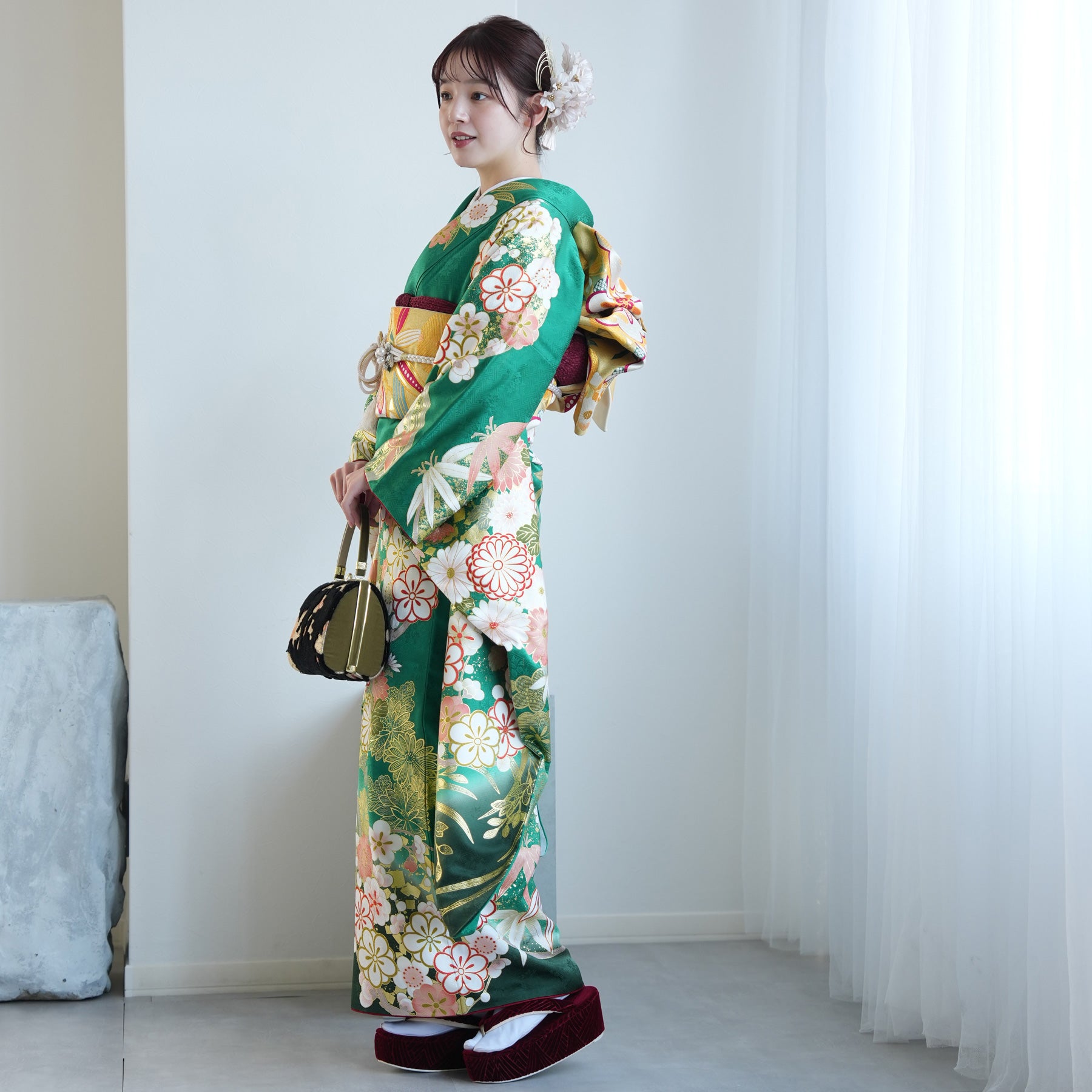 【レンタル】振袖 着物セット 正絹着物+正絹袋帯 成人式 晴れ着 記念撮影 往復送料無料 グリーンのアンティーク花(1000605200)