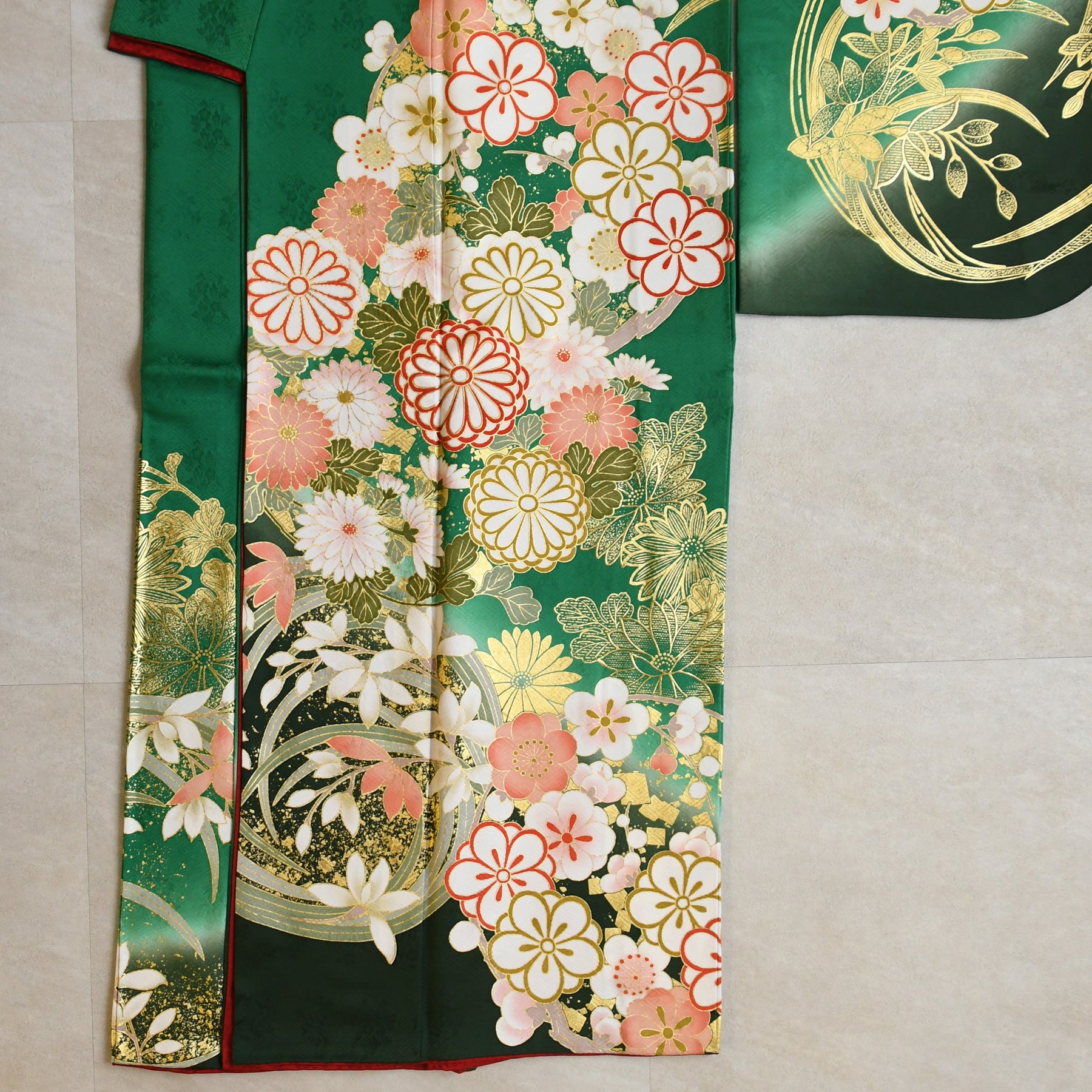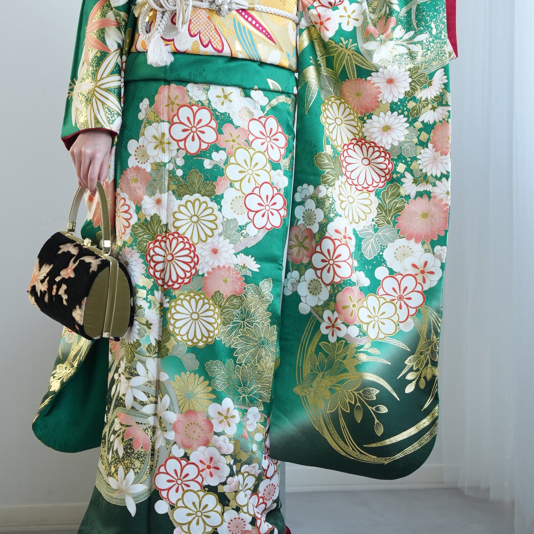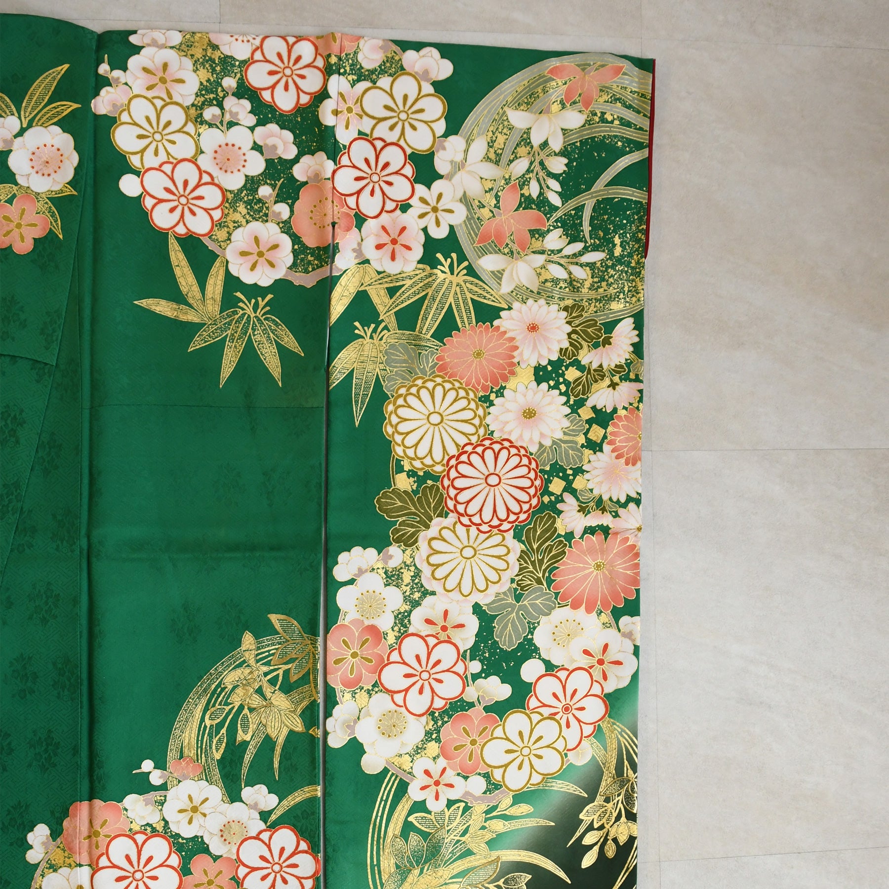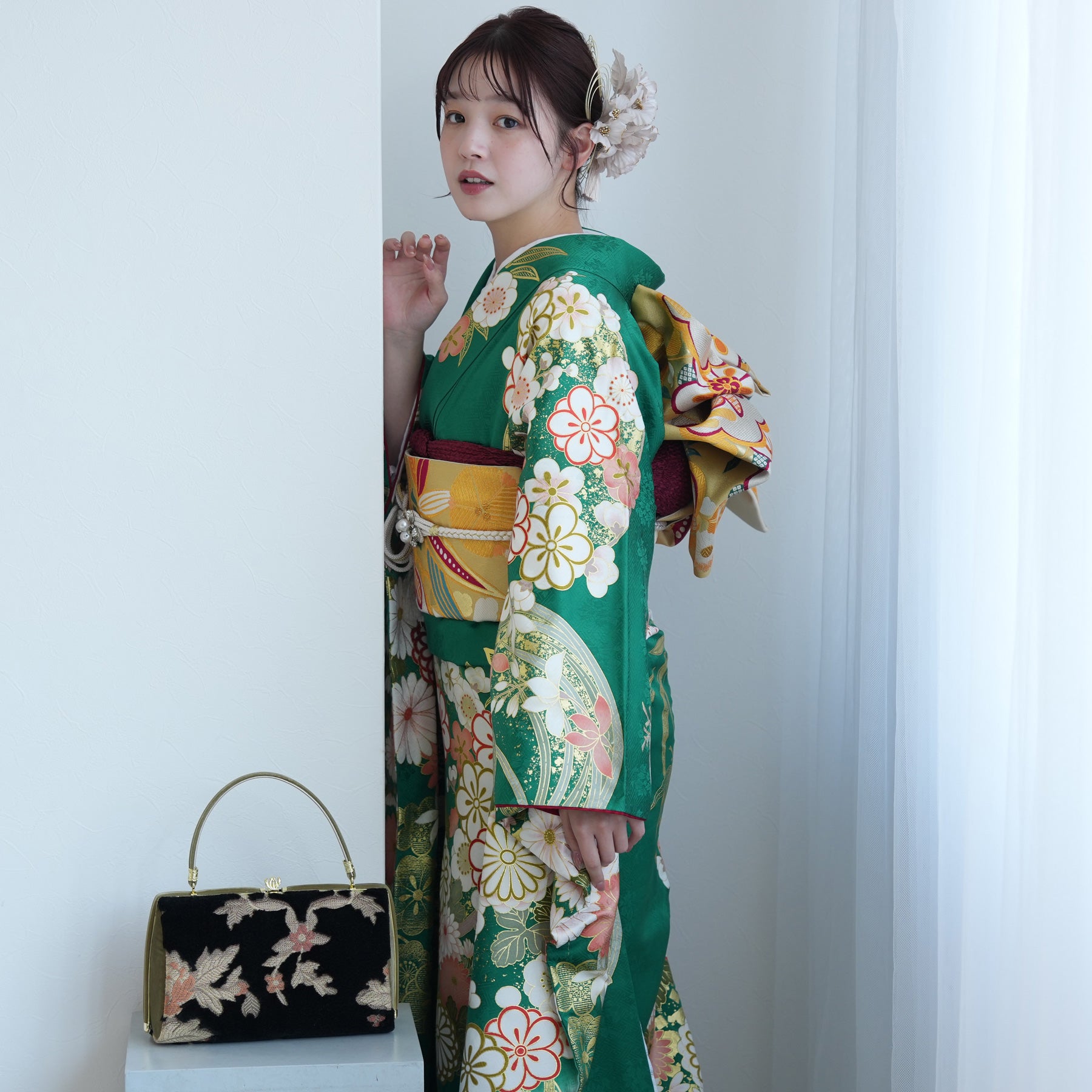 【レンタル】振袖 着物セット 正絹着物+正絹袋帯 成人式 晴れ着 記念撮影 往復送料無料 グリーンのアンティーク花(1000605200)