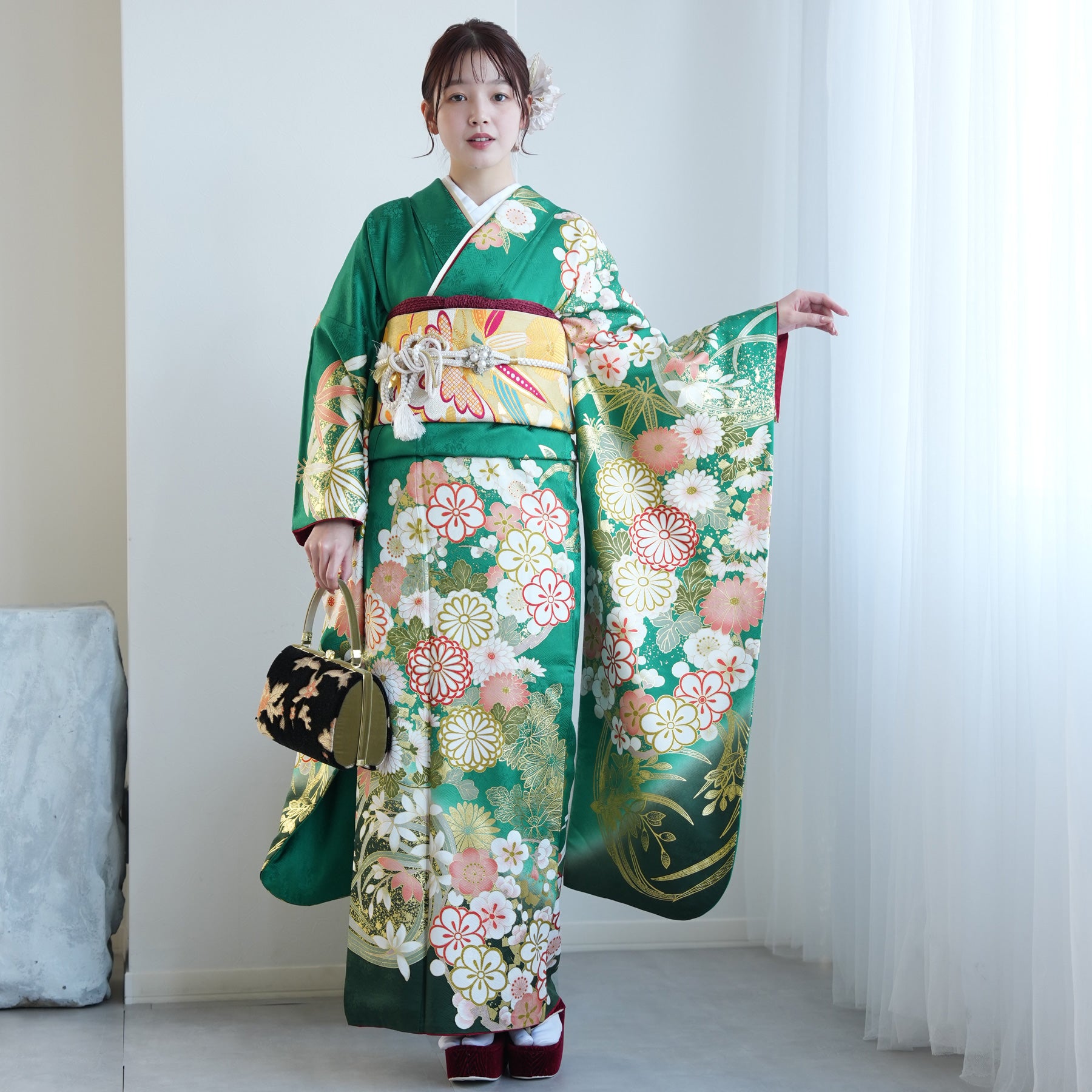 【レンタル】振袖 着物セット 正絹着物+正絹袋帯 成人式  晴れ着 記念撮影 往復送料無料 グリーンのアンティーク花(1000605200)