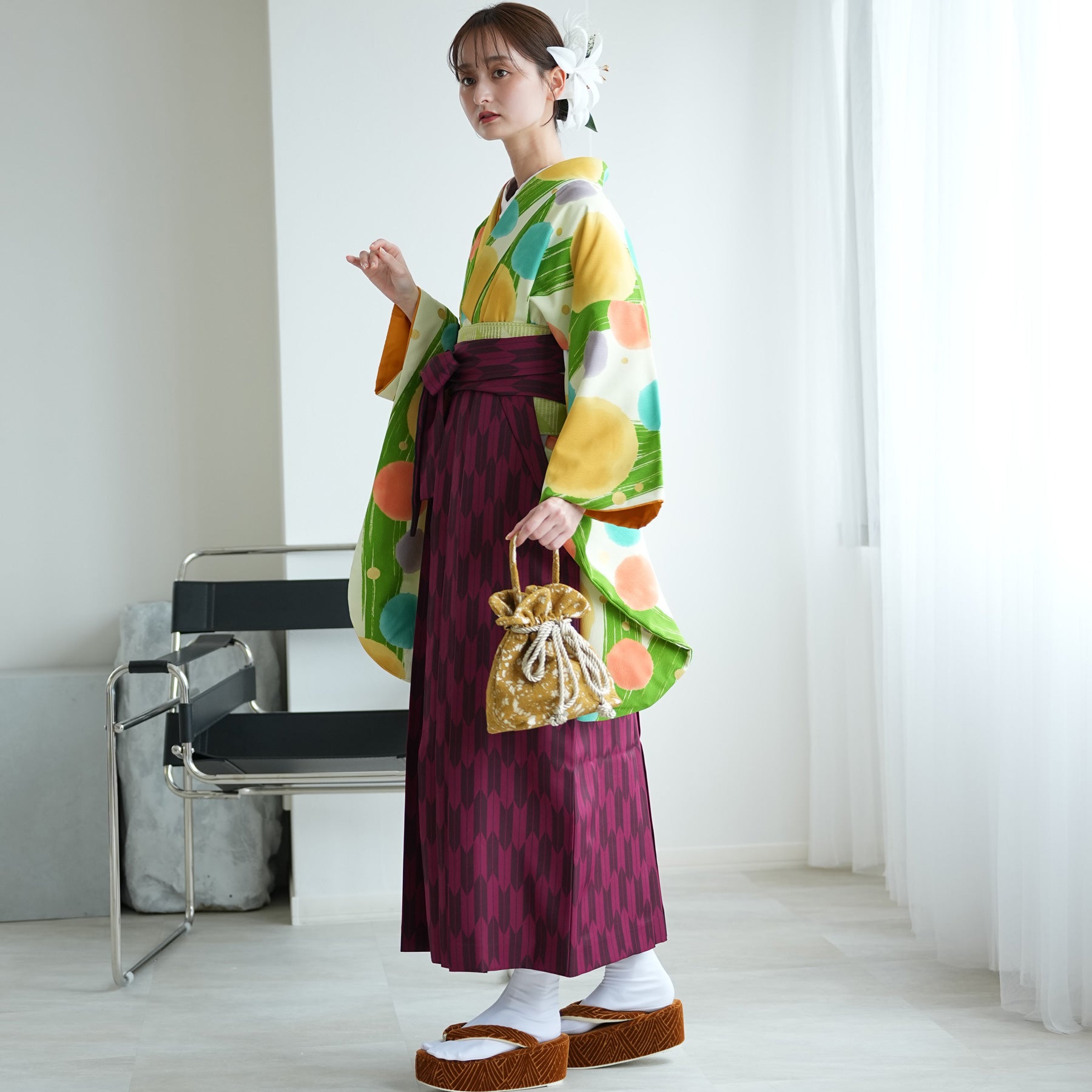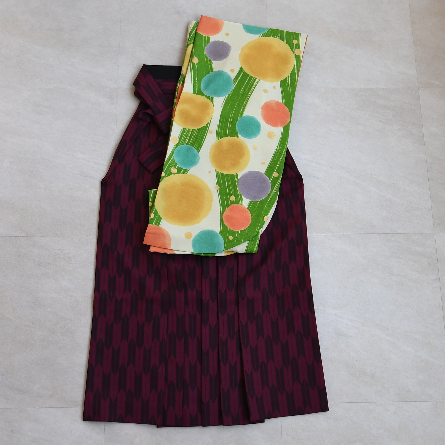 着物・袴・草履・バッグ・重ね襟・半巾帯・肌襦袢+長襦袢一体化インナー(白無地半襟付き)・前板・着付けベルト・ウエストベルト・腰ひも3本セット・伊達締め ・マジックベルト・衿芯・足袋(プレゼント)
