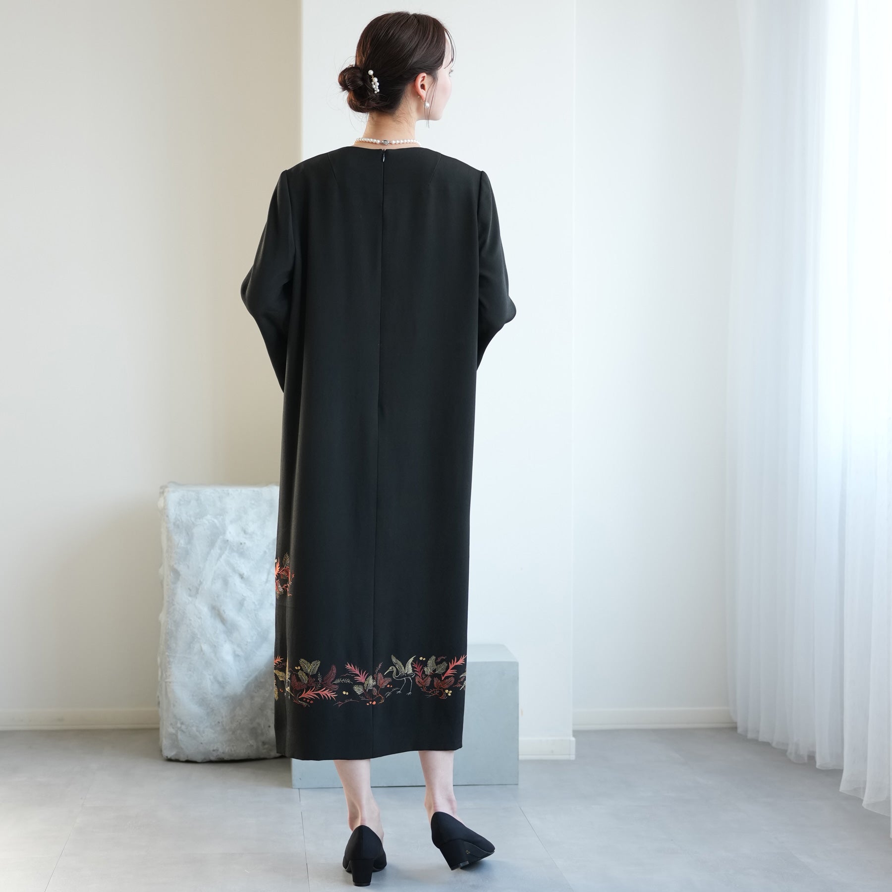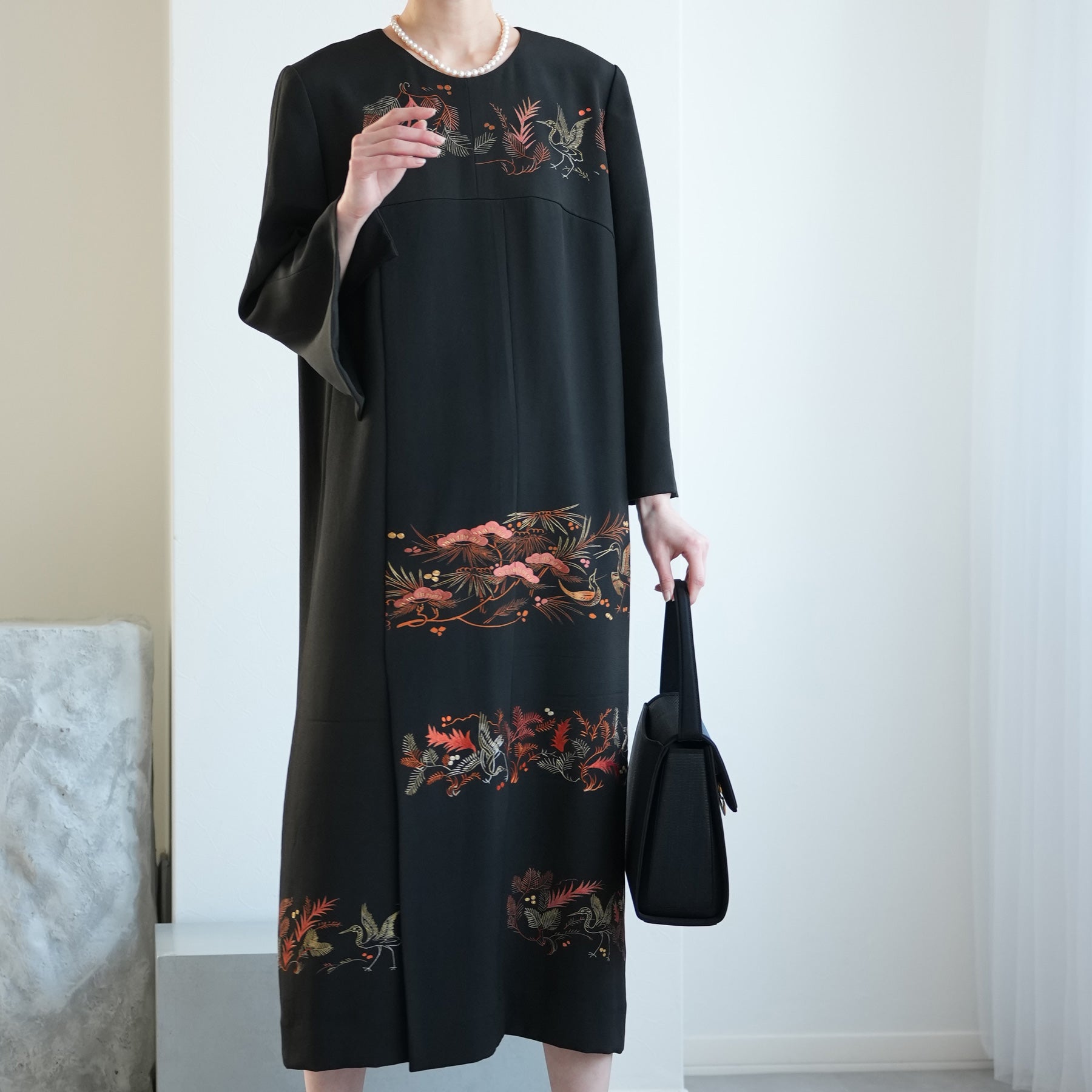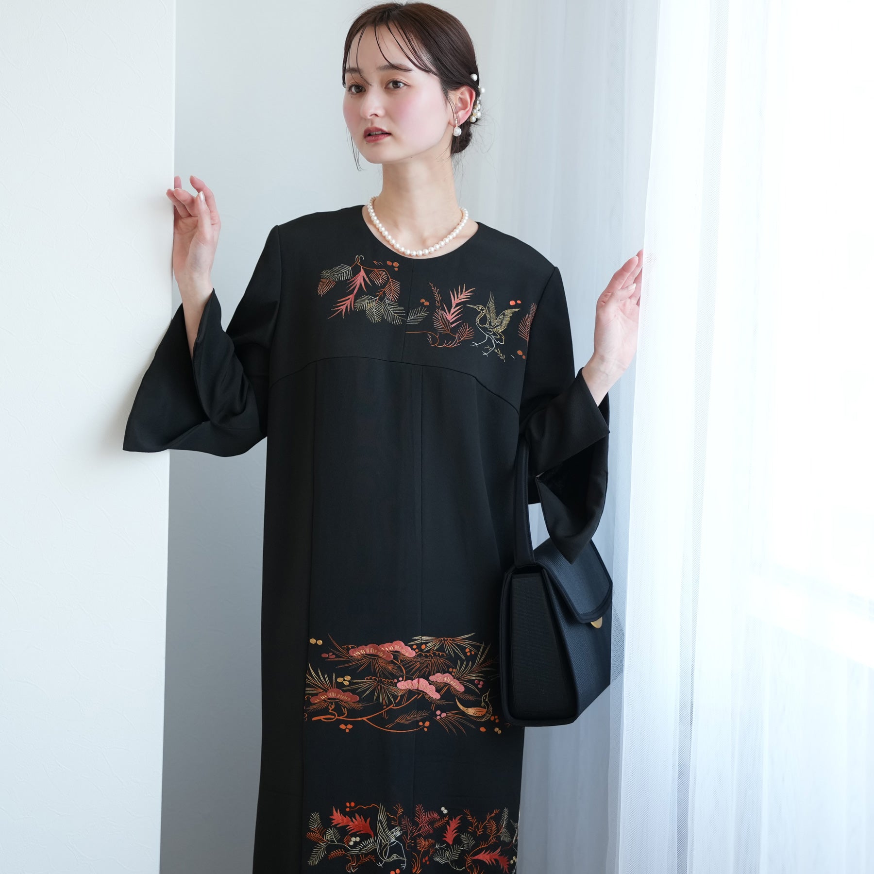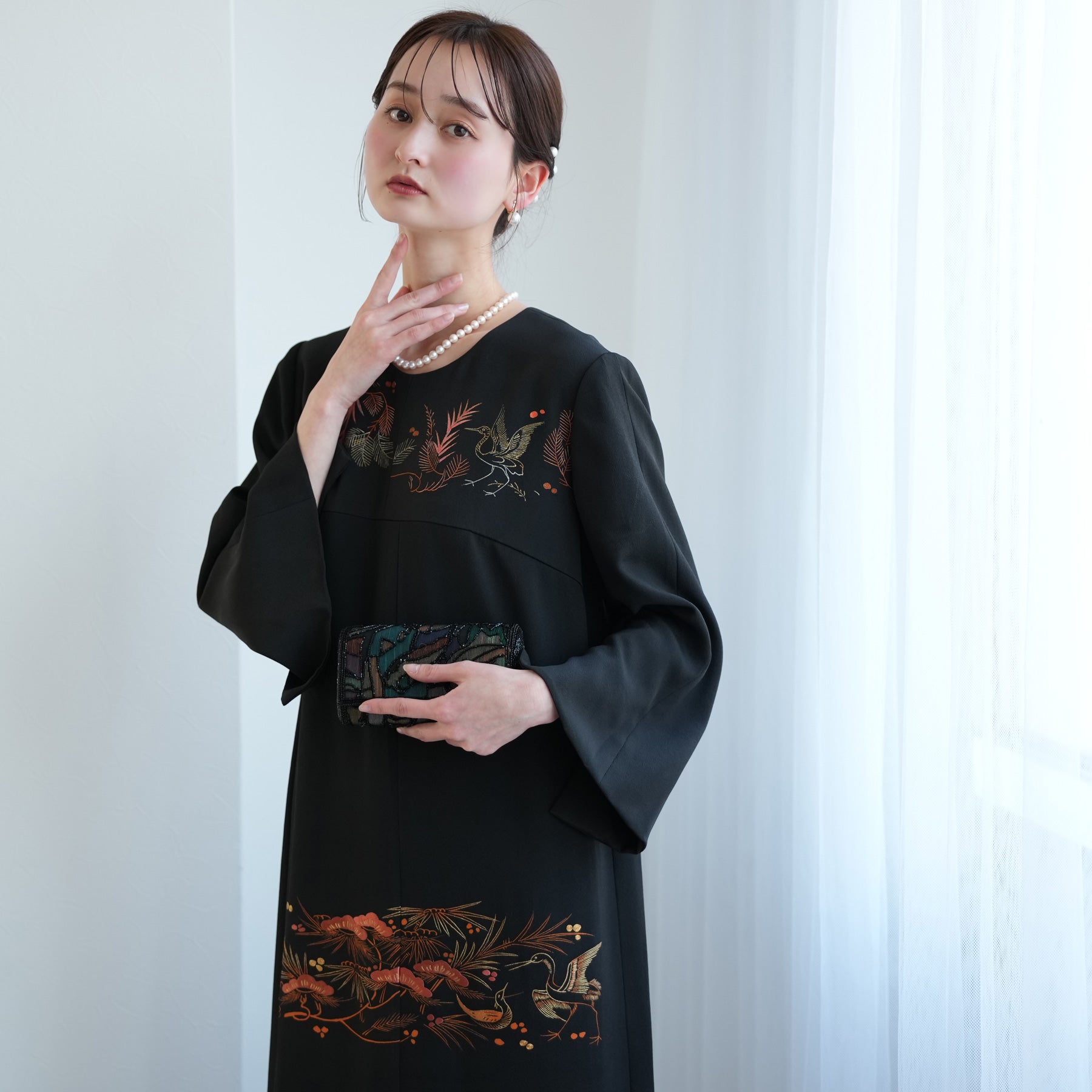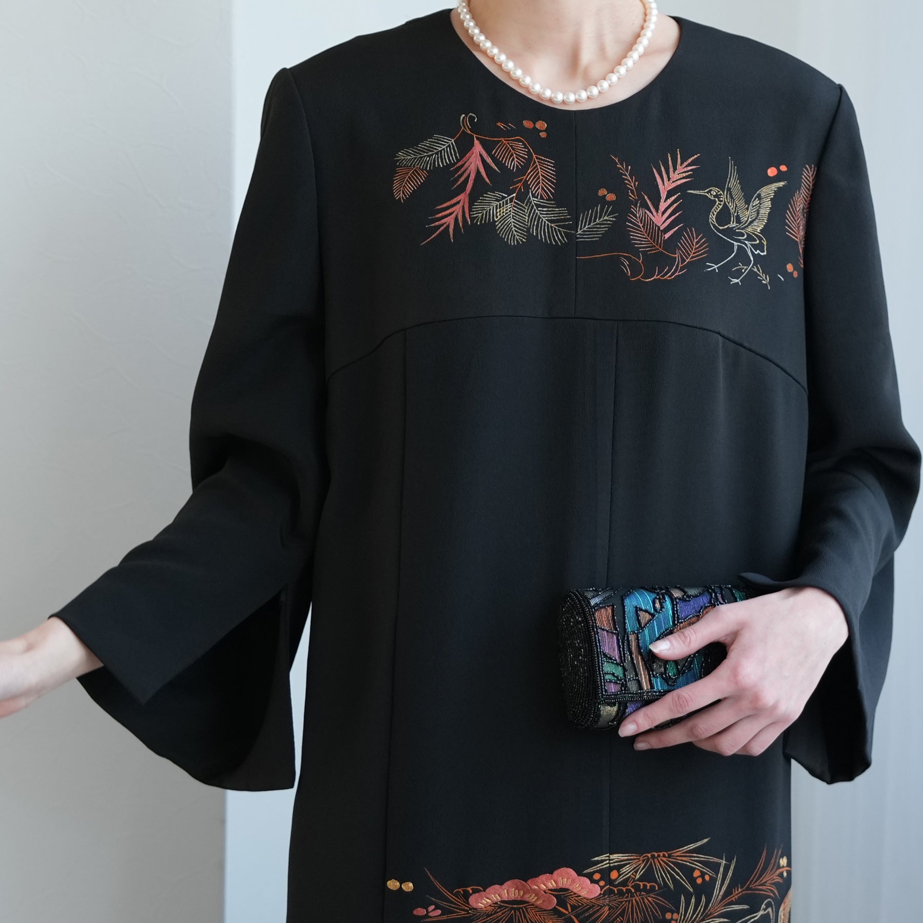 日本の伝統衣装である留袖の美しさをそのままに、洋装として仕立てることで、着物に引けを取らない格調と華やかさを実現しました。