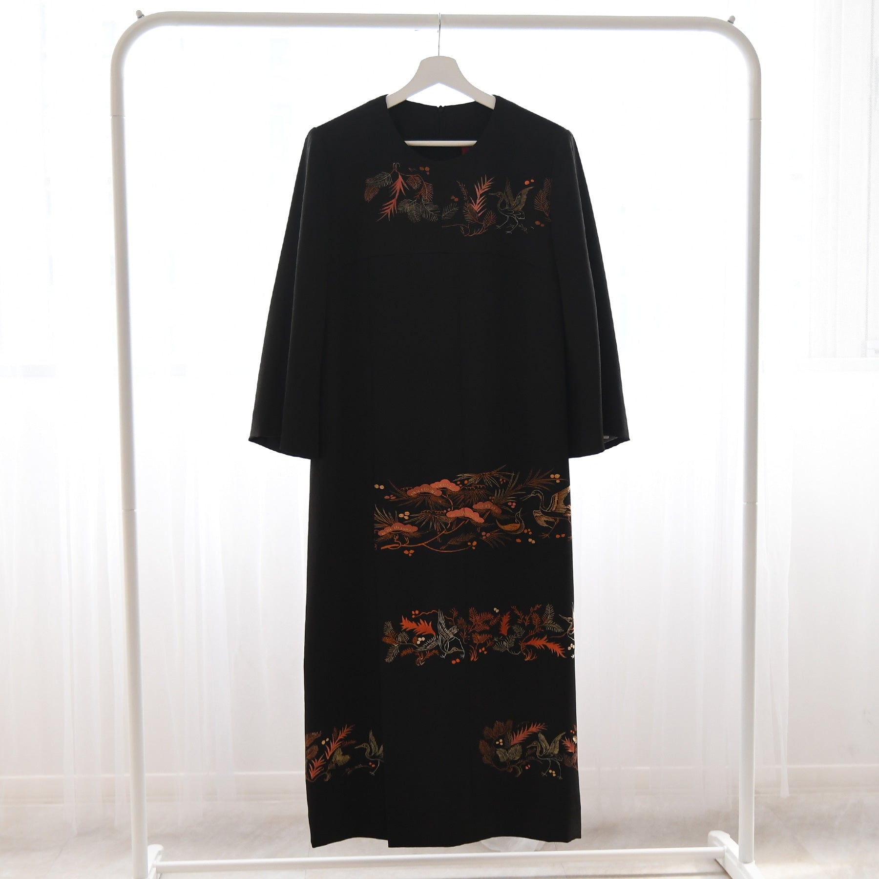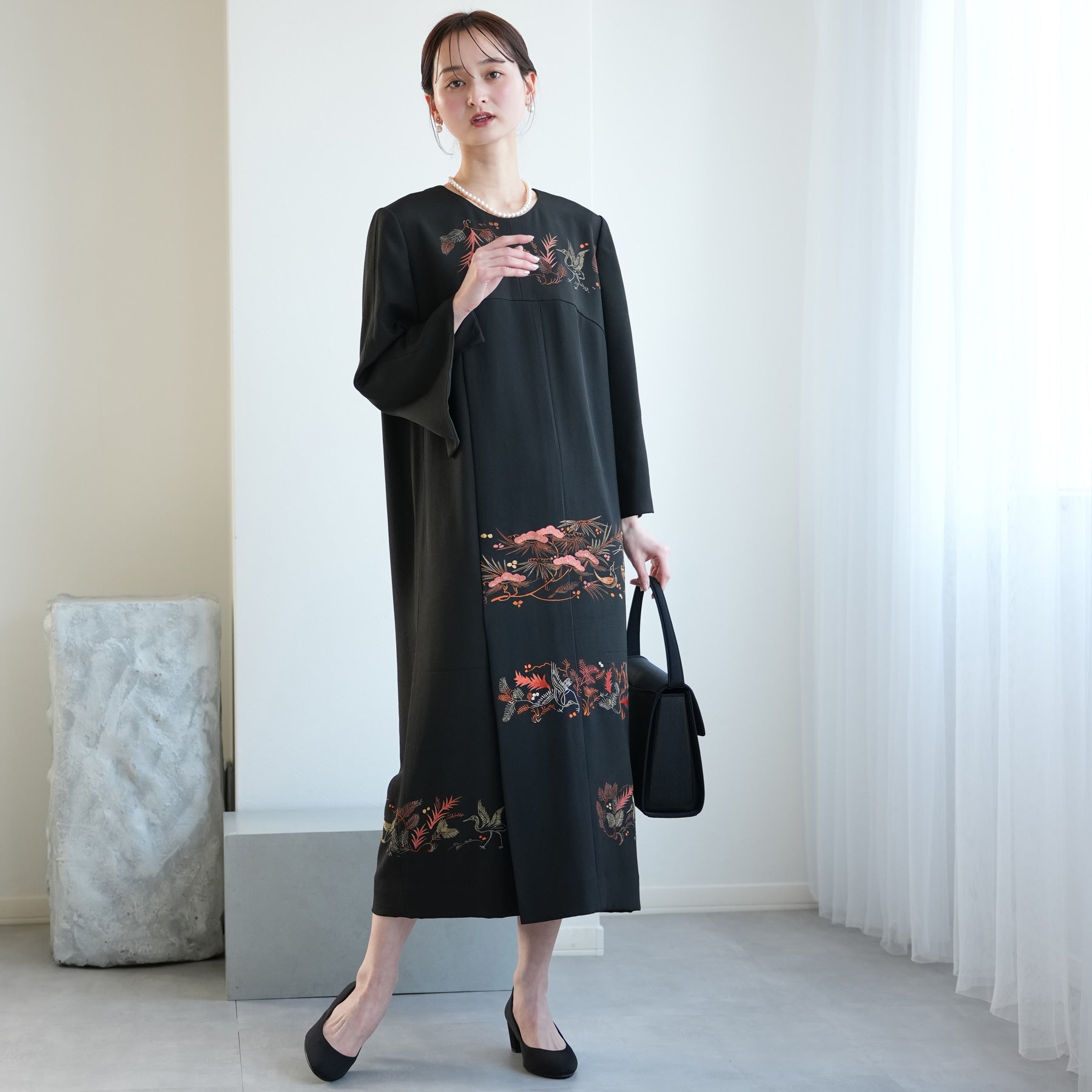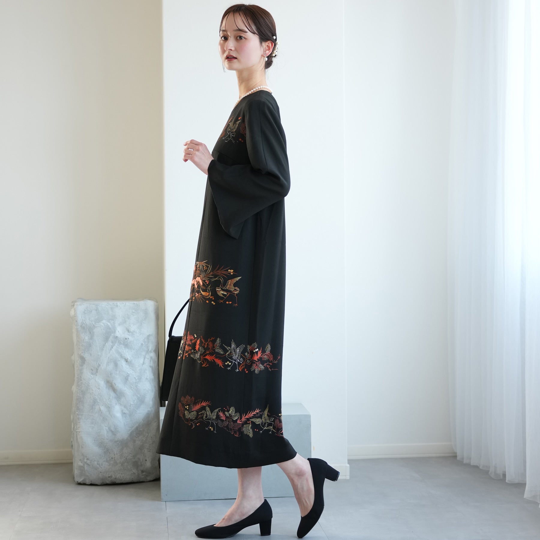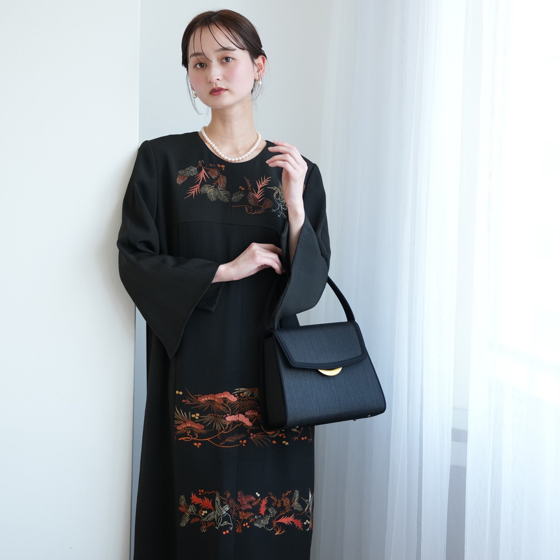 日本の伝統衣装である留袖の美しさをそのままに、洋装として仕立てることで、着物に引けを取らない格調と華やかさを実現しました。