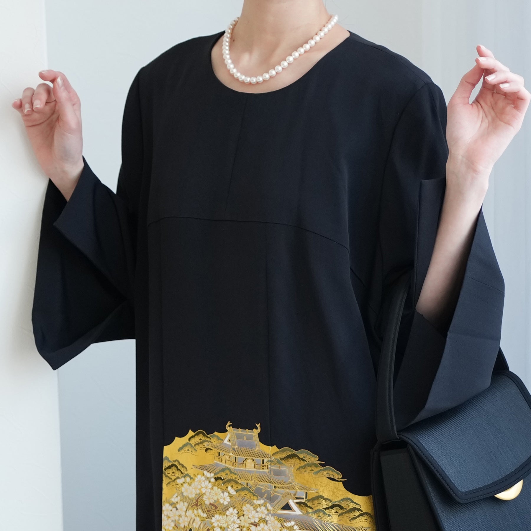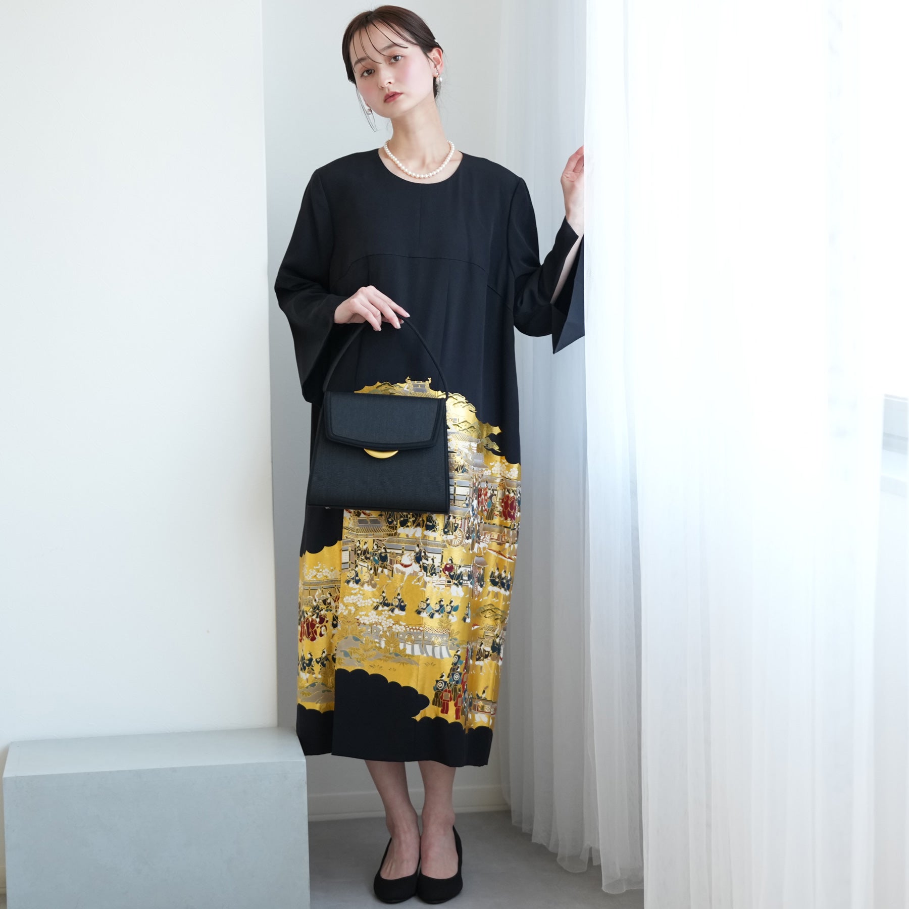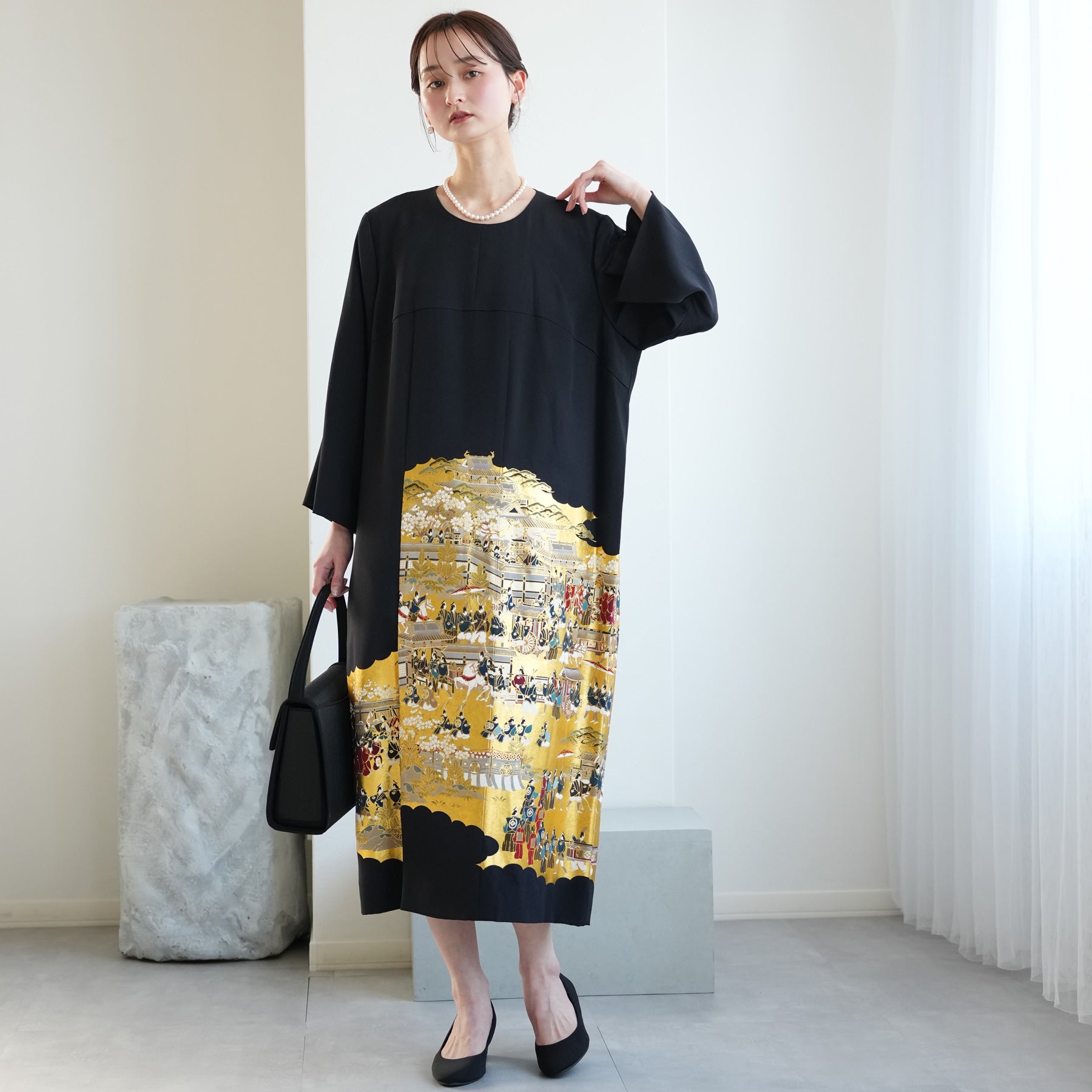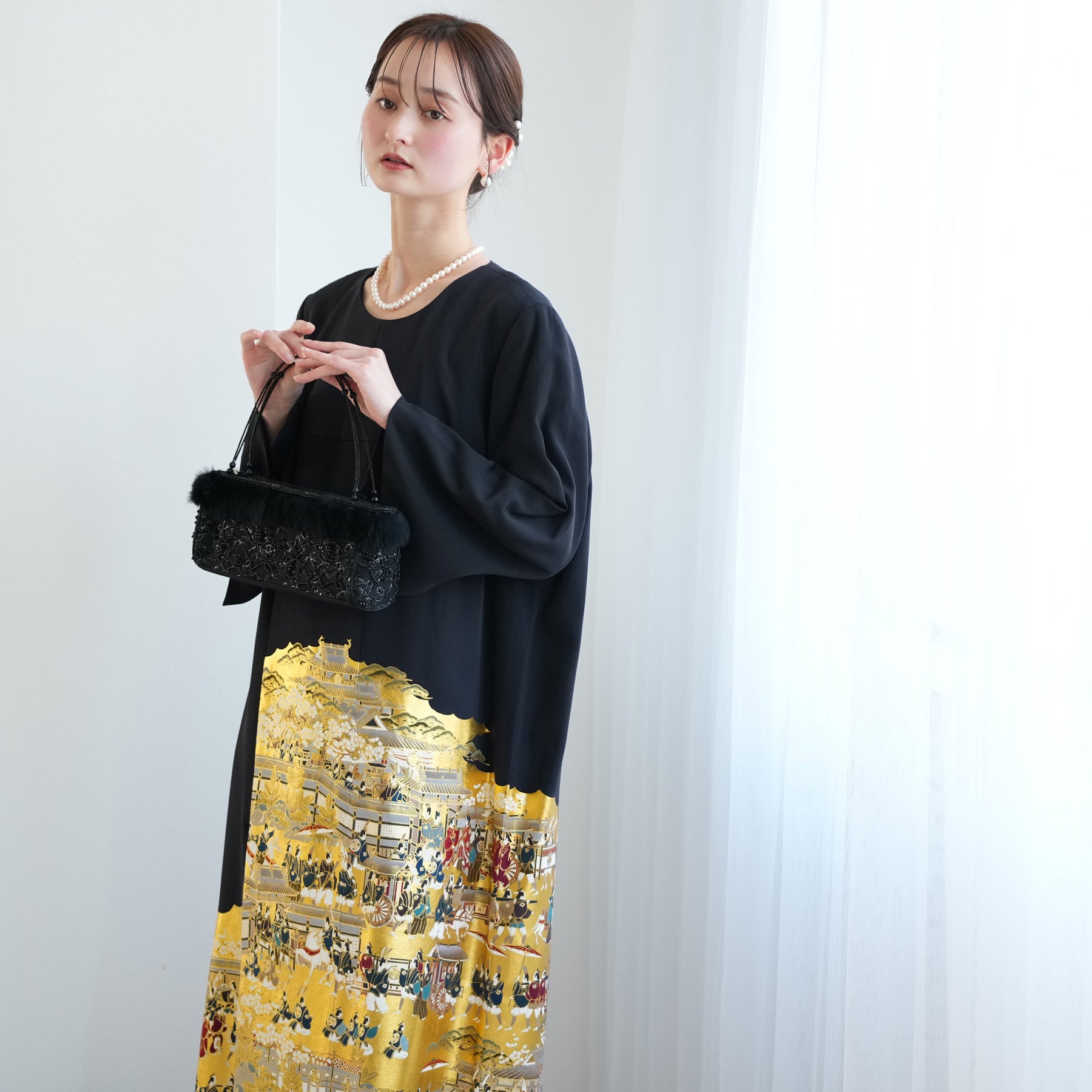 日本の伝統衣装である留袖の美しさをそのままに、洋装として仕立てることで、着物に引けを取らない格調と華やかさを実現しました。