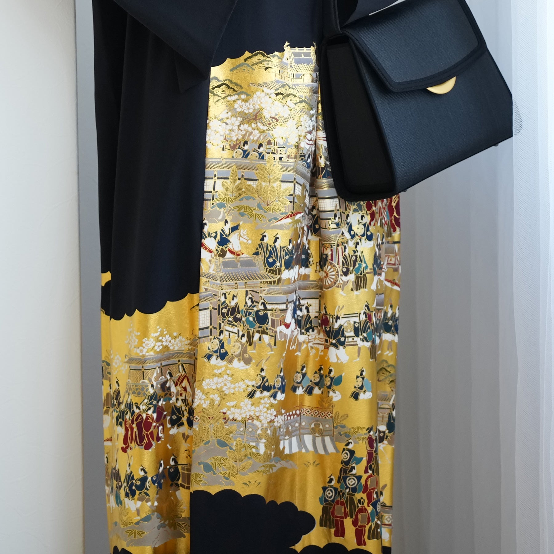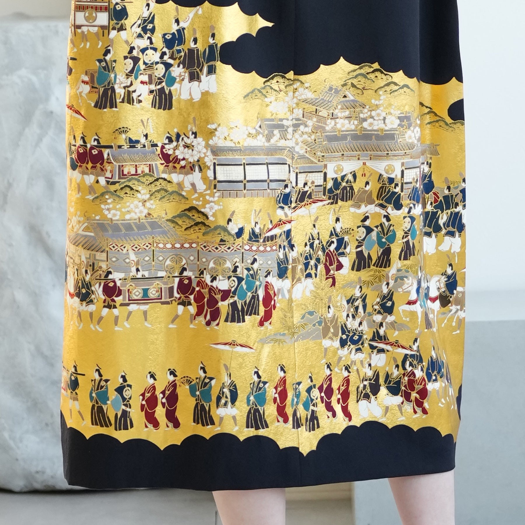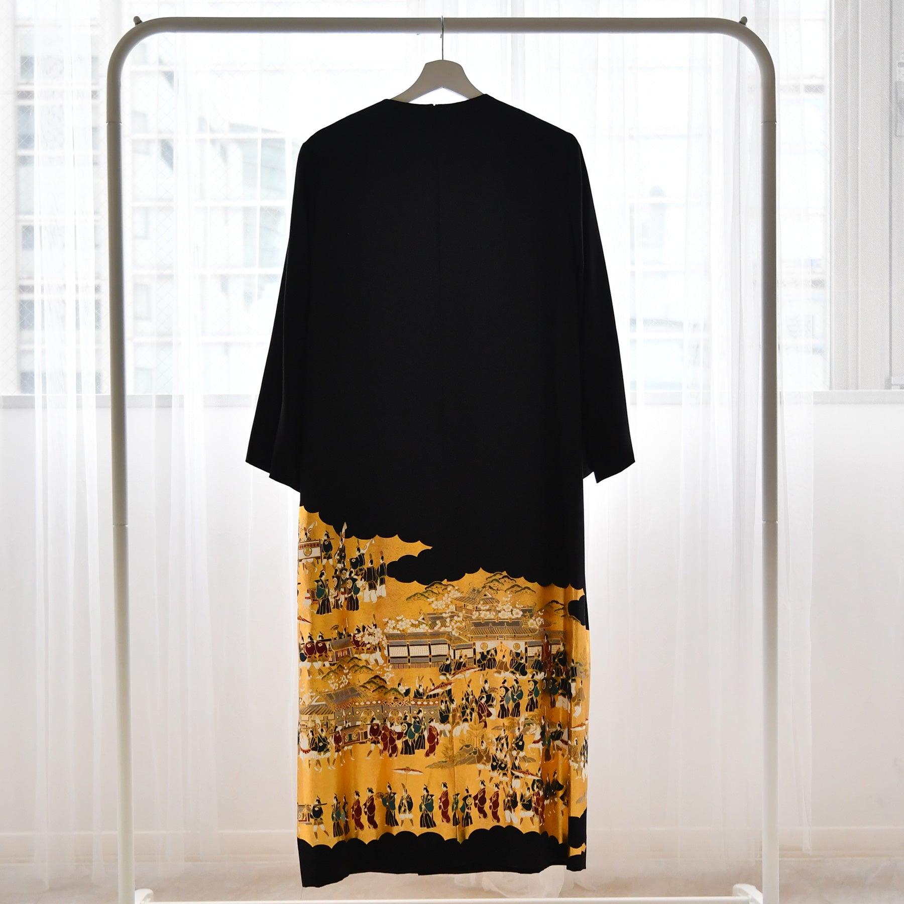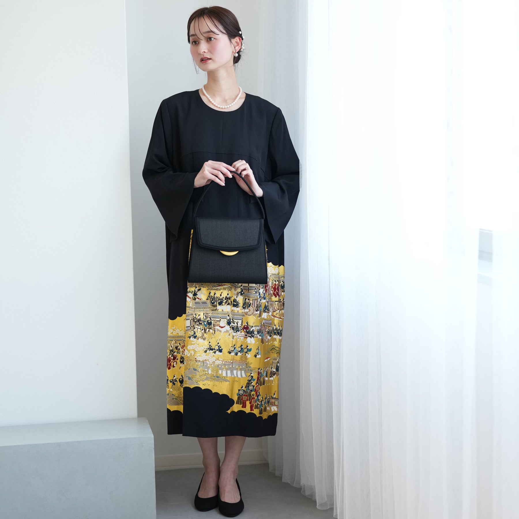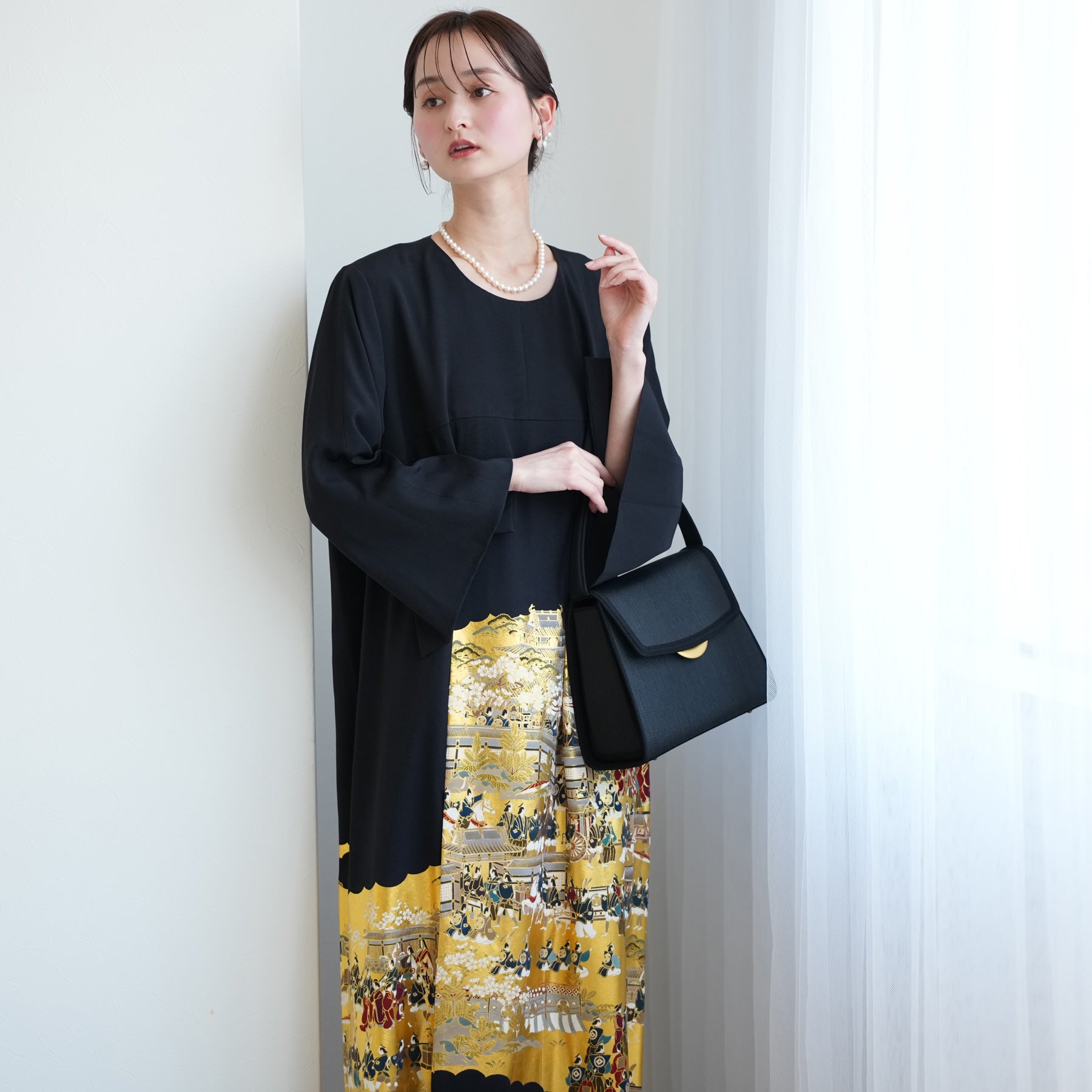 日本の伝統衣装である留袖の美しさをそのままに、洋装として仕立てることで、着物に引けを取らない格調と華やかさを実現しました。