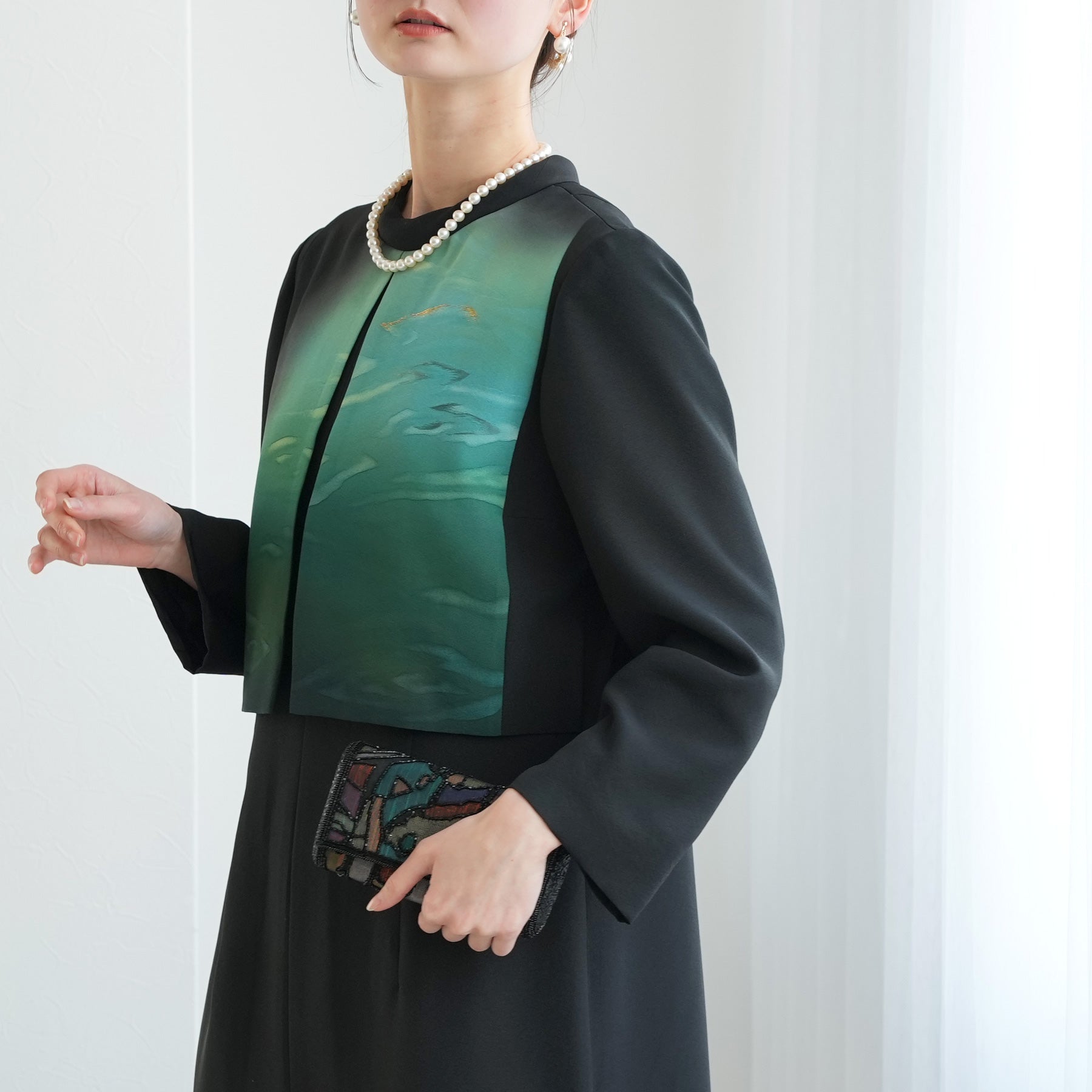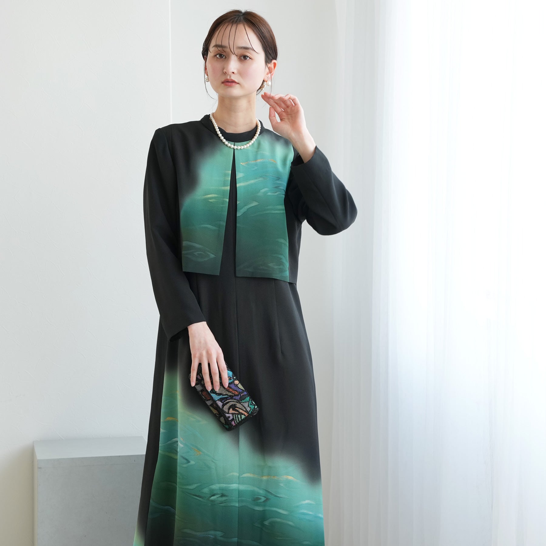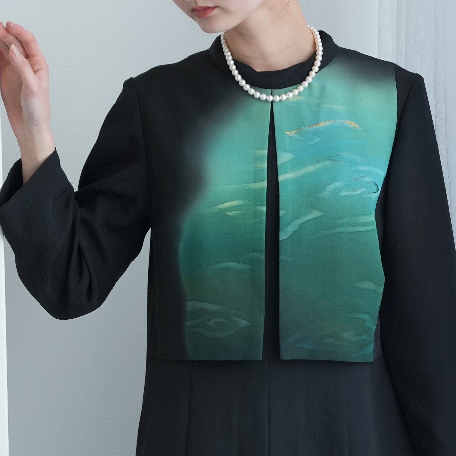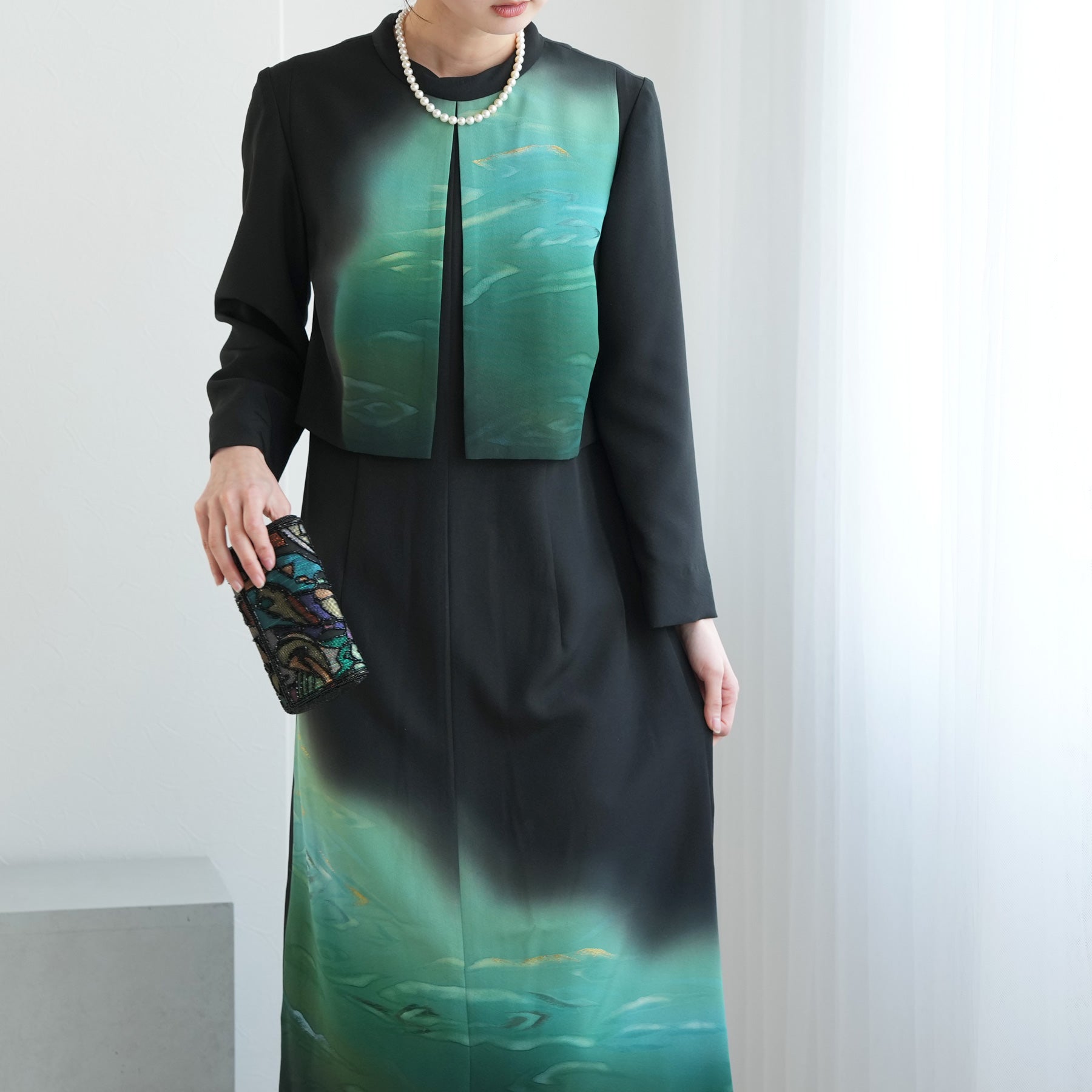 日本の伝統衣装である留袖の美しさをそのままに、洋装として仕立てることで、着物に引けを取らない格調と華やかさを実現しました。