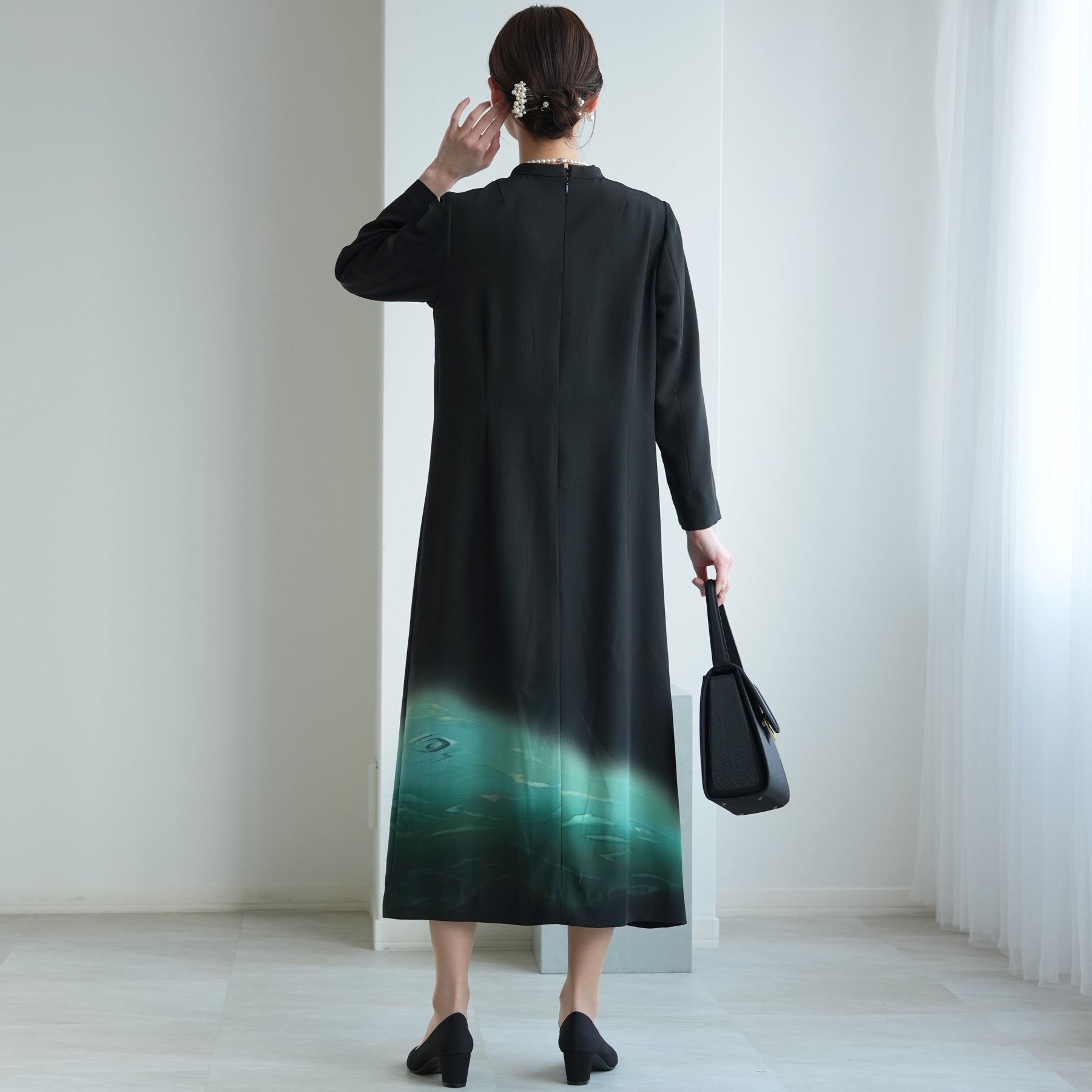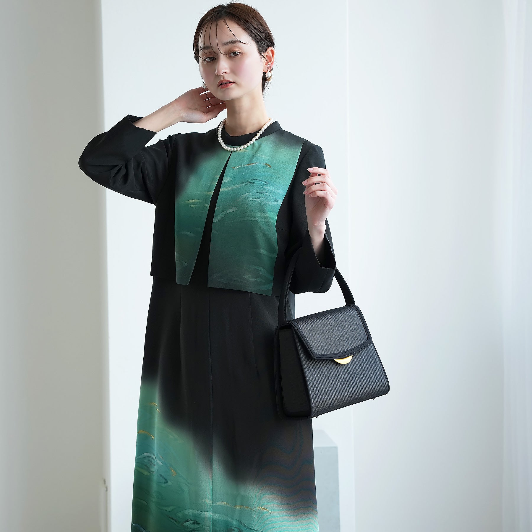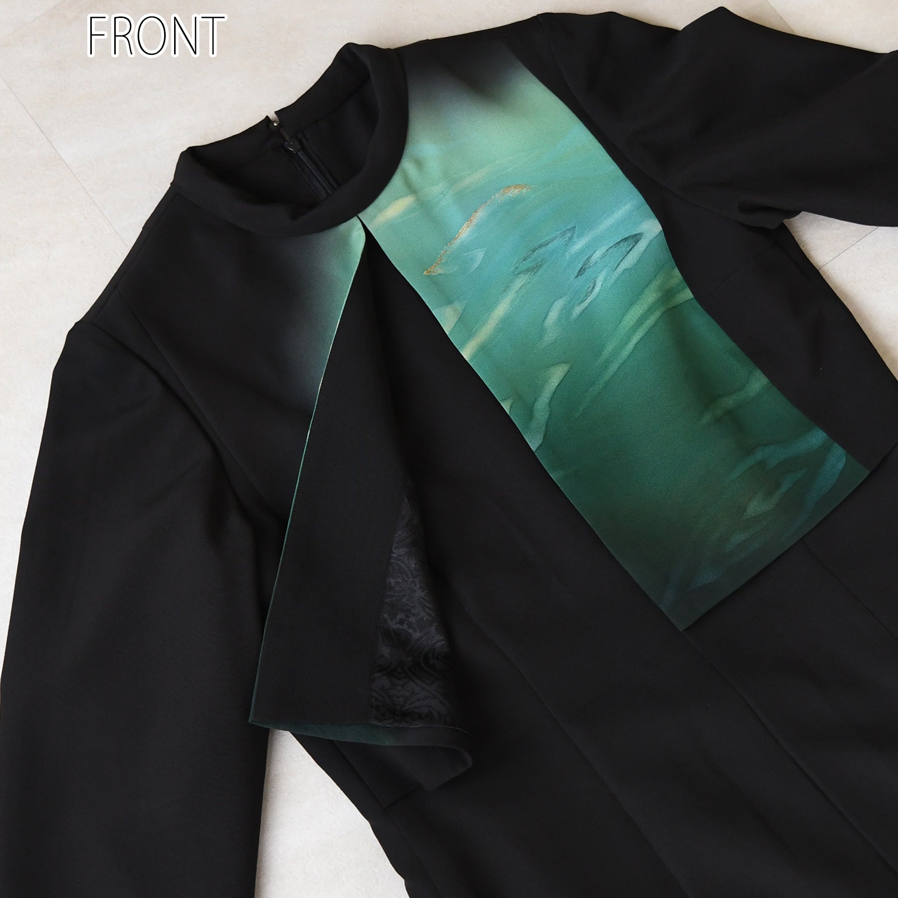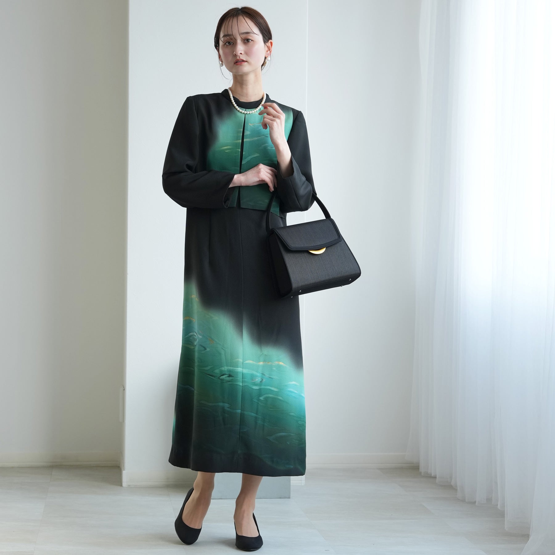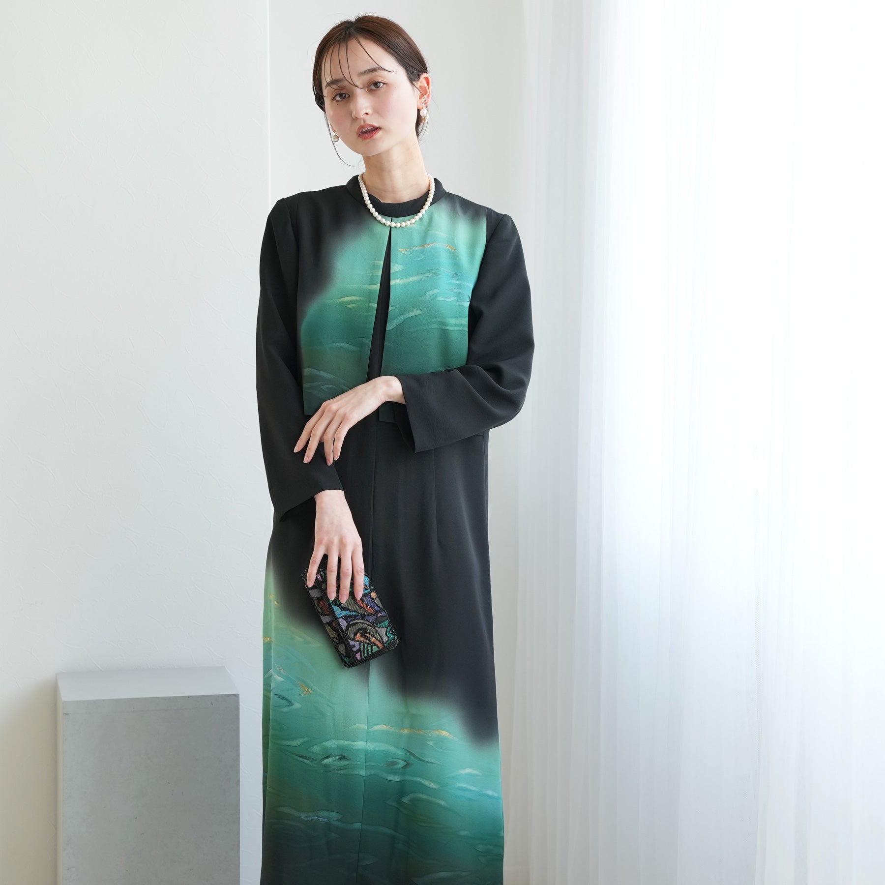 日本の伝統衣装である留袖の美しさをそのままに、洋装として仕立てることで、着物に引けを取らない格調と華やかさを実現しました。