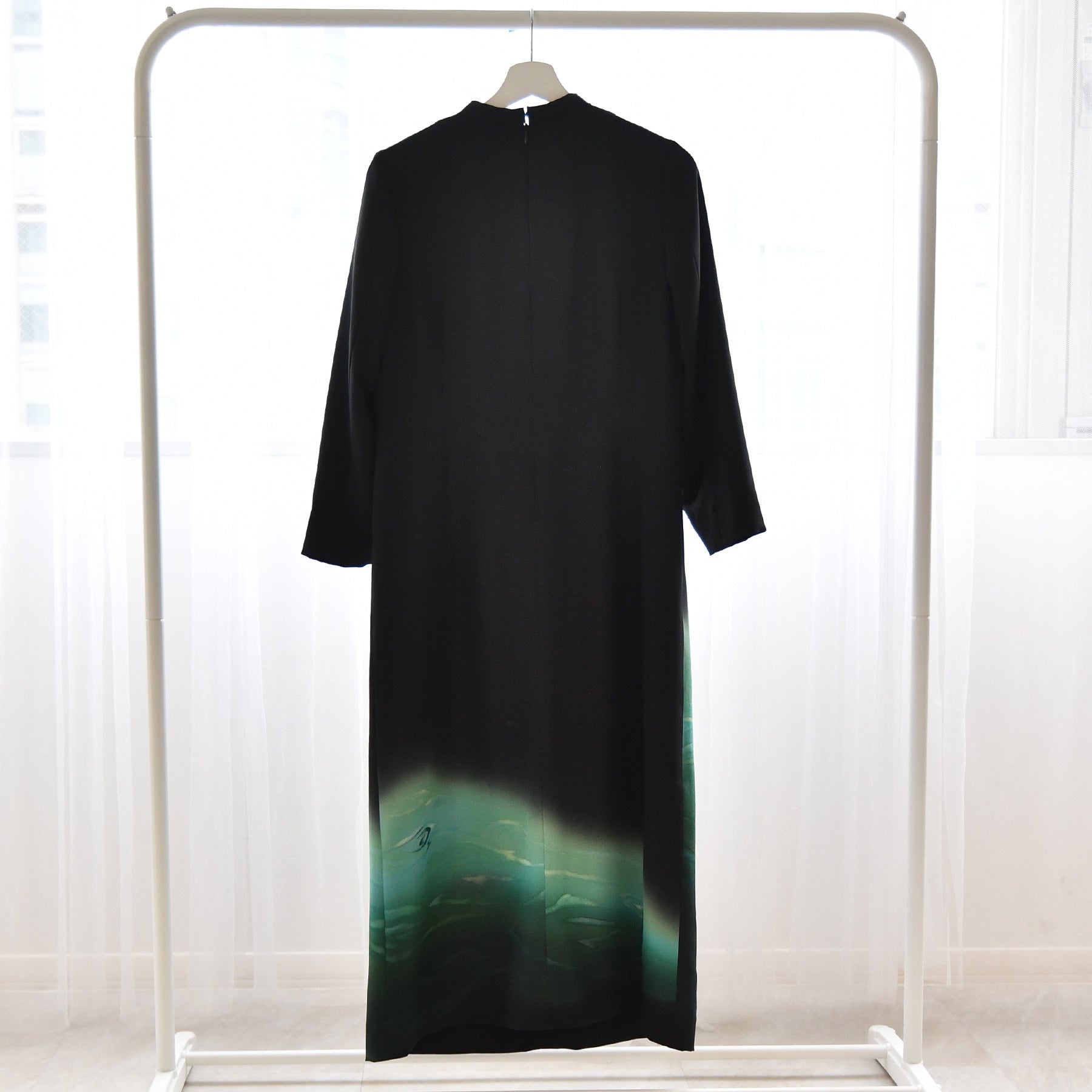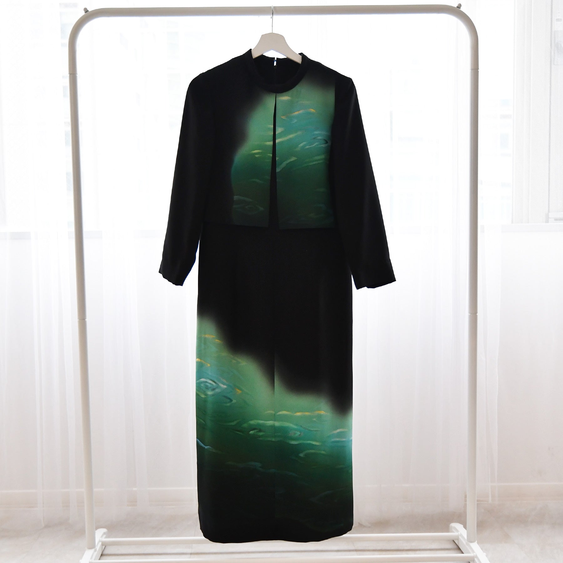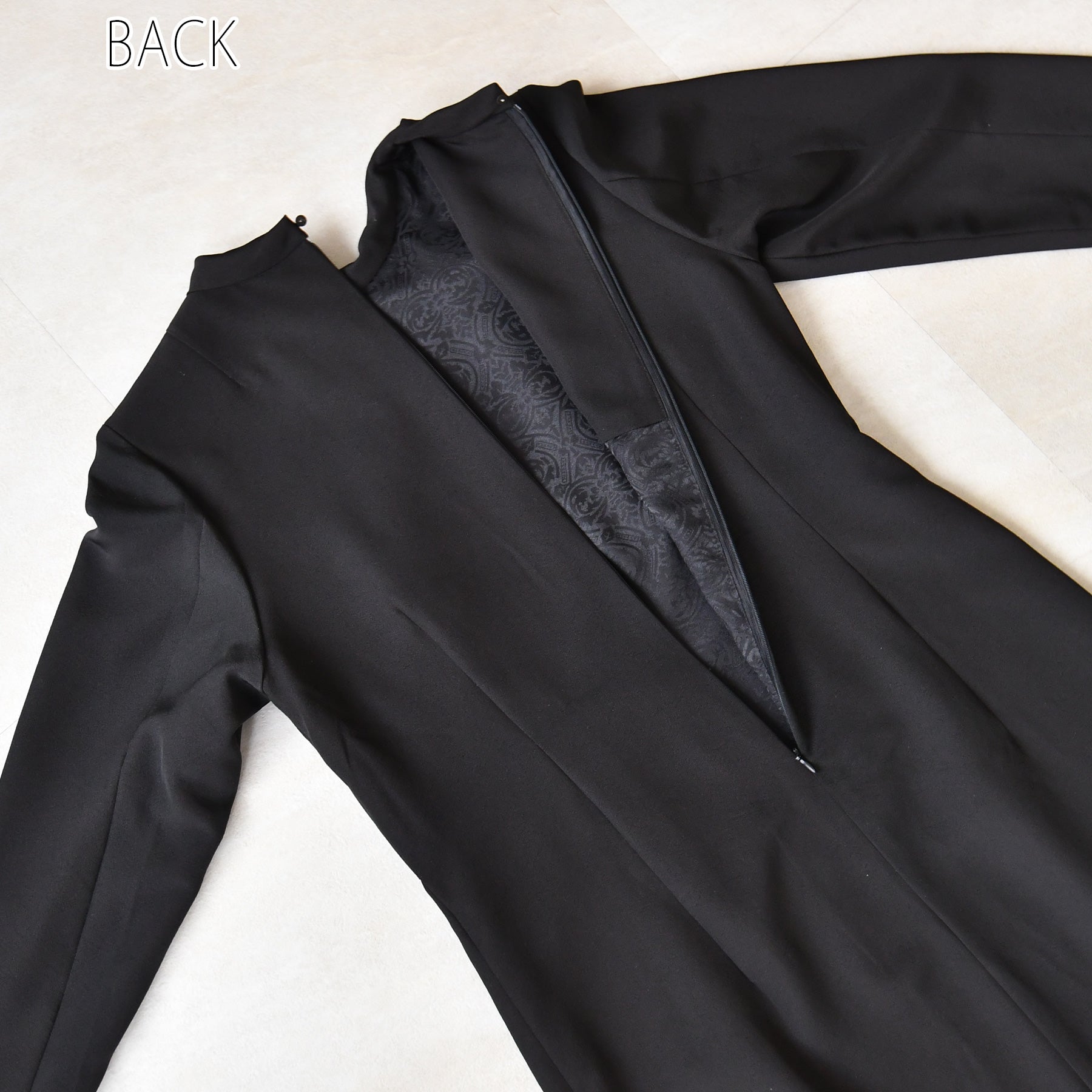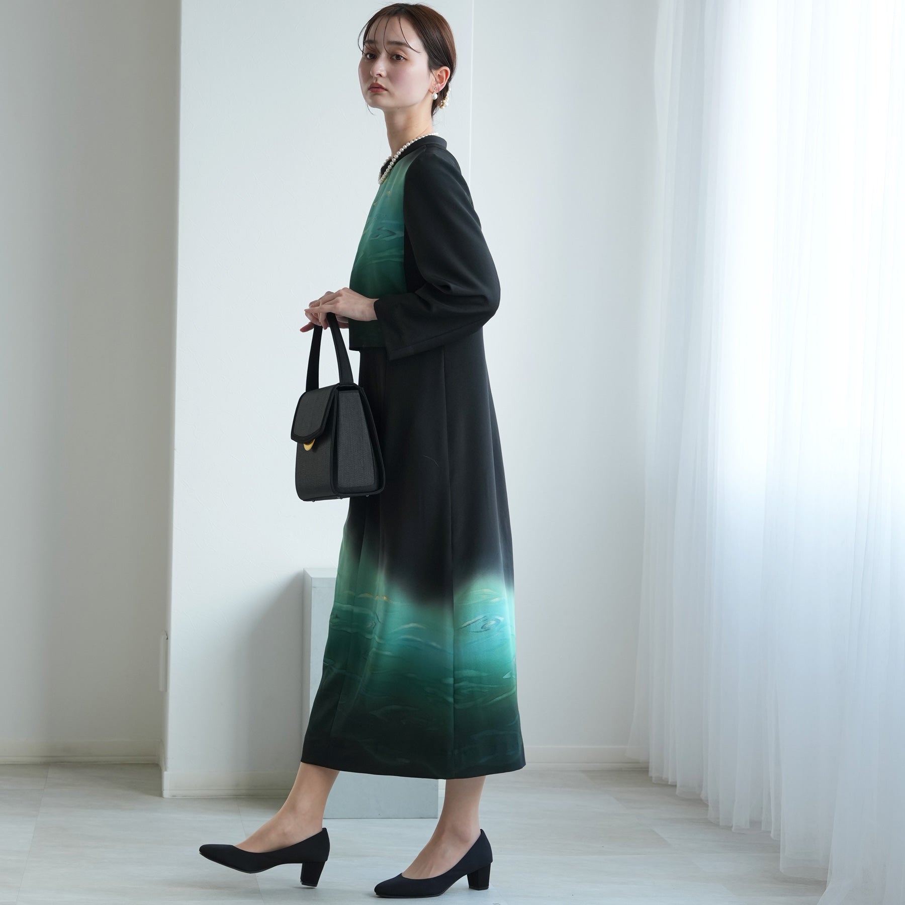 日本の伝統衣装である留袖の美しさをそのままに、洋装として仕立てることで、着物に引けを取らない格調と華やかさを実現しました。