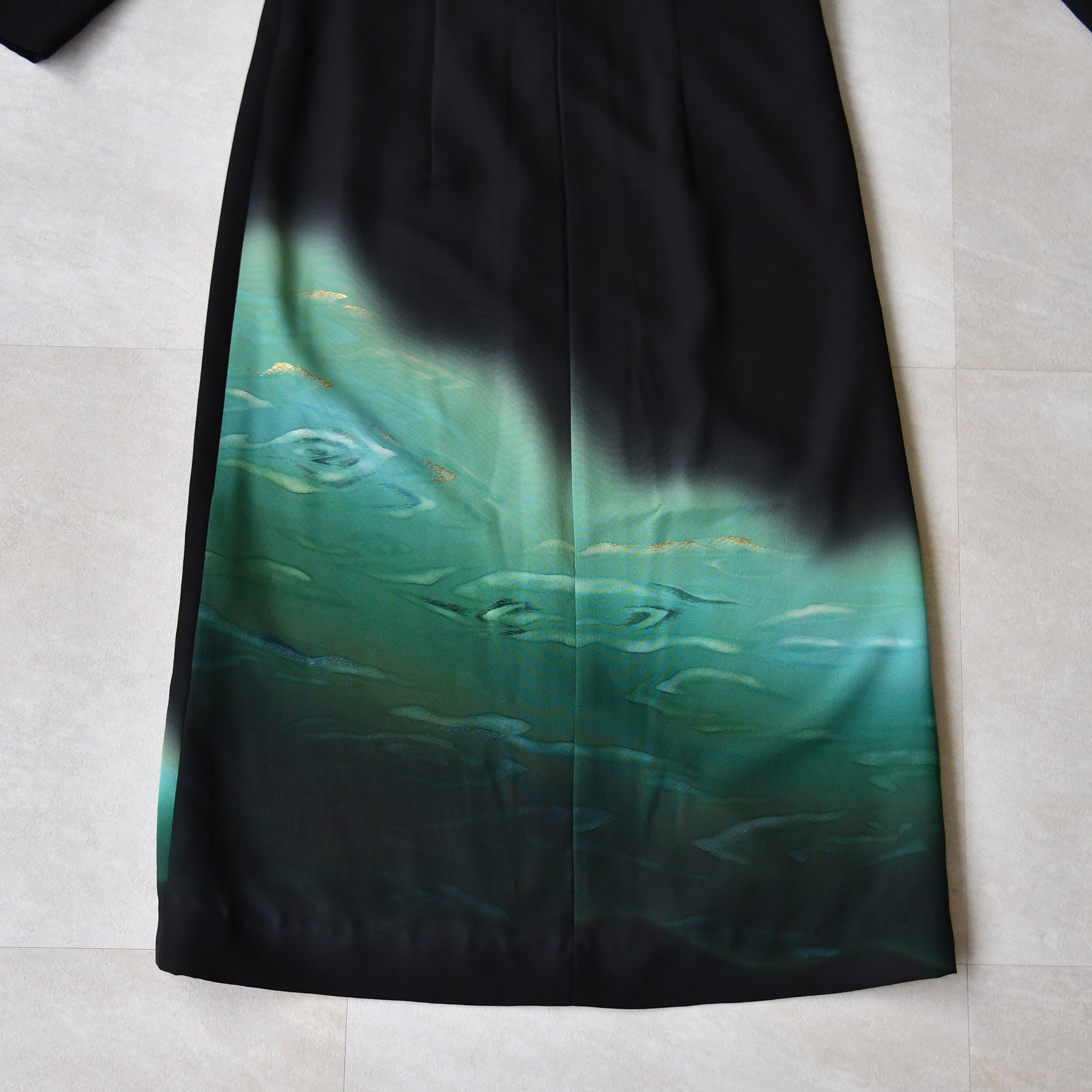 裾元に広がる絵柄は、祝いの席にふさわしい優雅な存在感を放ち、控えめながらも凛とした印象を演出します。和の伝統とドレスの洗練が調和した、特別な日のためのフォーマルウェアです。