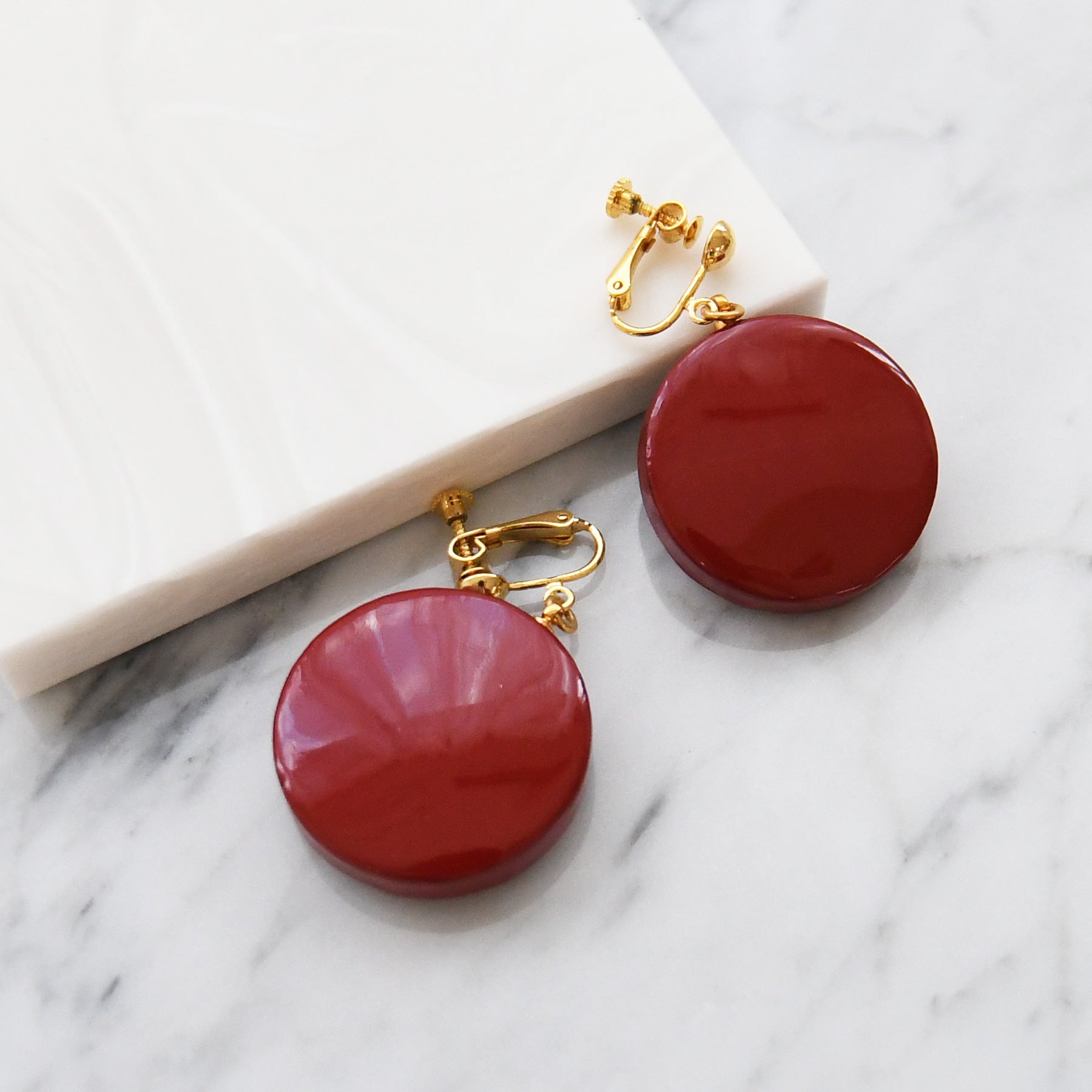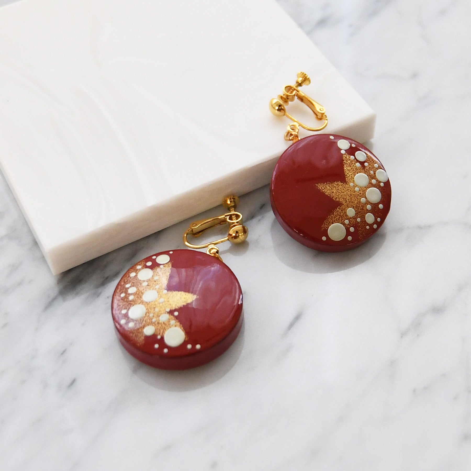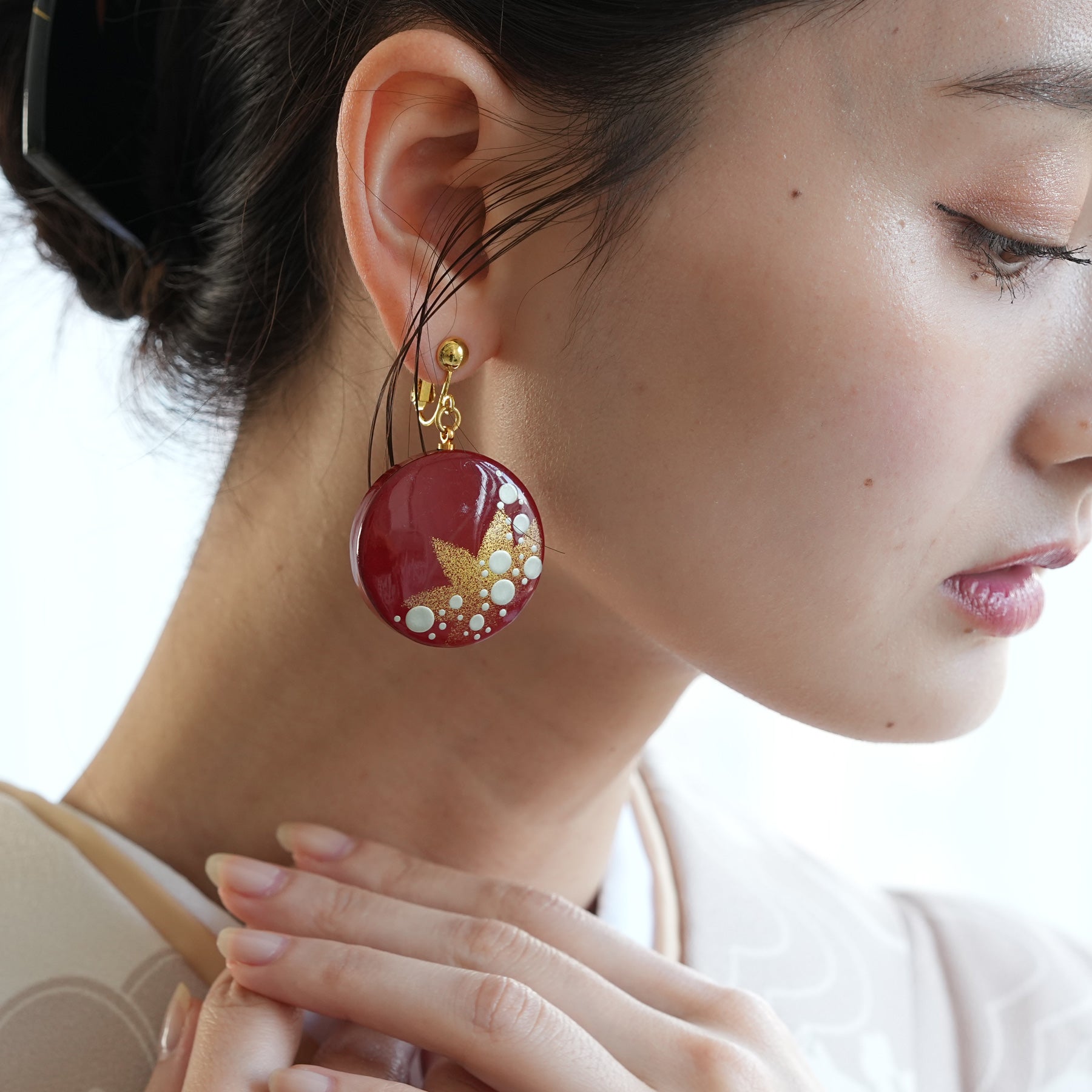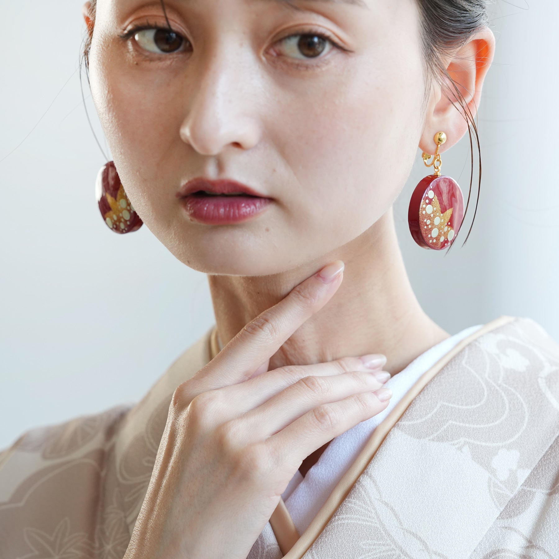 深みのある紅色に、金箔の輝きを添えたイヤリング。