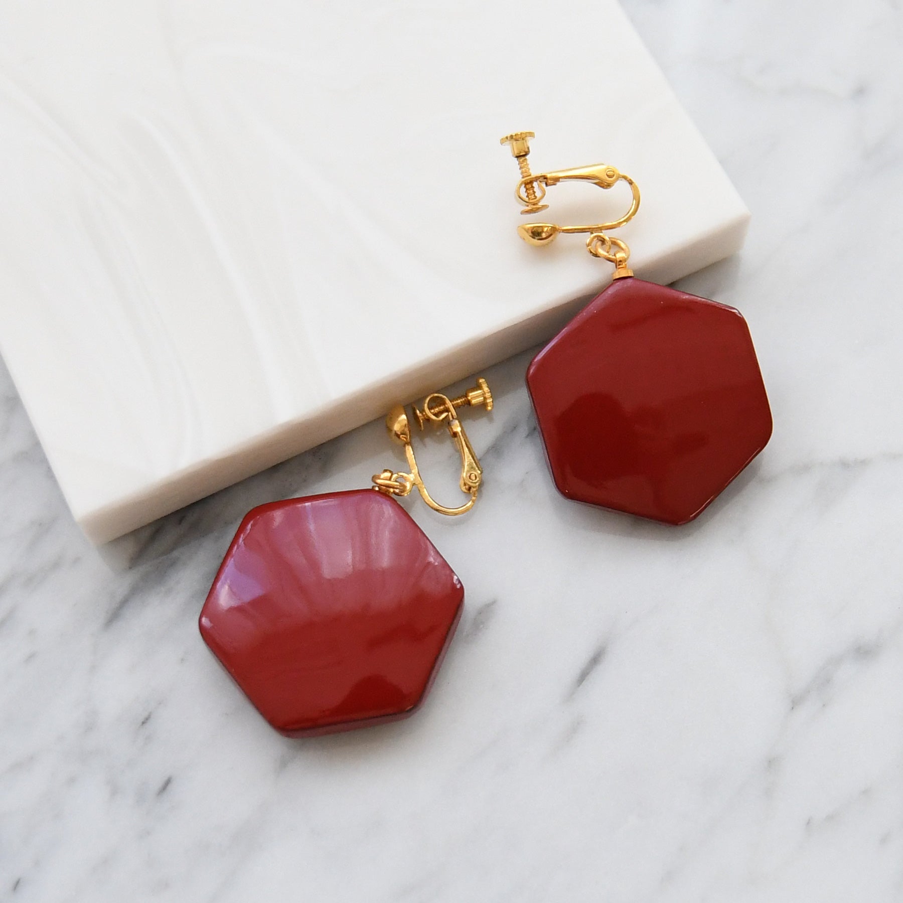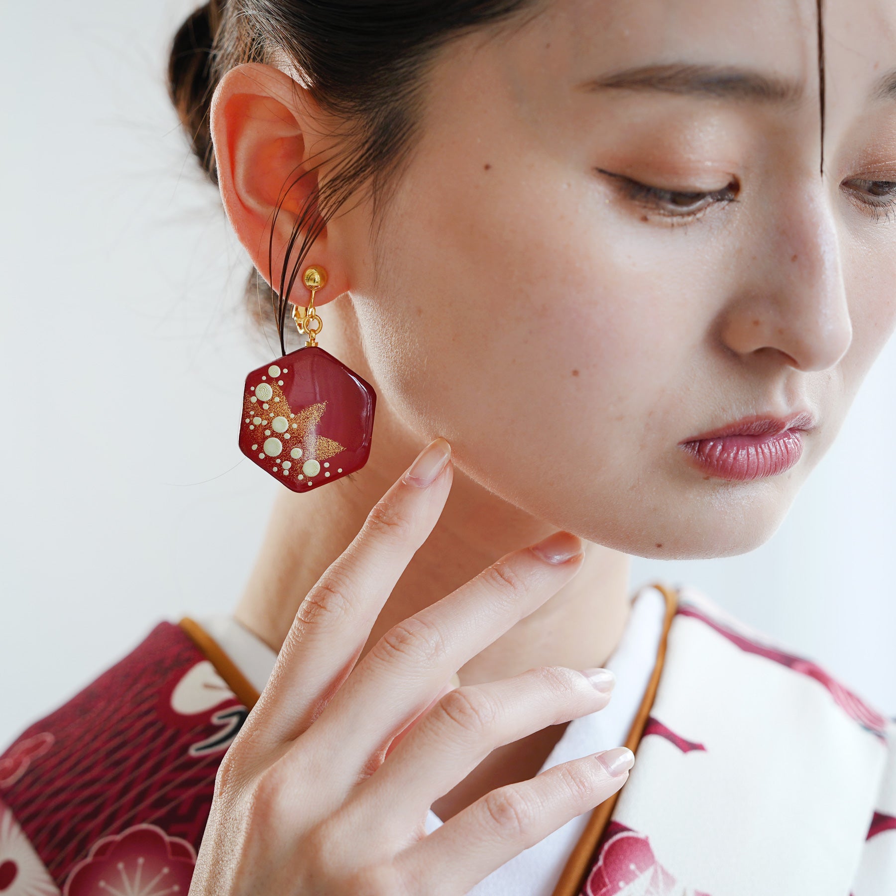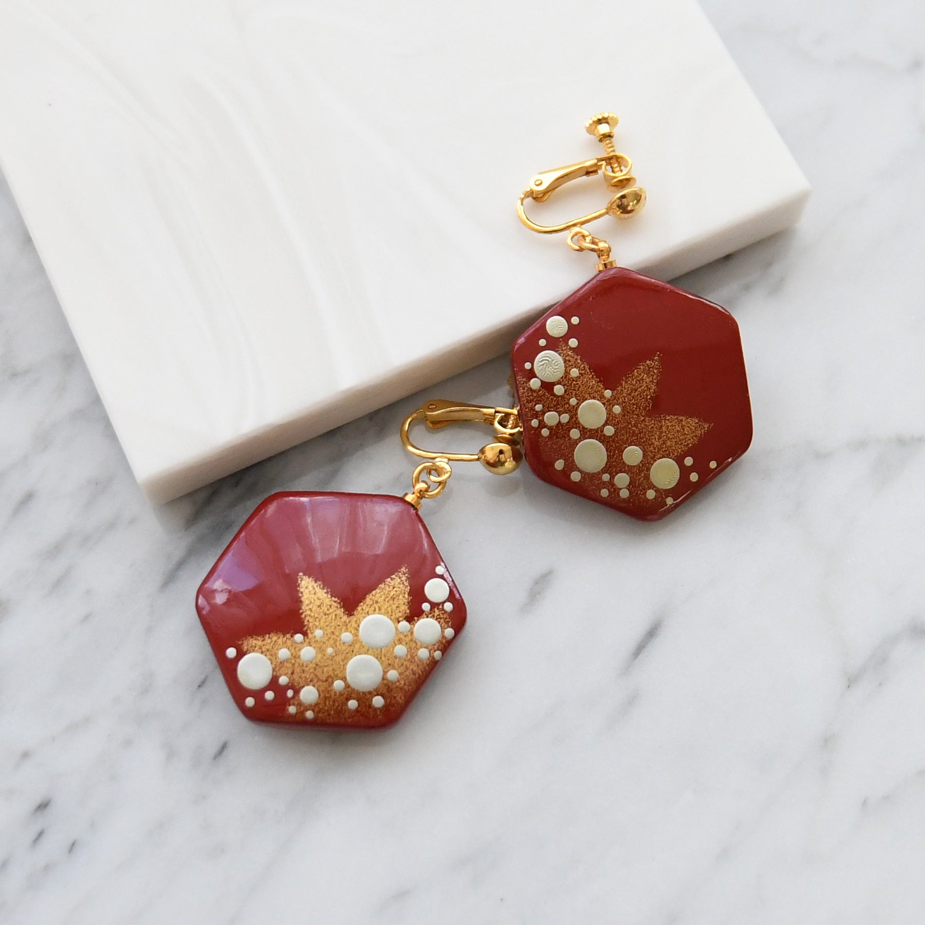 深みのある紅色に、金箔の輝きを添えたイヤリング。