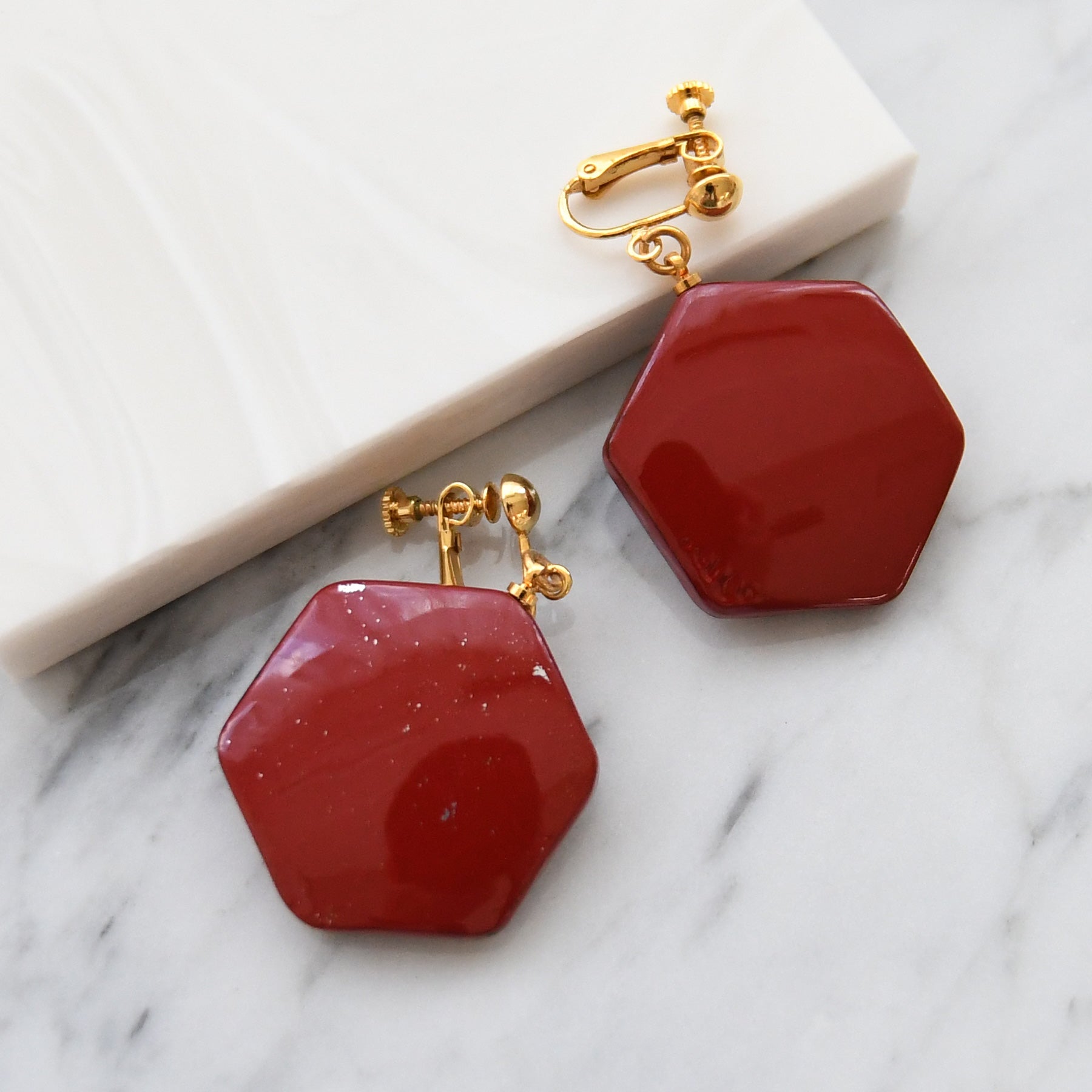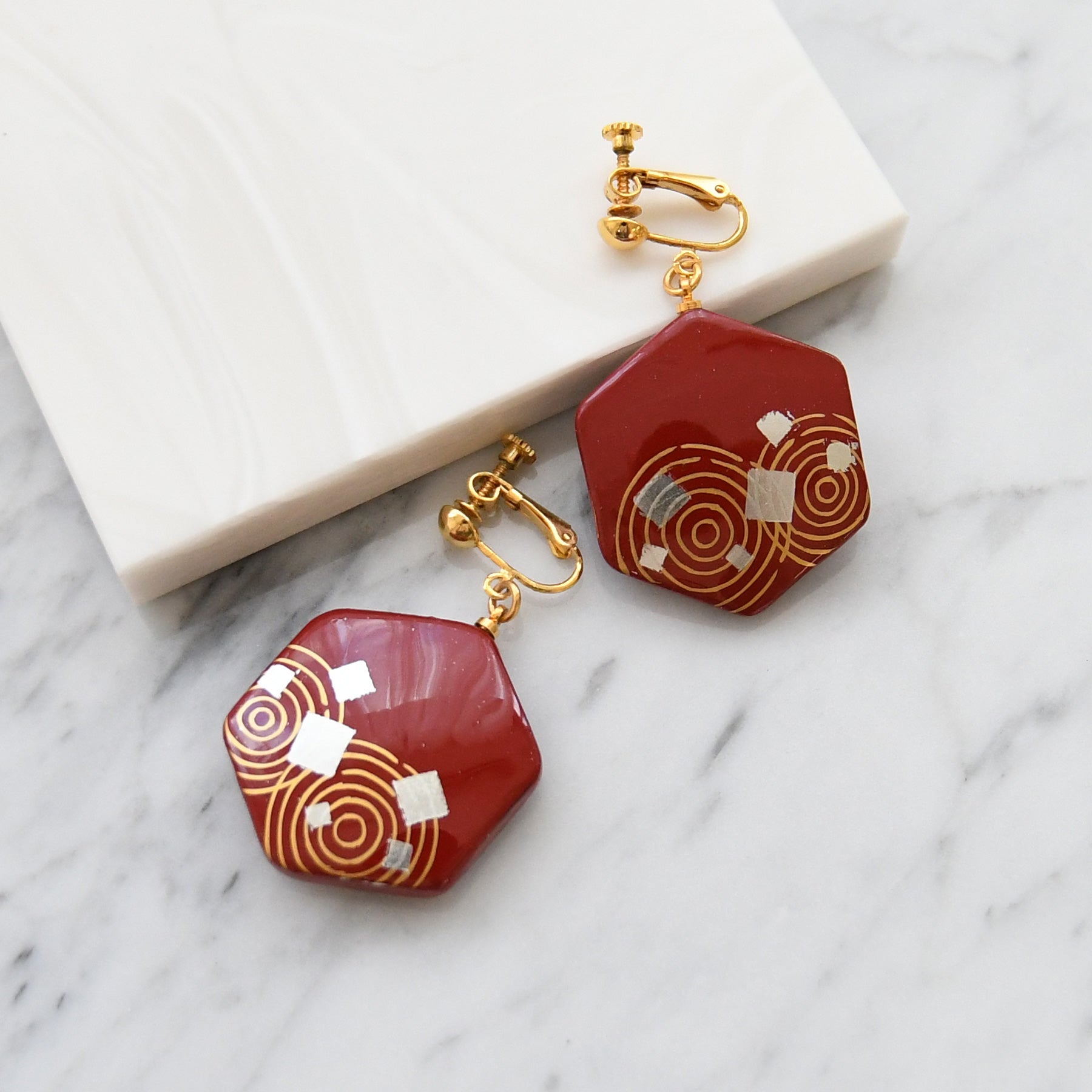 深みのある紅色に、金箔の輝きを添えたイヤリング。