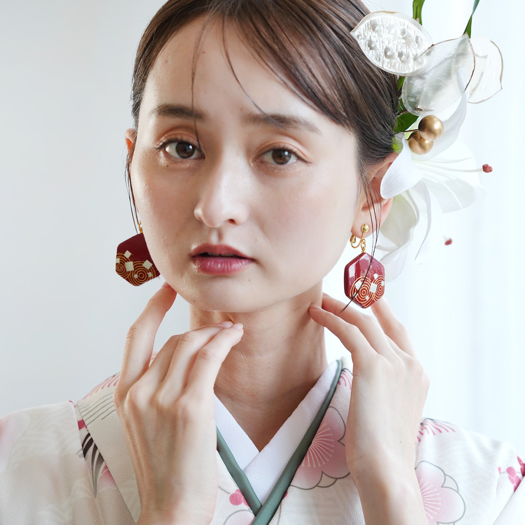まるで和の美を閉じ込めたような優雅なデザインが、顔まわりを華やかに彩ります。