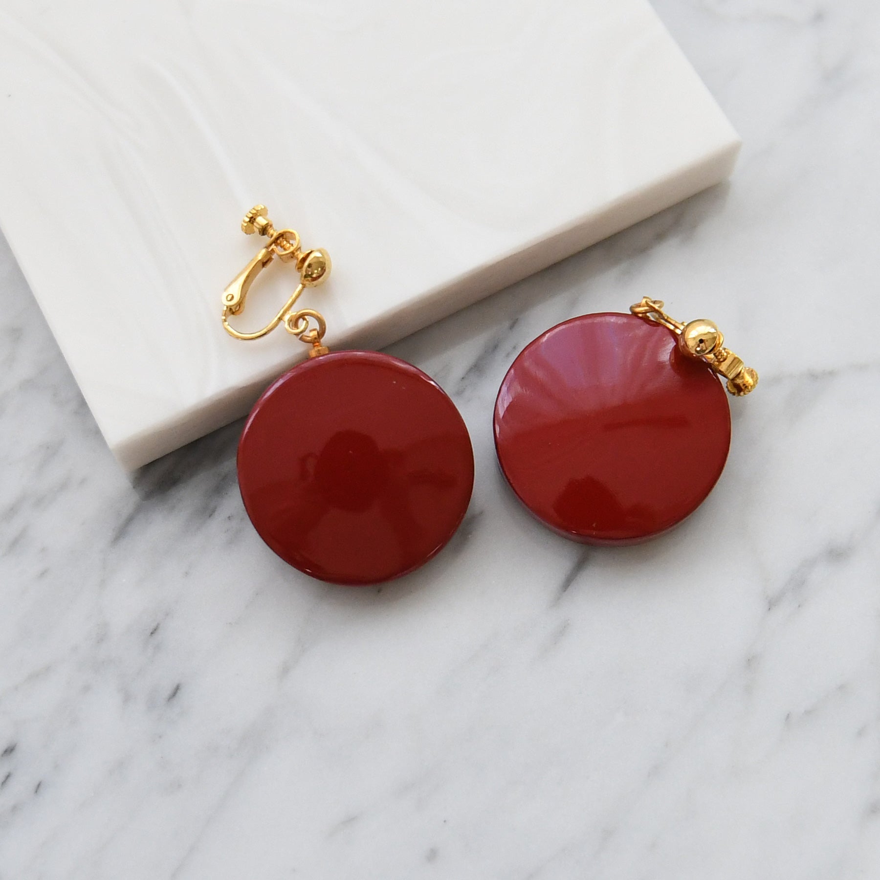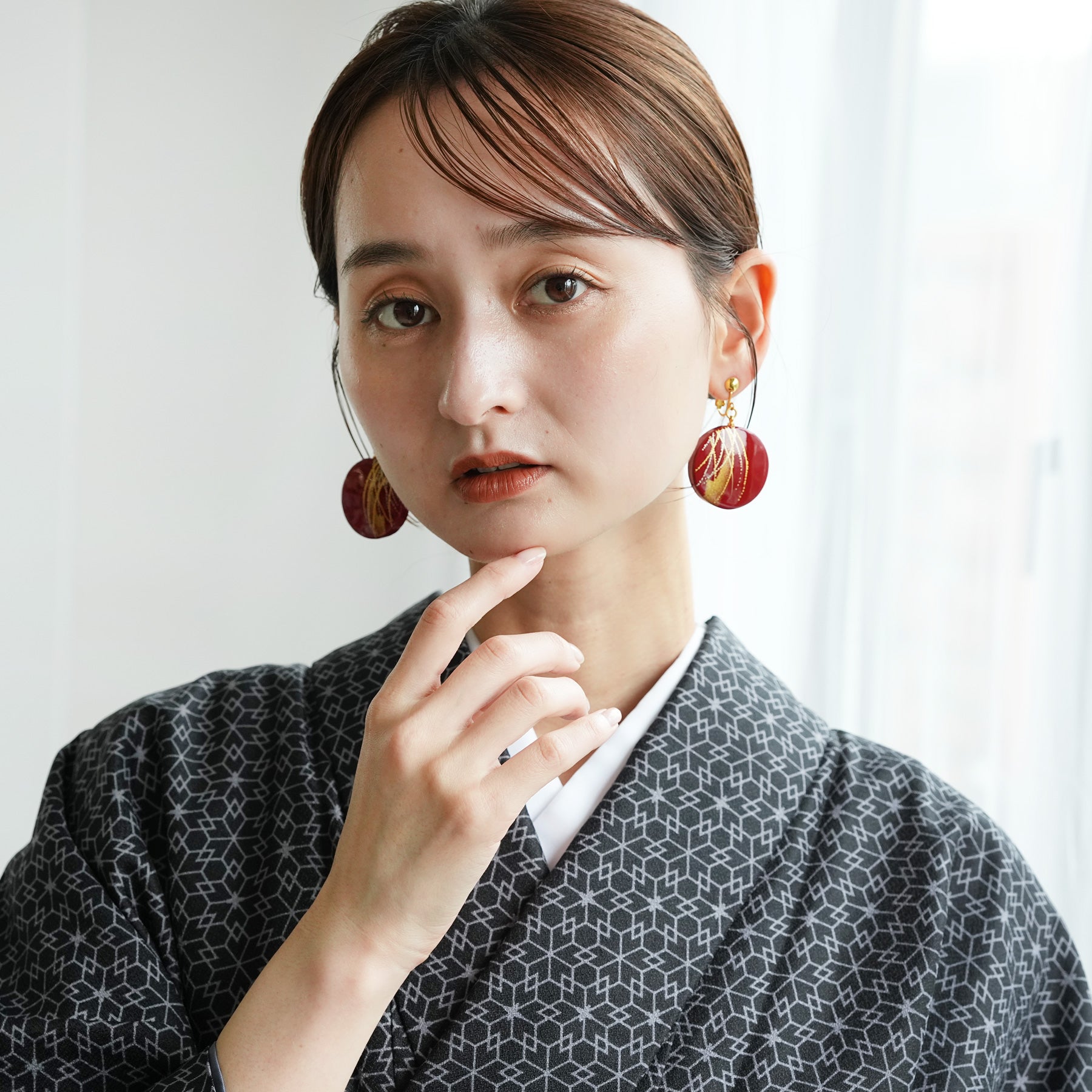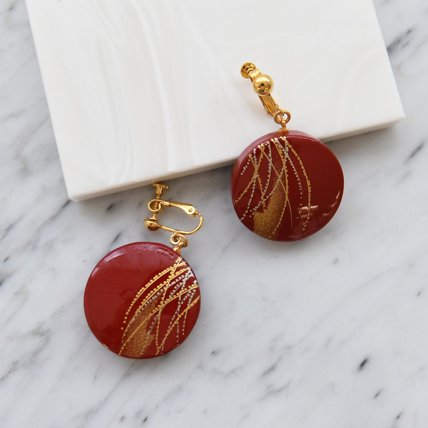 深みのある紅色に、金箔の輝きを添えたイヤリング。
