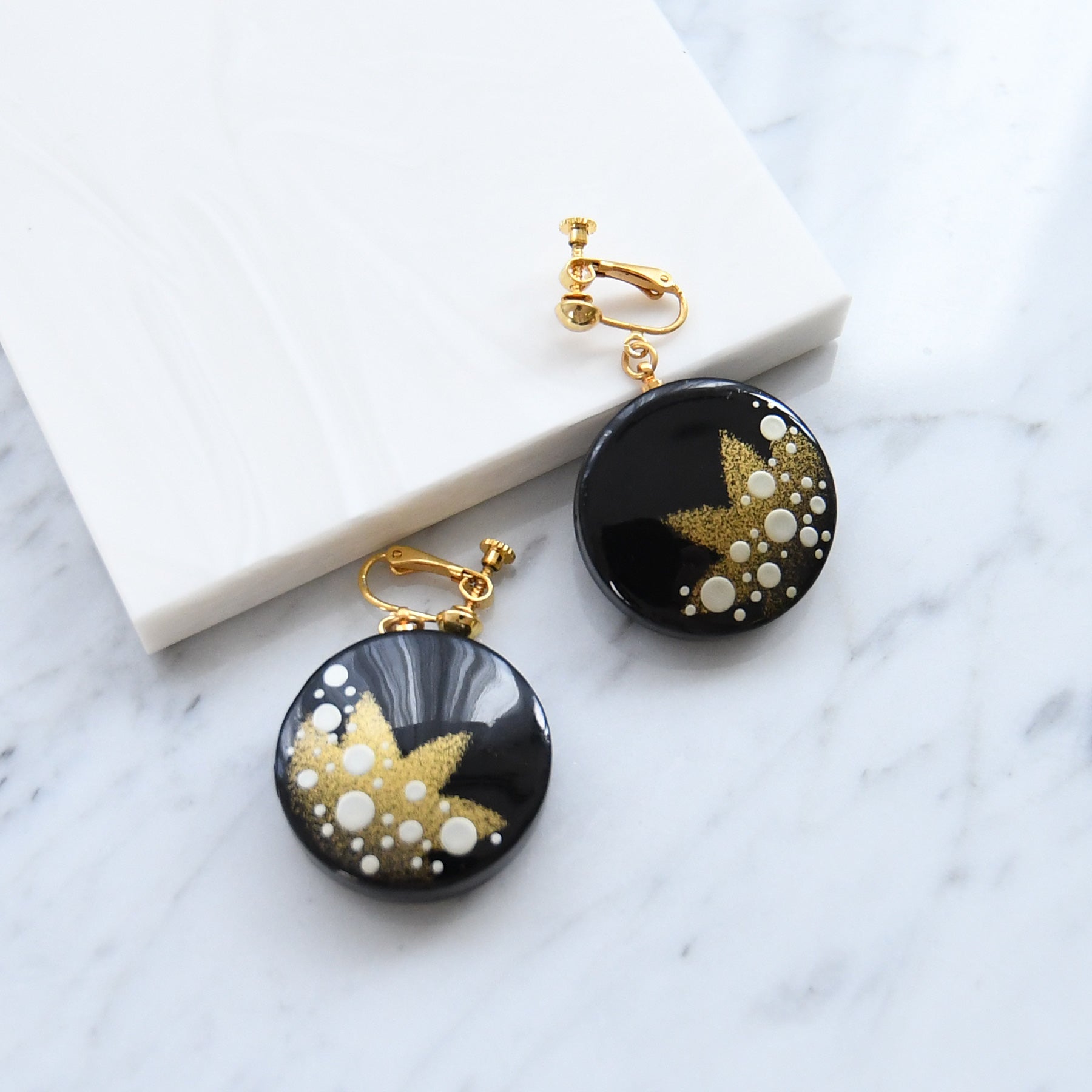 イヤリング 蒔絵 紅葉・黒 丸型 ネジバネ式 大ぶり 和風 日本製(2503617200)