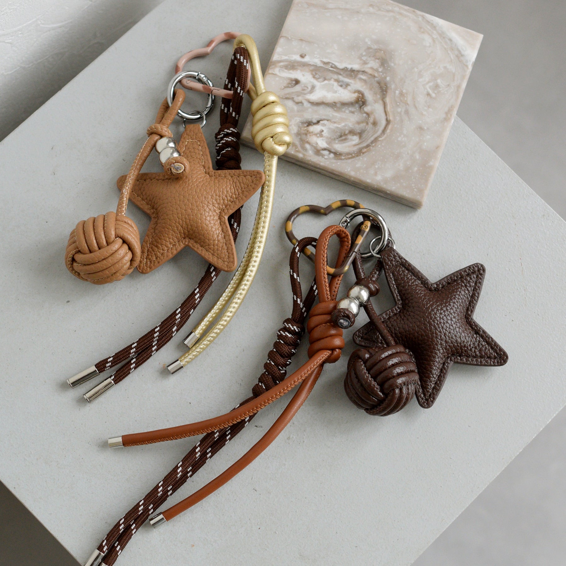 レザー調の紐やパラコードのチャームがセットになっています。