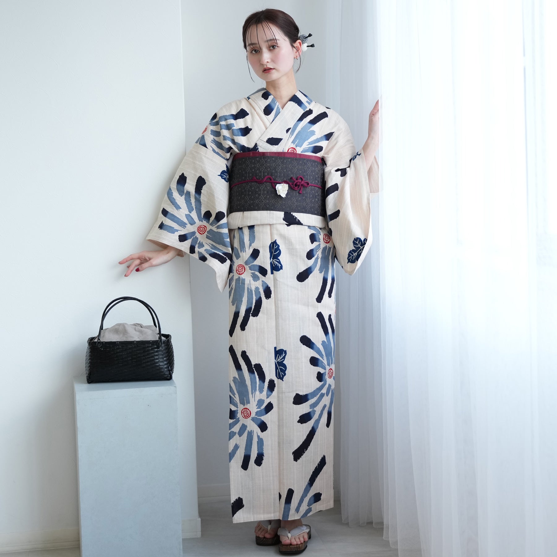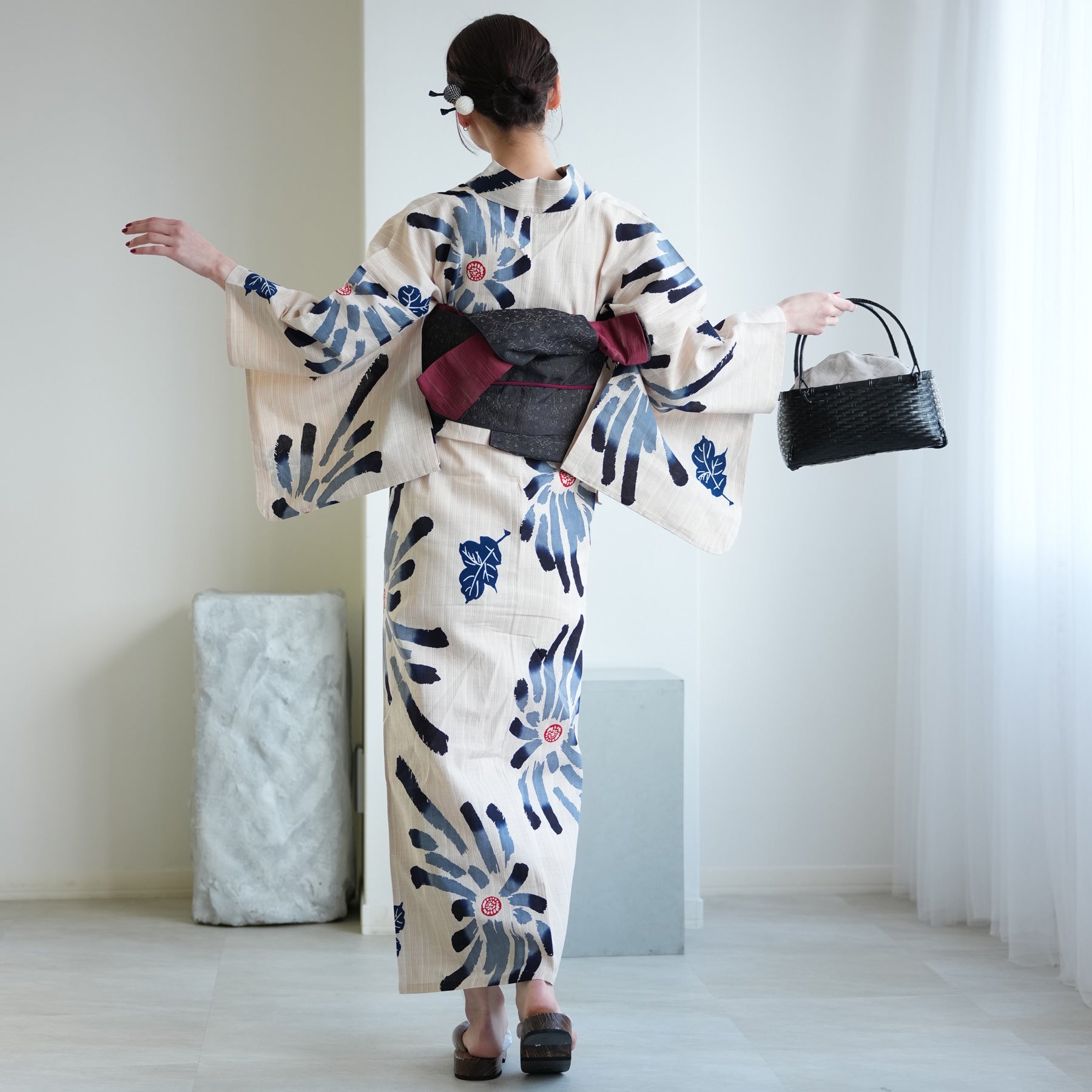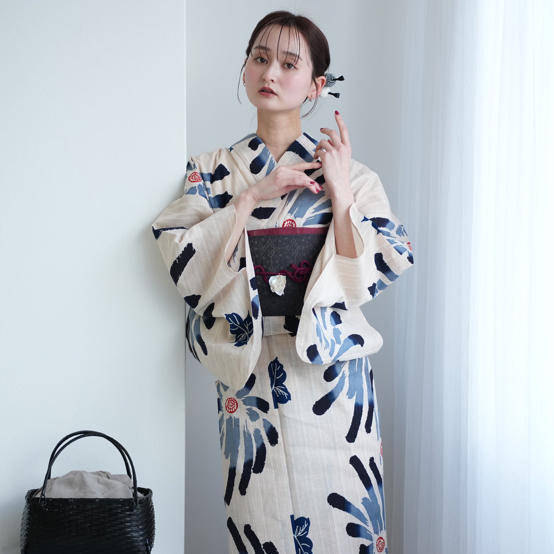 〇バッグ: モデル着用のような黒系のカゴバッグを合わせると、都会的で洗練された「大人のゆかたスタイル」が完成します。