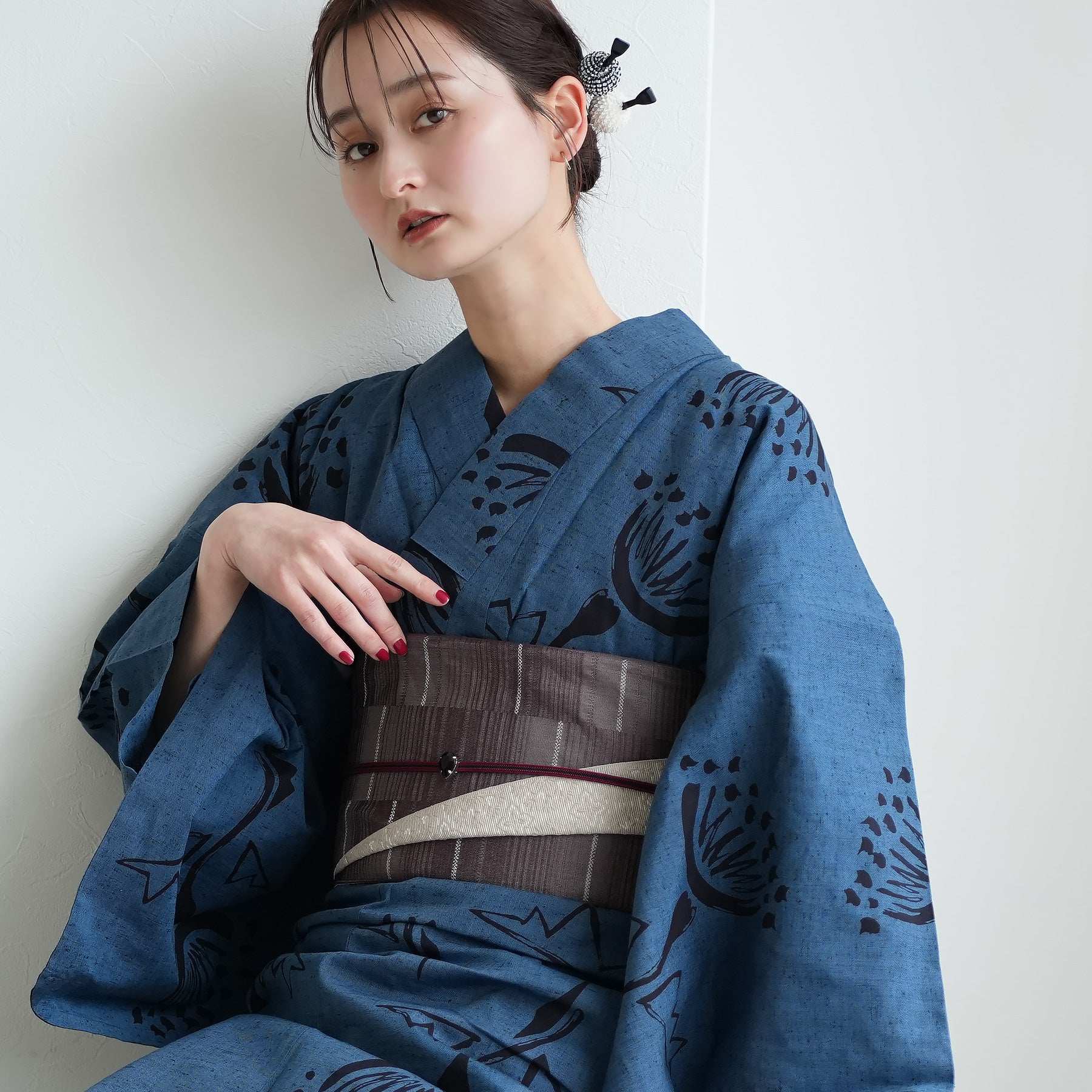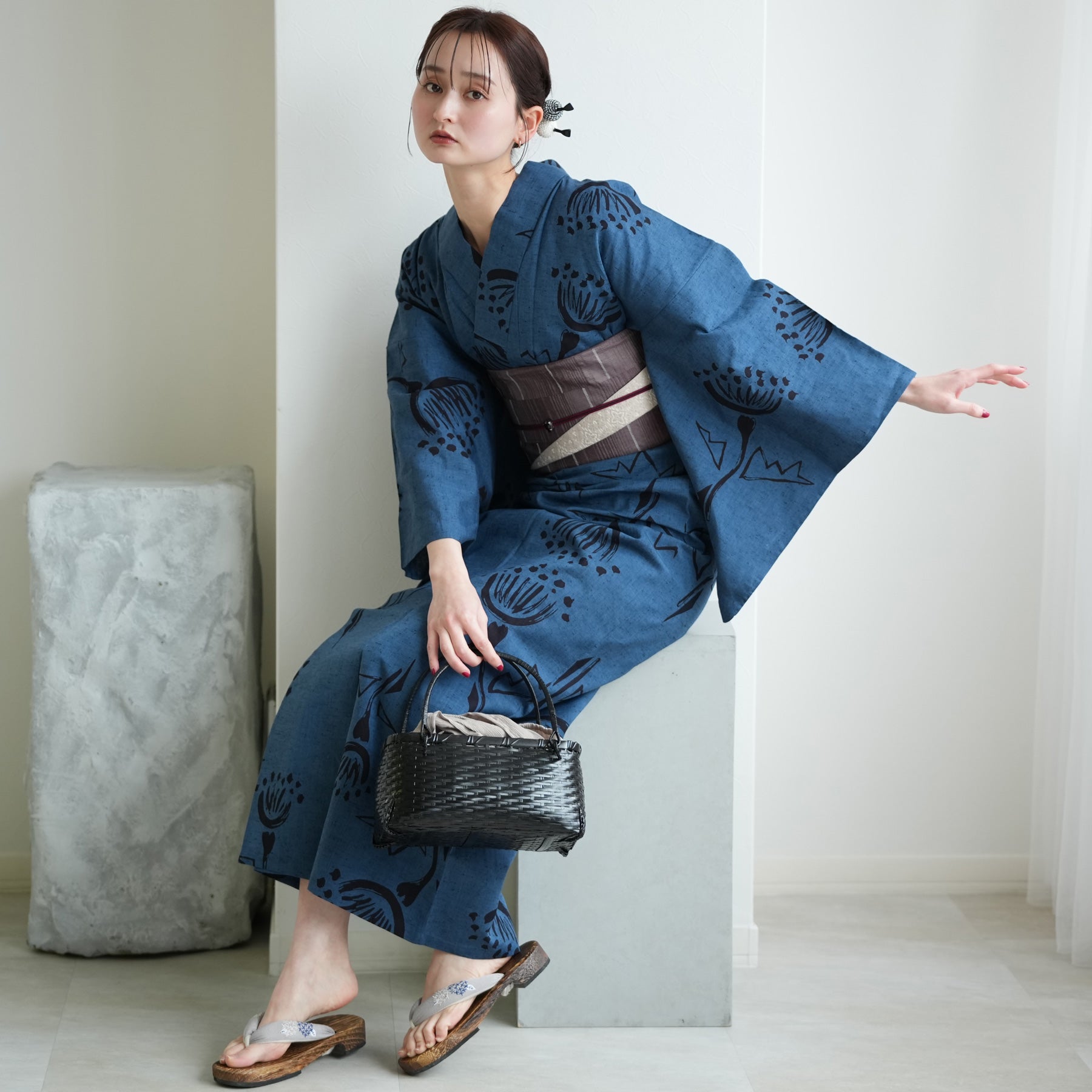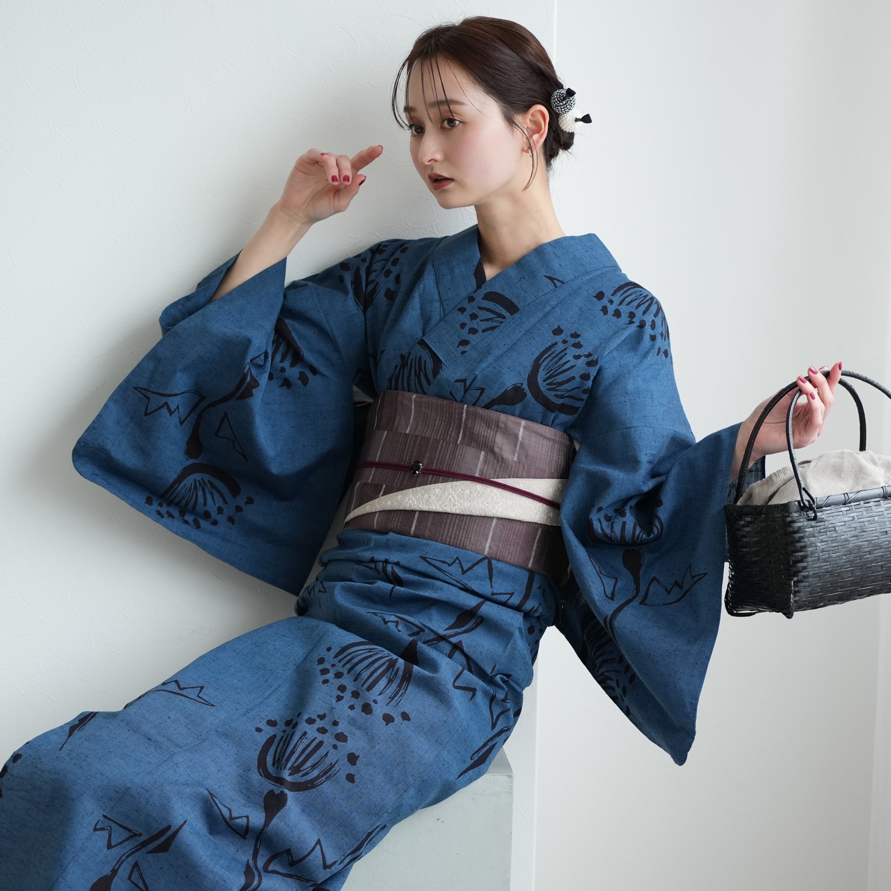浴衣の深い青を主役に、「質感の対比」を楽しむのがお洒落。