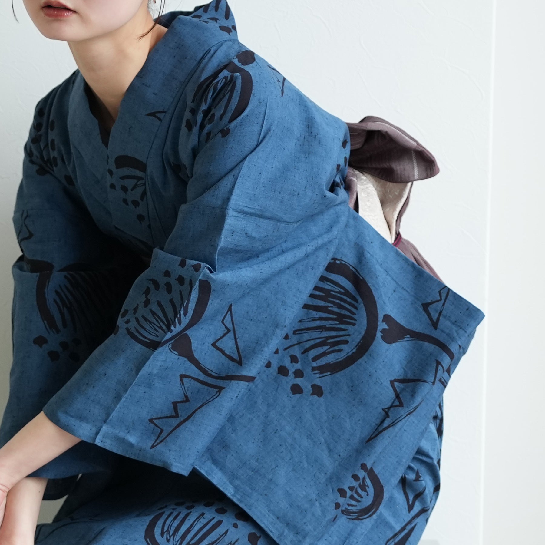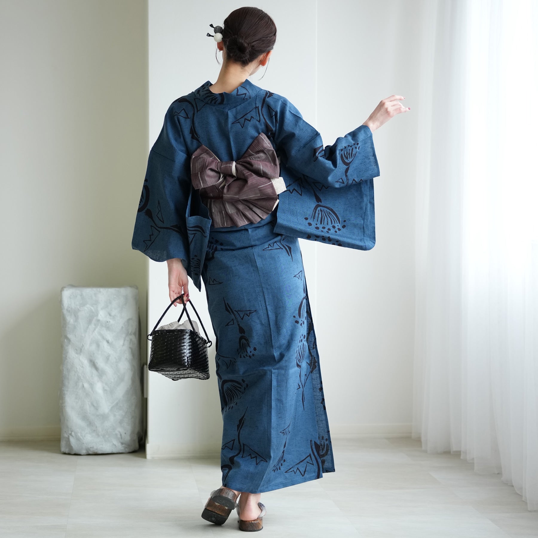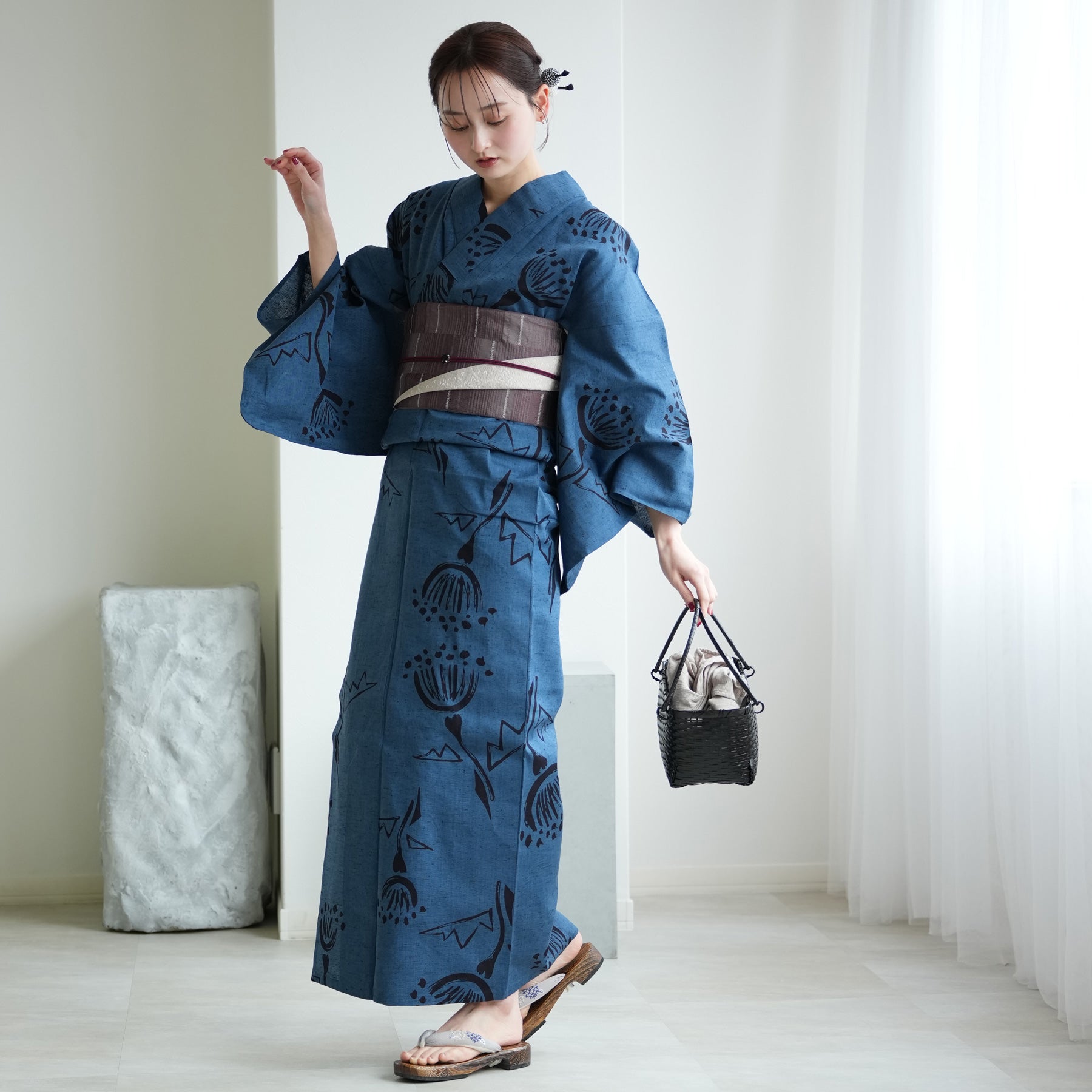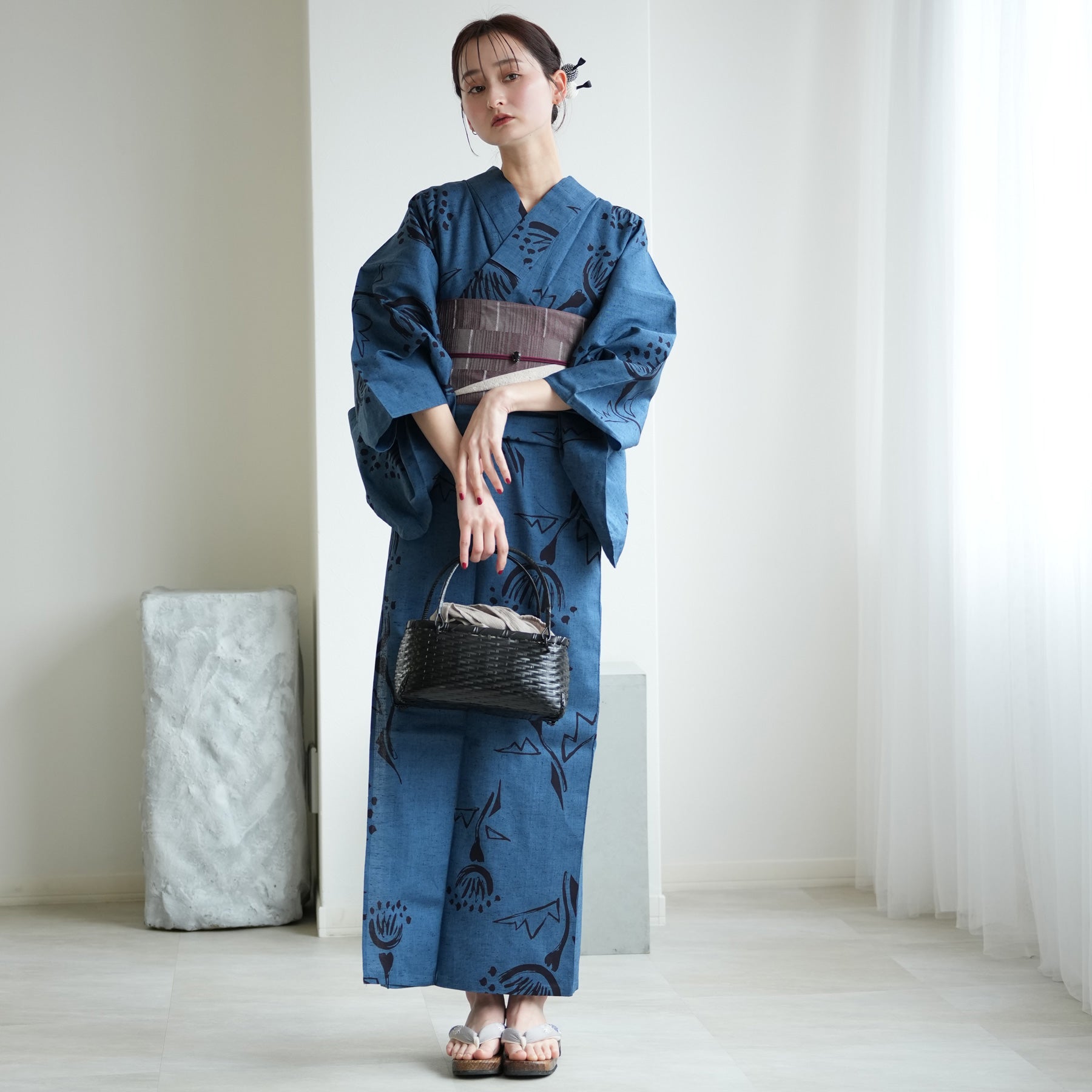 浴衣の深い青を主役に、「質感の対比」を楽しむのがお洒落。