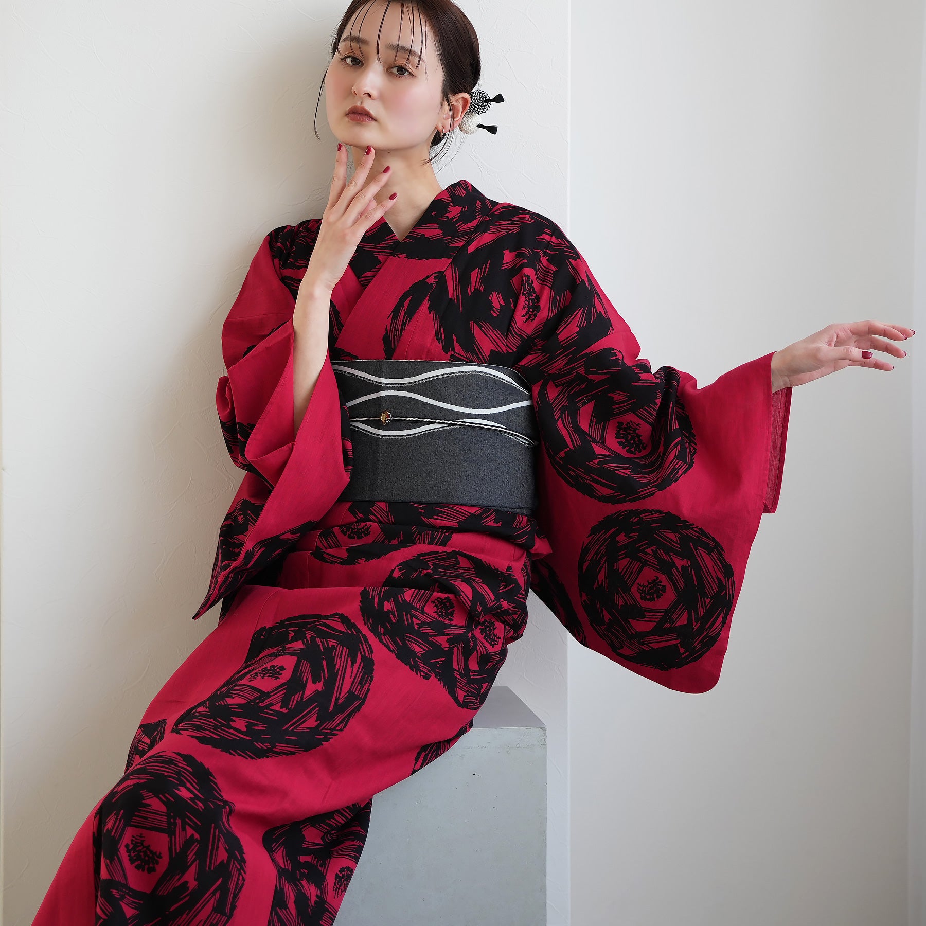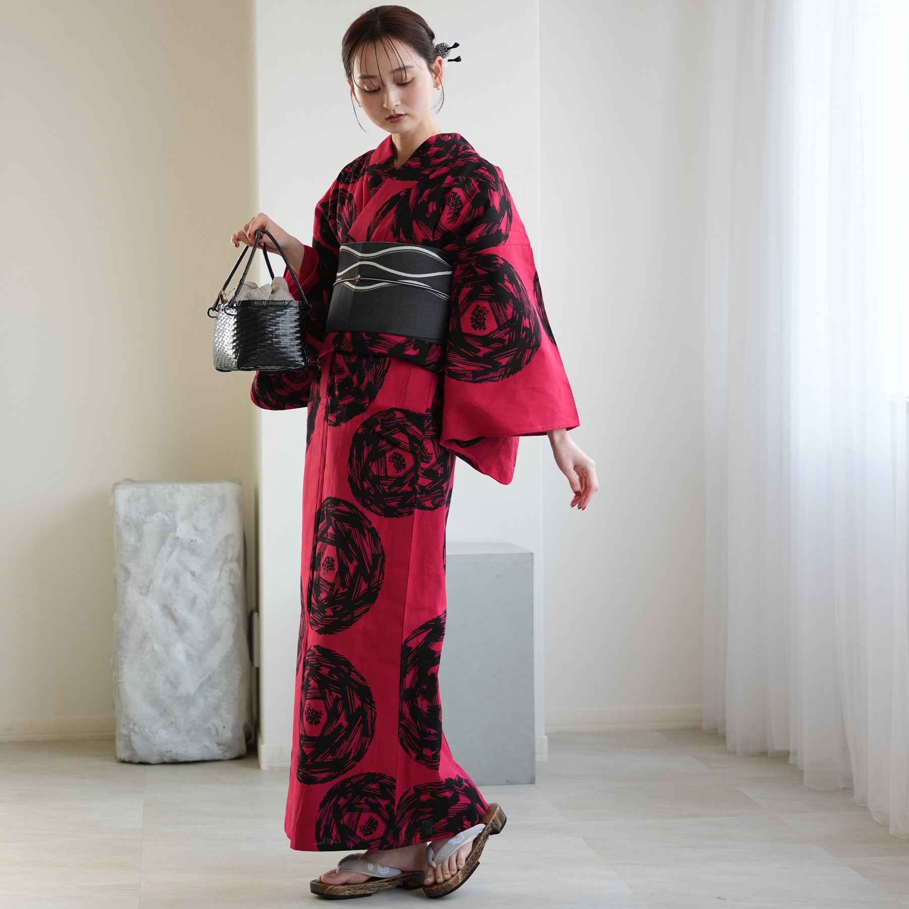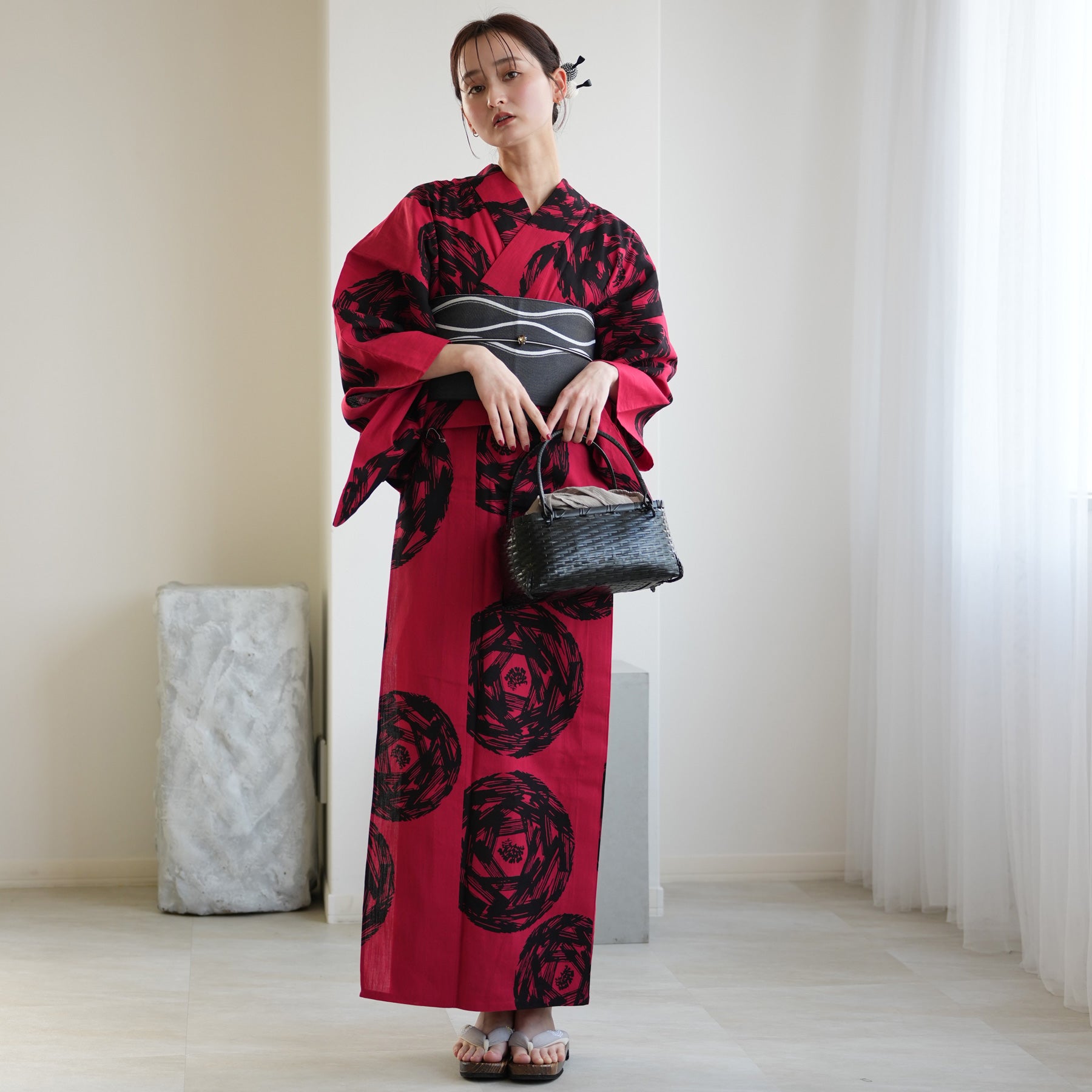 浴衣の「赤」と「黒」を活かし、モノトーンで引き締めるのが洗練のコツ。
